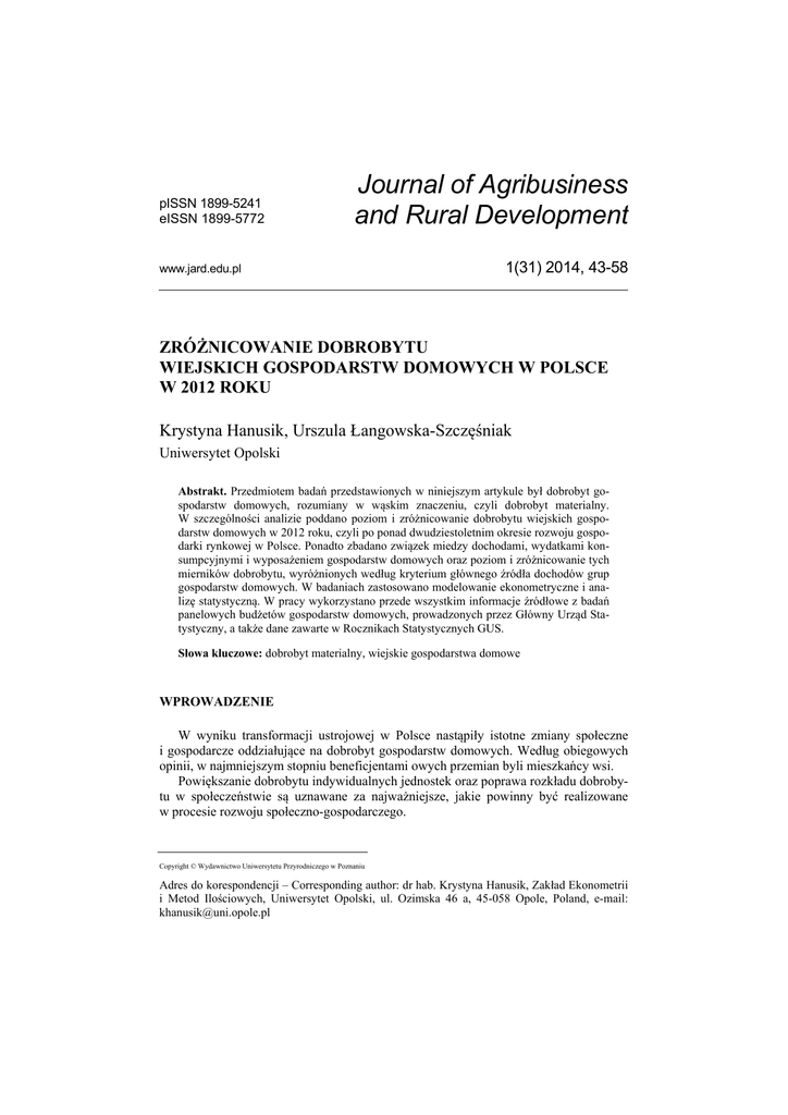 pISSN 1899-5241 eISSN 1899-5772 Journal of Agribusiness and Rural Development www.jard.edu.pl 1(31) 2014, 43-58 ZRÓŻNICOWANIE DOBROBYTU WIEJSKICH GOSPODARSTW DOMOWYCH W POLSCE W 2012 ROKU Krystyna Hanusik, Urszula Łangowska-Szczęśniak Uniwersytet Opolski Abstrakt. Przedmiotem badań przedstawionych w niniejszym artykule był dobrobyt gospodarstw domowych, rozumiany w wąskim znaczeniu, czyli dobrobyt materialny. W szczególności analizie poddano poziom i zróżnicowanie dobrobytu wiejskich gospodarstw domowych w 2012 roku, czyli po ponad dwudziestoletnim okresie rozwoju gospodarki rynkowej w Polsce. Ponadto zbadano związek miedzy dochodami, wydatkami konsumpcyjnymi i wyposażeniem gospodarstw domowych oraz poziom i zróżnicowanie tych mierników dobrobytu, wyróżnionych według kryterium głównego źródła dochodów grup gospodarstw domowych. W badaniach zastosowano modelowanie ekonometryczne i analizę statystyczną. W pracy wykorzystano przede wszystkim informacje źródłowe z badań panelowych budżetów gospodarstw domowych, prowadzonych przez Główny Urząd Statystyczny, a także dane zawarte w Rocznikach Statystycznych GUS. Słowa kluczowe: dobrobyt materialny, wiejskie gospodarstwa domowe WPROWADZENIE W wyniku transformacji ustrojowej w Polsce nastąpiły istotne zmiany społeczne i gospodarcze oddziałujące na dobrobyt gospodarstw domowych. Według obiegowych opinii, w najmniejszym stopniu beneficjentami owych przemian byli mieszkańcy wsi. Powiększanie dobrobytu indywidualnych jednostek oraz poprawa rozkładu dobrobytu w społeczeństwie są uznawane za najważniejsze, jakie powinny być realizowane w procesie rozwoju społeczno-gospodarczego. Copyright © Wydawnictwo Uniwersytetu Przyrodniczego w Poznaniu Adres do korespondencji – Corresponding author: dr hab. Krystyna Hanusik, Zakład Ekonometrii i Metod Ilościowych, Uniwersytet Opolski, ul. Ozimska 46 a, 45-058 Opole, Poland, e-mail: [email protected] 44 K. Hanusik, U. Łangowska-Szczęśniak Wychodząc z powyższych przesłanek przyjęto, iż badania dobrobytu są bardzo ważne poznawczo i mogą stanowić podstawę do oceny skuteczności polityki społecznoekonomicznej w Polsce. Dobrobyt jest kategorią bardzo złożoną, którą trudno zdefiniować i jeszcze trudniej zmierzyć. Z tego względu, jako dobre, mierzalne odzwierciedlenie dobrobytu przyjmuje się szeroko rozumianą kategorię dochodu. Pełny dochód jednostki konsumującej tworzy strumień usług pochodzących od całego jej indywidualnego majątku, który składa się z: dochodu pieniężnego płacowego i pozapłacowego oraz dochodu niepieniężnego, obejmującego satysfakcję z pracy, strumień usług od majątku rzeczowego, wartość produkcji własnej i satysfakcję z korzystania z czasu wolnego [Barr 1993, s. 147-148]. Z zaprezentowanej definicji wynika, że pełny dochód stanowi podstawę całkowitych możliwości konsumpcyjnych jednostki w określonym czasie. Należy przy tym zauważyć, że pomiar całkowitego dochodu stwarza nie mniejsze trudności niż pomiar dobrobytu. Przedmiotem badań przedstawionych w niniejszym artykule był dobrobyt gospodarstw domowych, rozumiany w wąskim znaczeniu, czyli dobrobyt materialny. Interesujące wydało się ustalenie poziomu i zróżnicowania dobrobytu wiejskich gospodarstw domowych w 2012 roku, czyli po ponad dwudziestoletnim okresie rozwoju gospodarki rynkowej w Polsce. Jako podstawę przeprowadzonych badań i analiz przyjęto następujące tezy: – bieżące dochody gospodarstw domowych są podstawową determinantą ich dobrobytu, poprzez wpływ w długim okresie na całkowite możliwości konsumpcyjne; można zatem stosować tę zmienną jako jeden z ważniejszych mierników dobrobytu, – dobrobyt gospodarstw domowych w dużej mierze określają: poziom wydatków konsumpcyjnych oraz posiadane zasoby dóbr trwałego użytku, – charakterystyki gospodarstwa domowego, a w szczególności źródła ich dochodów, różnicują dobrobyt tych jednostek konsumpcyjnych, zwłaszcza takie jego mierzalne przejawy, jak dochody, wydatki konsumpcyjne i zasoby dóbr trwałego użytku. W badaniach zastosowano modelowanie ekonometryczne i analizę statystyczną. W pracy wykorzystano przede wszystkim informacje źródłowe z badań panelowych budżetów gospodarstw domowych, prowadzonych przez Główny Urząd Statystyczny, jak również dane zawarte w rocznikach statystycznych GUS. PRZEMIANY STRUKTURY SPOŁECZNO-EKONOMICZNEJ NA WSI W POLSCE W LATACH 1993-2012 Na podstawie badań demograficznych, społecznych i ekonomicznych charakterystyk ludności w latach 1993-2012 stwierdzono, że w Polsce, zwłaszcza na wsi, miały miejsce istotne zmiany struktury gospodarstw domowych [Hanusik i Łangowska-Szczęśniak 2009]. Przebieg zmian struktury społeczno-ekonomicznej gospodarstw na wsi w analizowanym przedstawiono w tabeli 1. Na wsi najbardziej widoczny był bardzo duży spadek udziału gospodarstw rolników, z 22,7% do 11,4%. W tym okresie nastąpił natomiast wzrost udziału gospodarstw pracowników, z 26,2% do 46% oraz emerytów i rencistów, Journal of Agribusiness and Rural Development 45 Zróżnicowanie dobrobytu wiejskich gospodarstw domowych w Polsce w 2012 roku Tabela 1. Zmiany struktury gospodarstw domowych na wsi w Polsce w latach 1993-2012 według typów społeczno-ekonomicznych Table 1. Changes in the structure of rural households in Poland in 1993-2012 according to the socio-economic types Gospodarstwa domowe Households Udziały procentowe w latach – Percentages in years 1993 2004 2005 2006 2007 2008 2009 2010 2011 2012 Pracowników Employees 26,18 24,40 40,09 41,89 44,61 47,00 46,25 46,40 46,74 46,00 Rolników Farmers 22,77 10,78 14,58 13,89 13,05 12,38 12,21 11,57 11,40 11,42 Pracowników użytkujących 16,11 gospodarstwo rolne Employed on farms1 19,45 Osób pracujących na własny rachunek Self employed * * * * * * * * 3,11 4,54 4,57 5,05 5,20 5,85 6,10 6,19 6,24 6,57 Emerytów i rencistów Retir