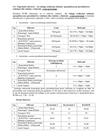Dot. Zapytanie ofertowe – na usługę realizacji zadania: specjalistyczne poradnictwo rodzinne dla rodziny z dziećmi – typu prawnego Dyrektor PCPR informuje, że w zakresie zadania na usługę realizacji zadania: specjalistyczne poradnictwo rodzinne dla rodziny z dziećmi – typu prawnego w terminie określonym w ogłoszeniu wpłynęło 5 ofert , które uzyskały następującą ilość punktów: 1. Kryterium – cena za realizację zamówienia Lp. 1 2 3 4 5 Oferent „Kancelaria Radcy Prawnego” Anna Pełech Grzegorz Wal Kancelaria prawna „IUSTITIA” radca prawny Barbara Lechoszest Kancelaria Radcy prawnego Marta Dubel – Uluszczak Jacek Szpara Cena Ilość pkt 70zł/godz. 28,5/70 x 70pkt = 28,50pkt 28,50zł/godz. 28,50/28,5 x 70pkt= 70pkt 69zł/godz. 28,50/69 x 70pkt = 28,41pkt 43zł/godz. 28,5/43 x 70pkt = 46,40pkt 70zł/godz. 28,5/70 x 70pkt = 28,50pkt 2. kryterium „ocena przedstawionej koncepcji” Lp. 1 2 3 4 Oferent „Kancelaria Radcy Prawnego” Anna Pełech Grzegorz Wal Kancelaria prawna „IUSTITIA” radca prawny Barbara Lechoszest Kancelaria Radcy prawnego Marta Dubel – Uluszczak Pozycja na liście rankingowej Ilość pkt 3 1/3 x 30pkt = 10pkt Koncepcja odrzucona* 0 4 1/4 x 30pkt = 7,5pkt 1 1/1 x 30pkt = 30pkt 5 Jacek Szpara 2 1/2 x 30pkt = 15pkt komisja odrzuciła koncepcję pracy przedstawioną przez oferenta ze względu na fakt, że przewiduje ona wyłącznie pracę po godzinie 15:30 oraz w dni ustawowo wolne od pracy. Jest to nie do przyjęcia ponieważ usługa co do zasady wykonywana winna być w godzinach pracy PCPR-u tj. 7:30 – 15:30. * Ocena zbiorcza Lp. 1 2 3 4 5 Oferent „Kancelaria Radcy Prawnego” Anna Pełech Grzegorz Wal Kancelaria prawna „IUSTITIA” radca prawny Barbara Lechoszest Kancelaria Radcy prawnego Marta Dubel – Uluszczak Jacek Szpara Kryterium 1 Kryterium 2 RAZEM 28,50 10 38,50 70 0 70 28,41 7,5 35,91 46,40 30 76,40 28,50 15 43,50 W wyniku postępowania do zawarcia umowy zakwalifikowana została oferta Kancelarii Radcy Prawnego Marta Dubel-Uluszczak, która uzyskała najwyższą liczbę punktów tj. 76,40 (na 100 możliwych). DYREKTOR Powiatowego Centrum Pomocy Rodzinie w Sanoku Jan Paszkiewicz