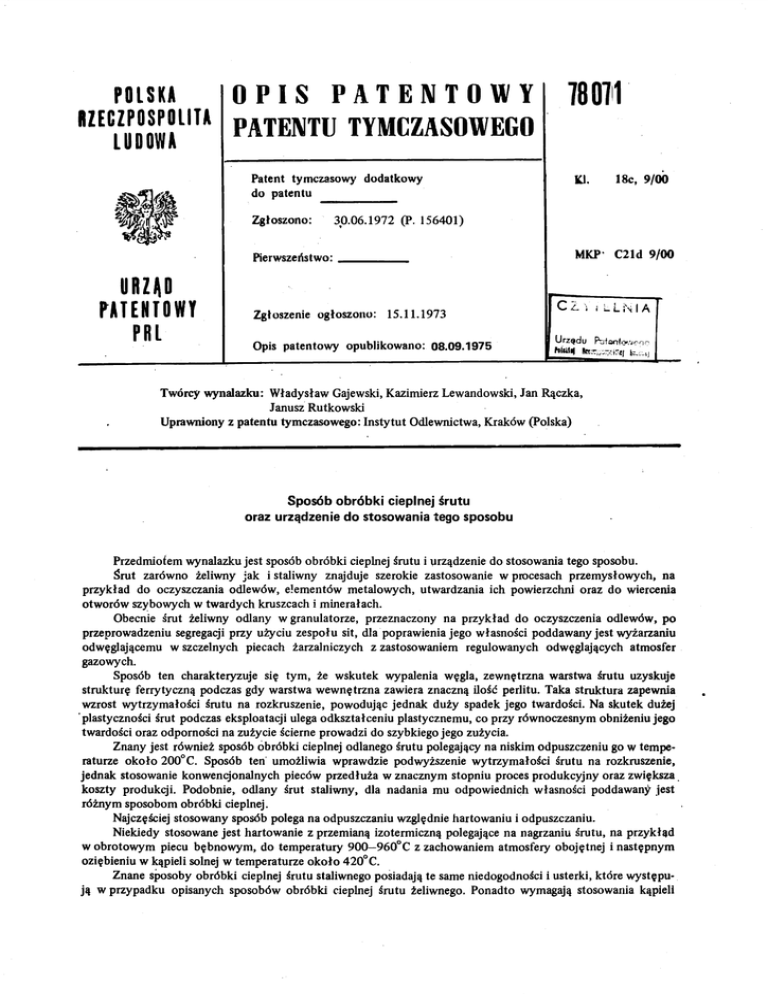 POLSKA OPIS RZECZPOSPOLITA LUDOWA PATENTOWY PATENTU TYMCZASOWEGO Patent tymczasowy dodatkowy KI. 18c, 9/00 MKP C21d 9/00 do patentu Zgłoszono: 30.06.1972 (P. 156401) Pierwszeństwo: URZĄD PATENTOWY PRL Zgłoszenie ogłoszono: 15.11.1973 Opis patentowy opublikowano: 08.09.1975 CZ V i lLNIA Urzędu Patanł<*'jr-rjn Twórcy wynalazku: Władysław Gajewski, Kazimierz Lewandowski, Jan Rączka, Janusz Rutkowski Uprawniony z patentu tymczasowego: Instytut Odlewnictwa, Kraków (Polska) Sposób obróbki cieplnej śrutu oraz urządzenie do stosowania tego sposobu Przedmiotem wynalazku jest sposób obróbki cieplnej śrutu i urządzenie do stosowania tego sposobu. Śrut zarówno żeliwny jak i staliwny znajduje szerokie zastosowanie w procesach przemysłowych, na przykład do oczyszczania odlewów, elementów metalowych, utwardzania ich powierzchni oraz do wiercenia otworów szybowych w twardych kruszcach i minerałach. Obecnie śrut żeliwny odlany w granulatorze, przeznaczony na przykład do oczyszczenia odlewów, po przeprowadzeniu segregaqi przy użyciu zespołu sit, dla poprawienia jego własności poddawany jest wyżarzaniu odwęglającemu w szczelnych piecach żarzalniczych z zastosowaniem regulowanych odwęglających atmosfer gazowych. Sposób ten charakteryzuje się tym, że wskutek wypalenia węgla, zewnętrzna warstwa śrutu uzyskuje strukturę ferrytyczną podczas gdy warstwa wewnętrzna zawiera znaczną ilość perlitu. Taka struktura zapewnia wzrost wytrzymałości śrutu na rozkruszenie, powodując jednak duży spadek jego twardości. Na skutek dużej plastyczności śrut podczas eksploatacji ulega odkształceniu plastycznemu, co przy równoczesnym obniżeniu jego twardości oraz odporności na zużycie ścierne prowadzi do szybkiego jego zużycia. Znany jest również sposób obróbki cieplnej odlanego śrutu polegający na niskim odpuszczeniu go w tempe¬ raturze około 200°C. Sposób ten umożliwia wprawdzie podwyższenie wytrzymałości śrutu na rozkruszenie, jednak stosowanie konwencjonalnych pieców przedłuża w znacznym stopniu proces produkcyjny oraz zwiększa koszty produkcji. Podobnie, odlany śrut staliwny, dla nadania mu odpowiednich własności poddawany jest różnym sposobom obróbki cieplnej. Najczęściej stosowany sposób polega na odpuszczaniu względnie hartowaniu i odpuszczaniu. Niekiedy stosowane jest hartowanie z przemianą izotermiczną polegające na nagrzaniu śrutu, na przykład w obrotowym piecu bębnowym, do temperatury 900-960°C z zachowaniem atmosfery obojętnej i następnym oziębieniu w kąpieli solnej w temperaturze około 420°C. Znane sposoby obróbki cieplnej śrutu staliwnego posiadają te same niedogodności i usterki, które występu¬ ją w przypadku opisanych sposobów obróbki cieplnej śrutu żeliwnego. Ponadto wymagają stosowania kąpieli 78 071 2 solnej bądź olejowej, determinując ciągłość produkcji i stabilność właściwości śrutu. Występują przy tym duże ubytki stosowanych ośrodków chłodzących oraz zagrożenie spowodowane możliwością wybuchu przy stosowa¬ niu kąpieli azotanowej. Używane dotychczas piece do obróbki cieplnej śrutu posiadają duże wymiary gabarytowe, a w stosunku do zajmowanej powierzchni charakteryzują się małą wydajnością produkcyjną, poza tym wymagają częstych remontów. Obecnie znane i stosowane sposoby obróbki cieplnej śrutu, jak również służące do tego celu urządzenia nie zapewniają uzyskania optymalnych, stabilnych własności poszczególnych partii śrutu, a nawet poszczególnych jego ziarn. * Celem wynalazku jest usunięcie wyżej wymienionych usterek i niedogodności. Cel ten został osiągnięty przez opracowanie sposobu obróbki cieplnej śrutu lanego oraz urządzenia do stosowania tego sposobu zezwalającego na wytwarzanie śrutu lanego zarówno żeliwnego jak i staliwnego o pod¬ wyższonych własnościach wytrzymałościowych, a zwłaszcza wytrzymałości na rozkruszanie i odporności na zużycie ścierne. Według wynalazku, obróbka cieplna śrutu polega na sfluidyzowaniu go spalinami, powstałymi ze spalenia gazu, które są równocześnie źródłem ciepła potrzebnego do ogrzania śrutu do temperatury umożliwiającej jego austenityzację w temperaturze 850° do 1050°C oraz stanowią atmosferę ochronną dla obrabianego śrutu. Obróbkę cieplną śrutu sposobem według wynalazku przeprowadza się w piecu fluidalnym, którego kon¬ strukcja zapewnia intensywną wymianę cieplną pomiędzy gorącymi spalinami, a śrutem stanowiącym w tym przypadku złoże fluidalne. Ponadto urządzenie według wynalazku umożliwia odzysk ciepła spalin i wykorzysta¬ nie go w mieszalnikowym wymienniku ciepła, dla wytworzenia mieszanki spalin z powietrzem o określonej temperaturze. Urządzenie do stosowania sposobu według wynalazku składa się z trzech komór. Poszczególne komory urządzenia połączone są kanałami przesypowymi, o wymiarach tak dobranych aby śrut przemieszczający się do poszczególnych komór zapewniał ich uszczelnienie. Kształt i wymiary kanałów przesypowych umożliwiają równocześnie doprowadzenie takiej ilości do nich śrutu, która zapewnia przeprowadzenie jego obróbki cieplnej sposobem według wynalazku. Urządzenie do stosowania sposobu według wynalazku uwidocznione zostało w przykładzie wykonania na rysunku. Urządzenie wyposażone jest w cylindryczną komorę temperatur wysokich 1 do której śrut poddawany obróbce cieplnej wprowadza się w sposób ciągły i równomierny z zasobnika 16 za pomocą podajnika ślimakowe¬ go 14. Komorą temperatur wysokich 1 wyposażona jest w stożkowe dno perforowane 3 o optymalnie dobranych średnicach otworów. W linii osi dna 3 umieszczony jest otwór wylotowy śrutu 17. Pod dnem 3 usytuowana jest komora mieszania gazów 4, do której gaz, na przykład gaz ziemny, generatorowy itp. doprowadza się króćcem 5, a sprężone powietrze pierwotne króćcem 6. W górnej części komory 1 znaj