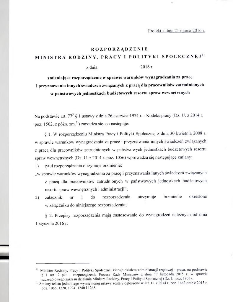 Projekt z dnia 21 marca 2016 r. ROZPORZĄDZENIE MINISTRA RODZINY, PRACY I POLITYKI z dnia S P O Ł E C Z N E J 1’ 2016 r. zm ieniające rozporządzenie w sprawie warunków w ynagradzania za pracę i przyznawania innych świadczeń związanych z pracą dla pracowników zatrudnionych w państwowych jednostkach budżetowych resortu spraw wewnętrznych N a podstawie art. 7 7 ’ § 1 ustawy z dnia 26 czerwca 1974 r. - Kodeks pracy (Dz. U. z 2014 r. poz. 1502. z późn. zm.2)) zarządza się, co następuje: § 1. W rozporządzeniu M inistra Pracy i Polityki Społecznej z dnia 30 kwietnia 2008 r. w sprawie warunków w ynagradzania za pracę i przyznawania innych świadczeń związanych z pracą dla pracowników zatrudnionych w państwowych jednostkach budżetowych resortu spraw wewnętrznych (Dz. U. z 2014 r. poz. 1056) wprowadza się następujące zmiany: 1) tytuł rozporządzenia otrzymuje brzmienie: „w sprawie warunków w ynagradzania za pracę i przyznawania innych świadczeń związanych z pracą dla pracow ników zatrudnionych w państwowych jednostkach budżetowych resortu spraw wewnętrznych i adm inistracji” ; 2) załącznik nr 1 do rozporządzenia otrzymuje brzmienie określone w załączniku do niniejszego rozporządzenia; § 2. Przepisy rozporządzenia mają zastosowanie do wynagrodzeń należnych od dnia 1 stycznia 2016 r. 11 M in ister R odzin y , P racy i P olityki S p o łeczn ej k ieru je d ziałem a d m in istra cji rząd o w ej - praca, na p o d staw ie § 1 ust. 2 pk t I ro z p o rz ąd ze n ia P rezesa R ady M in istró w z d n ia 17 listo p ad a 2015 r. w spraw ie szcze g ó ło w e g o z a k resu d zia ła n ia M in istra R o d zin y , P racy i P olityki S p o łeczn e j (D z. U. poz. 1905). 2) Z m ian y te k stu je d n o lite g o w y m ien io n ej u staw y zo stały o g ło sz o n e w D z. U. z 2 0 1 4 r. poz. 1662 o ra z z 2015 r. poz. 1066, 1220, 1224, 1240 i 1268. - 2 - § 3. Rozporządzenie wchodzi w życie z dniem następującym po dniu ogłoszenia. M INISTER RODZINY, PRACY I POLITYKI SPOŁECZNEJ ot D Y R E K TToa O 'L Prawego ■-entu PnwjAego Faoisiak ZASTĘPCĄ DYREKTORA Departamentu Prawa Pracy - 3 - Załącznik do rozporządzenia M inistra Rodziny, Pracy i Polityki Społecznej z dnia 2016 r. (poz. TABELE M IESIĘCZNYCH STAWEK W YNAGRODZENIA ZASADNICZEGO TABELA 1. TABELA M IESIĘCZNYCH STAWEK W YNAGRODZENIA ZASADNICZEGO DLA PRACOW NIKÓW ZATRUDNIONYCH W CENTRUM PERSONALIZACJI DOKUM ENTÓW M INISTERSTW A SPRAW W EW NĘTRZNYCH I ADM INISTRACJI, PAŃSTW OW EJ INSPEKCJI SANITARNEJ M INISTERSTW A SPRAW W EW NĘTRZNYCH I ADM INISTRACJI, ZARZĄDZIE ZASOBÓW M IESZKANIO W YCH M INISTERSTW A SPRAW W EW NĘTRZNYCH I ADM INISTRACJI ORAZ BIURZE OCHRONY RZĄDU Kategoria M inim alna kwota zaszeregowania w złotych I 1200 - 2320 II 1220 - 2350 III 1 2 4 0 -2 3 8 0 IV 1 2 6 0 -2 4 1 0 V 1 3 1 0 -2 4 4 0 VI 1 3 6 0 -2 5 2 0 VII 1 4 1 0 -2 6 8 0 VIII 1 4 6 0 -2 8 5 0 IX 1 5 1 0 -3 0 2 0 X 1 5 6 0 -3 2 0 0 XI 1 6 1 0 -3 3 9 0 XII 1 6 7 0 -3 6 1 0 XIII 1 7 3 0 -3 8 4 0 XIV 1 7 9 0 -4 0 8 0 XV 1 8 5 0 -4 3 2 0 XVI 1 9 5 0 -4 6 9 0 ) - 4 - XVII 2 0 6 0 -5 0 8 0 XVIII 2 1 7 0 -5 6 0 0 XIX 2 3 8 0 -6 3 6 0 XX 2 5 9 0 -7 3 0 0 XXI 2 8 1 0 -8 3 8 0 TABELA 2. TABELA M IESIĘCZNYCH STAWEK W YNAGRODZENIA ZASADNICZEGO DLA POZOSTAŁYCH PRACO W NIKÓ W ZATRUDNIONYCH W PAŃSTW OW YCH JEDNO STKACH BUDŻETOW YCH RESORTU SPRAW W EW NĘTRZNYCH I ADM INISTRACJI Kategoria M inim alna kwota zaszeregowania w złotych I 1 1 3 0 -2 3 2 0 II 1 1 4 0 -2 3 4 0 III 1 1 5 0 -2 3 6 0 IV 1 1 6 0 -2 3 9 0 V 1 1 7 0 -2 4 2 0 VI 1 1 8 0 -2 4 5 0 VII 1 1 9 0 -2 4 8 0 VIII 1 2 0 0 -2 6 4 0 IX 1 2 1 0 -2 8 0 0 X 1 2 2 0 -2 9 6 0 XI 1 2 3 0 -3 1 6 0 XII 1 2 5 0 -3 3 6 0 XIII 1 2 7 0 -3 6 0 0 XIV 1 3 1 0 -3 9 2 0 XV 1 3 6 0 -4 2 4 0 XVI 1 4 2 0 -4 7 1 0 XVII 1 4 8 0 -5 1 9 0 XVIII 1 5 8 0 - 5670 XIX 1690 - 6150 - 5 - UZASADNIENIE Rozporządzenie M inistra Pracy i Polityki Społecznej z dnia 30 kwietnia 2008 r. w sprawie warunków w ynagradzania za pracę i przyznawania innych świadczeń związanych z pracą dla pracow ników zatrudnionych w państwowych jednostkach budżetowych resortu spraw wewnętrznych (Dz. U. z 2014 r. poz. 1056), zwane dalej „rozporządzeniem ”, zostało wydane na podstawie art. 773 § 1 ustawy z dnia 26 czerwca 1974 r. - Kodeks pracy (Dz. U. z 2014 r. poz. 1502, z późn. zm.). Zgodnie z wymienionym przepisem warunki w ynagradzania za pracę i przyznawania innych świadczeń związanych z pracą dla pracowników zatrudnionych w państwowych jednostkach sfery budżetowej, jeżeli nie są oni objęci układem zbiorowym pracy, określa, w drodze rozporządzenia - w zakresie niezastrzeżonym w innych ustawach do właściwości innych organów - m inister właściwy do spraw pracy na wniosek właściwego ministra. Z wnioskiem o nowelizację rozporządzenia wystąpił M inister Spraw W ewnętrznych i Administracji. Projektowana nowelizacja rozporządzenia przewiduje: 1. Podwyższenie miesięcznych stawek wynagrodzenia zasadniczego określonych w załączniku do nowelizowanego rozporządzenia. M inister Spraw Wewnętrznych i Administracji, przedstawiając propozycję podwyższenia miesięcznych stawek wynagrodzenia zasadniczego, uzasadnił ją ujęciem w ustawie budżetowej na rok 2016 dodatkowych środków na podwyżkę wynagrodzeń pracowników resortu spraw wewnętrznych i adm inistracji od dnia 1 stycznia 2016 r. Przy opracowywaniu propozycji tabel uwzględniono wielkość dodatkowych środków na podwyżki ujętych w ustawie budżetowej na rok 2016, a także wysokość kwoty minimalnego wynagrodzenia za pracę obowiązującego od dnia 1 stycznia 2016 r. M inimalne wynagrodzenie zasadnicze w poszczególnych kategoriach zaszeregowania (lewa strona kwot określonych widelkowo) zostało ustalone w taki sposób, aby kwota podwyższenia indywidualnego wynagrodzenia zasadniczego mieściła się w ramach posiadanych środków na podwyżki. M aksymalne kwoty wynagrodzenia zasadniczego (prawa str