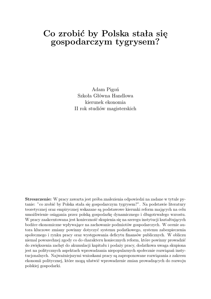 Co zrobić by Polska stała się gospodarczym tygrysem? Adam Pigoń Szkoła Główna Handlowa kierunek ekonomia II rok studiów magisterskich Streszczenie: W pracy zawarta jest próba znalezienia odpowiedzi na zadane w tytule pytanie: ”co zrobić by Polska stała się gospodarczym tygrysem?”. Na podstawie literatury teoretycznej oraz empirycznej wskazane są podstawowe kierunki reform mających na celu umożliwienie osiągania przez polską gospodarkę dynamicznego i długotrwałego wzrostu. W pracy zaakcentowana jest konieczność skupienia się na szeregu instytucji kształtujących bodźce ekonomiczne wpływające na zachowanie podmiotów gospodarczych. W ocenie autora kluczowe zmiany powinny dotyczyć systemu podatkowego, systemu zabezpieczenia społecznego i rynku pracy oraz występowania deficytu finansów publicznych. W obliczu niemal powszechnej zgody co do charakteru koniecznych reform, które powinny prowadzić do zwiększenia zachęt do akumulacji kapitału i podaży pracy, dodatkowa uwaga skupiona jest na politycznych aspektach wprowadzania niepopularnych społecznie rozwiązań instytucjonalnych. Najważniejszymi wnioskami pracy są zaproponowane rozwiązania z zakresu ekonomii politycznej, które mogą ułatwić wprowadzenie zmian prowadzących do rozwoju polskiej gospodarki. Czy Polska może stać się gospodarczym tygrysem? Nie można mieć wątpliwości, że Polska, w skali świata, jest jednym z najbogatszych i najbardziej rozwiniętych państw, w którym warunki życia obywateli należą do najlepszych. Znakomicie świadczy o tym wskaźnik HDI, który w roku 2011 wyniósł 0,813 i którego wartość lokuje nas w grupie 47 państw określanych jako te o bardzo wysokiej wartości wskaźnika. Jeszcze pełniejszą ocenę postępu społeczno-ekonomicznego jakiego dostąpiła Polska w ciągu ostatnich 20 lat dostarcza porównanie wartości HDI na przestrzeni lat: w roku 1995 wskaźnik wynosił jedynie 0,727. Ostatnie dwie dekady były nieprzerwanym wzrostem gospodarczym, którego nie można nie doceniać - PKB per capita w roku 1990 wynosiło jedynie 1 696 dolarów by w roku 2011 wynieść 13 424 dolary1 . Z drugiej strony należy jednak pamiętać, że polskie PKB per capita, mimo iż cały czas rośnie w stosunku do innych krajów Europy Zachodniej, wynosi jedynie 64% średniej wartości dla całej Unii Europejskiej2 . Pokazuje to jak znaczny dystans dzieli nas od najbogatszych krajów Unii i jednocześnie wskazuje na konieczność jak najszybszego nadrabiania dystansu do tych krajów. Potrzeba ta wydaje się szczególnie paląca zważywszy na fakt, iż większość Polaków miała bądź ma bezpośrednią możliwość doświadczenia wysokiego poziomu konsumpcji społeczeństw Wielkiej Brytanii, Holandii czy Niemiec. Parafrazując słowa Roberta Solowa można stwierdzić, że gdy raz doświadczy się skutków wzrostu gospodarczego trudno jest myśleć o czymkolwiek innym. Nie istnieje więc inna odpowiedź na pytanie czy Polska może stać się tygrysem gospodarczym jak ta, że musi się ona nim stać by sprostać oczekiwaniom konsumpcyjnym zarówno obecnych jak i przyszłych pokoleń Polaków. ”Tygrys gospodarczy” jest określeniem kojarzonym jednoznacznie z Japonią, Koreą czy Tajwanem. Czy Polska może powtórzyć ich sukces - czy możliwe jest osiąganie przez całą dekadę ponad dziesięcio procentowych wzrostów PKB i błyskawiczna konwergencja do krajów najbogatszych? Niestety, wydaje się zupełnie nierealnym by możliwa była dokładna replikacja skali sukcesu azjatyckich tygrysów. Wynika to z mniejszej odległości Polski od światowej granicy technologicznej, co uniemożliwia tak wysokie tempo rozwoju (Jones, Romer 2010) związane z imitacyjnym napływem technologii. Termin ”gospodarczego tygrysa” powinien być więc dostosowany do polskich możliwości i sytuacji w jakiej się znajdujemy. Wydaje się, że celem Polski powinno być osiąganie stabilnego tempa wzrostu na poziomie 4-5% co, przy założeniu 2-2,5% wzrostu krajów ”starej” Unii, pozwalałoby myśleć o pełnej konwergencji około roku 2035-20403 . Choć tempo wzrostu wynoszące 4% rocznie zdaje się być niezbyt spektakularnym celem dla kraju o ambicjach dogonienia europejskiej czołówki należy zauważyć, że utrzymanie takiego tempa przez co najmniej 25 lat, niezależnie od światowej koniunktury, w warunkach narastających trudności demograficznych rzutujących na zarówno ekonomiczne jak i polityczne warunki gospodarowania, wymaga podjęcia odważnych reform. Używając terminologii zaczerpniętej z raportu ”Polska 2030” reformy te muszą oddalać nas od zagrożenia przypadkowym dryfem rozwojowym a umożliwiać zrównoważony i długookresowy wzrost. 1 ceny bieżące, dane dotyczące HDI oraz PKB per capita za ONZ wg Eurostatu 3 obliczenia własne na podstawie danych Eurostatu 2 1 Wzrost w teorii Truizmem jest stwierdzenie, że produkt zależy od ilości zakumulowanego kapitału, podaży pracy i produktywności tych czynników produkcji. Teoria wzrostu poczyniła w ciągu ostatnich kilkudziesięciu lat olbrzymi postęp tworząc modele coraz bardziej szczegółowo wyjaśniające wzrost gospodarczy i dokładne zależności między produktywnością i podażą czynników wytwórczych a produktem i wynikającym z niego bogactwem. Modele teoretyczne akcentowały inne czynniki wzrostu zależnie od ówczesnego stanu wiedzy o gospodarce ale, co nie mniej ważne, także od zmieniajacego się w czasie charakteru i struktury gospodarek i społeczeństw, które opisywały. Pierwsze modele koncentrowały się na roli egzogenicznej stopy oszczędności, późniejsze zaś na roli technologii, innowacji, kapitału ludzkiego czy korzyściach skali i efektach zewnętrznych. We współczesnych gospodarkach rośnie znaczenie technologii utożsamianej z resztą Solowa4 , tym bardziej im gospodarka zbliższa się do granicy technologicznej (Jones, Romer 2010). Opisane zależności wpływaj