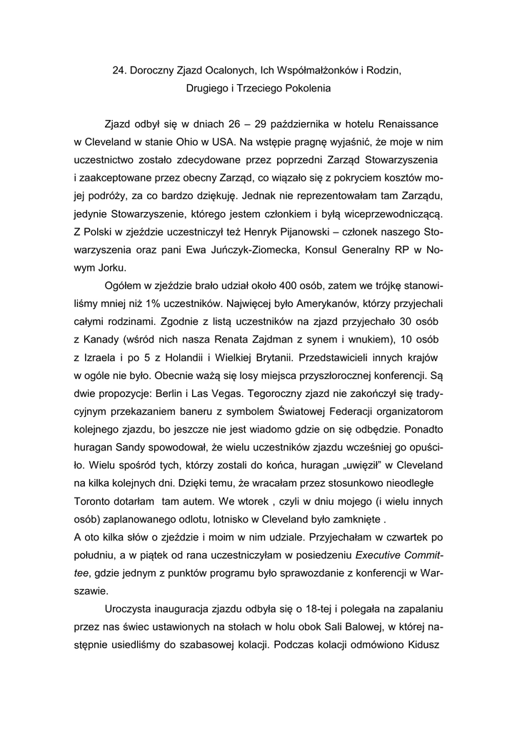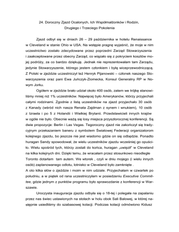 24. Doroczny Zjazd Ocalonych, Ich Współmałżonków i Rodzin, Drugiego i Trzeciego Pokolenia Zjazd odbył się w dniach 26 – 29 października w hotelu Renaissance w Cleveland w stanie Ohio w USA. Na wstępie pragnę wyjaśnić, że moje w nim uczestnictwo zostało zdecydowane przez poprzedni Zarząd Stowarzyszenia i zaakceptowane przez obecny Zarząd, co wiązało się z pokryciem kosztów mojej podróży, za co bardzo dziękuję. Jednak nie reprezentowałam tam Zarządu, jedynie Stowarzyszenie, którego jestem członkiem i byłą wiceprzewodniczącą. Z Polski w zjeździe uczestniczył też Henryk Pijanowski – członek naszego Stowarzyszenia oraz pani Ewa Juńczyk-Ziomecka, Konsul Generalny RP w Nowym Jorku. Ogółem w zjeździe brało udział około 400 osób, zatem we trójkę stanowiliśmy mniej niż 1% uczestników. Najwięcej było Amerykanów, którzy przyjechali całymi rodzinami. Zgodnie z listą uczestników na zjazd przyjechało 30 osób z Kanady (wśród nich nasza Renata Zajdman z synem i wnukiem), 10 osób z Izraela i po 5 z Holandii i Wielkiej Brytanii. Przedstawicieli innych krajów w ogóle nie było. Obecnie ważą się losy miejsca przyszłorocznej konferencji. Są dwie propozycje: Berlin i Las Vegas. Tegoroczny zjazd nie zakończył się tradycyjnym przekazaniem baneru z symbolem Światowej Federacji organizatorom kolejnego zjazdu, bo jeszcze nie jest wiadomo gdzie on się odbędzie. Ponadto huragan Sandy spowodował, że wielu uczestników zjazdu wcześniej go opuściło. Wielu spośród tych, którzy zostali do końca, huragan „uwięził” w Cleveland na kilka kolejnych dni. Dzięki temu, że wracałam przez stosunkowo nieodległe Toronto dotarłam tam autem. We wtorek , czyli w dniu mojego (i wielu innych osób) zaplanowanego odlotu, lotnisko w Cleveland było zamknięte . A oto kilka słów o zjeździe i moim w nim udziale. Przyjechałam w czwartek po południu, a w piątek od rana uczestniczyłam w posiedzeniu Executive Committee, gdzie jednym z punktów programu było sprawozdanie z konferencji w Warszawie. Uroczysta inauguracja zjazdu odbyła się o 18-tej i polegała na zapalaniu przez nas świec ustawionych na stołach w holu obok Sali Balowej, w której następnie usiedliśmy do szabasowej kolacji. Podczas kolacji odmówiono Kidusz i Hamotzi, po czym nastąpiły uroczyste powitania honorowych gości i uczestników. W tym miejscu warto zaznaczyć, że przez cały czas zjazdu rygorystycznie przestrzegano reguł judaizmu. Posiłki były ściśle koszerne. Każdego dnia rano i między zajęciami odprawiano modły. Po kolacji odbyły się tradycyjne spotkania osób urodzonych w danych krajach i jak zwykle grupa tych, co urodzili się w Polsce była najliczniejsza. Wszystkie osoby urodzone w Polsce na identyfikatorze miały napis Poland. Urodzeni w innych krajach też mieli to odnotowane na swoich identyfikatorach. Na naszym spotkaniu odniosłam wrażenie, że nadal dominuje żal i niechęć do Polski i Polaków. Ci, którzy po wojnie nigdy w Polsce nie byli, opowiadali (głównie po angielsku) o przykrościach, jakich kiedyś doznali. Była mowa o szczuciu Żydów przez kościół katolicki i o nadal żywej (ich zdaniem) legendzie o dzieciach mordowanych na macę. Natomiast ci, którzy byli w Polsce wiele razy i uczestniczyli wraz z przywiezioną przez siebie grupą młodzieży w różnych uroczystościach, starali się przedrzeć przez ten zalew niechęci i bardzo chwalili panującą w Polsce atmosferę. Próbowałam się włączyć do dyskusji, ale po kilku zdaniach zostałam zakrzyczana. Oni nadal wierzą w chwytliwy slogan, że w Polsce nie ma Żydów, ale jest antysemityzm. Zaskoczył mnie stosunek niektórych uczestników spotkania do budowanego w Warszawie Muzeum Historii Żydów Polskich. Padały głosy, że jeśli projekt poszczególnych ekspozycji został przygotowany przez Polaków, to z pewnością nie będzie to prawdziwy obraz życia Żydów w Polsce i że właściwie powinno to być muzeum Żydów europejskich, a nie tylko polskich. Tradycyjne wykłady, panele i warsztaty wystartowały w sobotę. I tak pierwsze zajęcia wyznaczono na godzinę 7 rano, jeszcze przed śniadaniem. Polegały one na rozluźniającej gimnastyce tanecznej czy tańcu medytacyjnym. To samo powtórzono w niedzielę rano. Nie wiem na ile to było skuteczne, bo w tym nie uczestniczyłam. Natomiast pierwszy wykład plenarny wygłosił Robert Krell, emerytowany profesor psychiatrii z Unversity of British Columbia. Mówił o 30. letniej przyjaźni, jaka łączy ocalonych z Holokaustu, o prowadzonym przez nas kształceniu młodzieży i dziedzictwie, jakie po sobie zostawimy. Następnie przewidziano szereg równoległych warsztatów dla ocalonych, ich partnerów, drugiego i trzeciego pokolenia oraz jeden panel o Ratowaniu Żydów I o stawianym przez nich oporze prześladowcom. Wśród panelistów był Philips Białowitz, który opowiedział o Sobiborze. Po lunchu był wykład na temat „walki Żydów z nazistami”. Wygłosił go Patrick Henry. Z następującego po nim bloku warsztatów i paneli wybrałam warsztat prowadzony przez Chavę Kopelman – psychoterapeutkę. Tematem były „wspomnienia i ich wpływ na nasze życie w miarę jak się starzejemy”. Pani Chava mówiła też o terapeutycznej roli, jaką spełnia spisanie wspomnień. Zgadzam się z tym w pełni. W kilku słowach opowiedziałam, jak opisanie mojej niedawno odkrytej historii uwolniło mnie od ciężaru tajemnicy. Inni opowiadali o tym, jak pisanie wspomnień w miły sposób wypełnia im wolny czas. Po tej grupie zajęć mieliśmy czas na wypoczynek i ewentualny rzut oka na miasto. Niestety pogoda była okropna. Lał deszcz i wiał silny wiatr. Z czystym sumieniem można było odpocząć w pokoju. Po kolacji wysłuchaliśmy kolejnego wykładu. Henry Fenichel – emerytowany profesor fizyki z University of Cincinnati – mówił o „torze we wszechświecie”. Było tam wiele alegorii, ale mimo że te