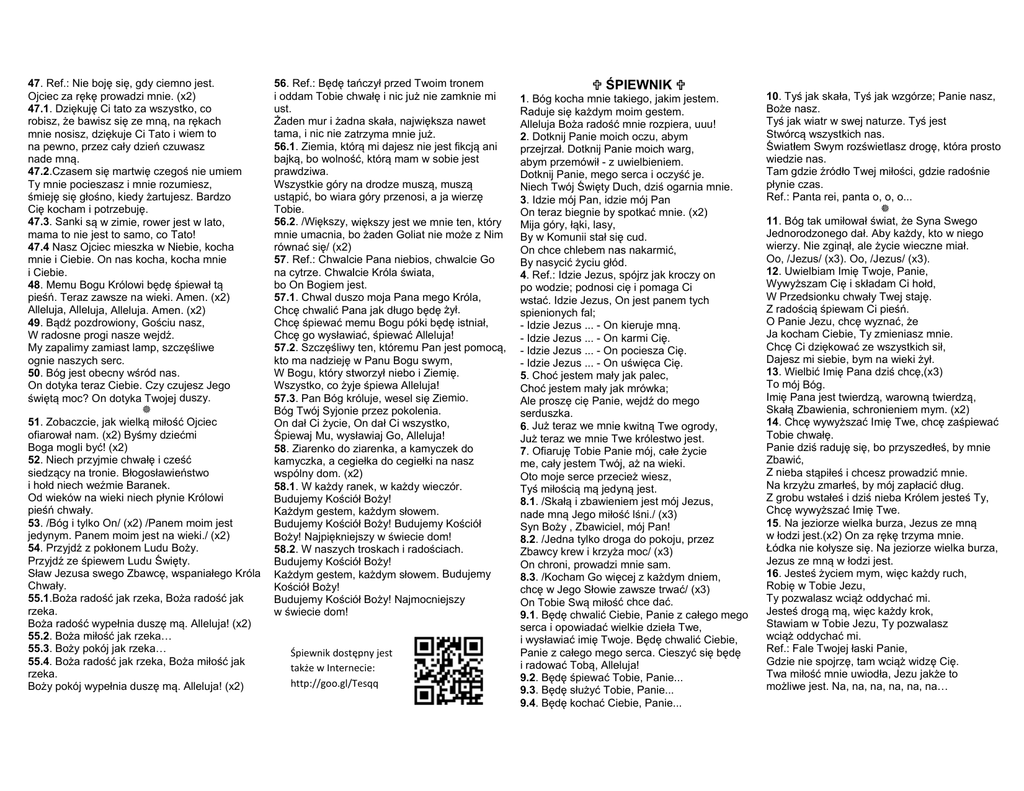 47. Ref.: Nie boję się, gdy ciem mno jest. Ojciec za ręk kę prowadzi mnie. (x2) 47.1. Dziękujję Ci tato za wszys stko, co robisz, że ba awisz się ze mną, na n rękach mnie nosisz, dziękuje Ci Tato i wiem to na pewno, prrzez cały dzień czu uwasz nade mną. 47.2.Czasem m się martwię czegoś nie umiem Ty mnie pociieszasz i mnie rozu umiesz, śmieję się głośno, kiedy żartuje esz. Bardzo Cię kocham i potrzebuję. 47.3. Sanki są s w zimie, rower je est w lato, mama to nie jest to samo, co Tato! T 47.4 Nasz Ojjciec mieszka w Niiebie, kocha mnie i Ciebie e. On nas kocha, kocha mnie i Ciebie. ogu Królowi będę śpiewał ś tą 48. Memu Bo pieśń. Teraz zawsze na wieki. Amen. A (x2) Alleluja, Allelluja, Alleluja. Amen n. (x2) 49. Bądź poz zdrowiony, Gościu nasz, W radosne progi p nasze wejdź. My zapalimy y zamiast lamp, szc częśliwe ognie naszyc ch serc. 50. Bóg jest obecny wśród nas. eraz Ciebie. Czy cz zujesz Jego On dotyka te świętą moc? On dotyka Twojej duszy. 51. Zobaczciie, jak wielką miłoś ść Ojciec ofiarował nam m. (x2) Byśmy dzie ećmi Boga mogli być! b (x2) 52. Niech prz zyjmie chwałę i cze eść siedzący na tronie. Błogosławie eństwo i hołd niech w weźmie Baranek. Od wieków na n wieki niech płynie Królowi pieśń chwały y. 53. /Bóg i tylko On/ (x2) /Panem m moim jest jedynym. Panem moim jest na wieki./ (x2) B 54. Przyjdź z pokłonem Ludu Boży. Przyjdź ze śp piewem Ludu Świę ęty. Sław Jezusa a swego Zbawcę, wspaniałego w Króla Chwały. adość jak rzeka, Bo oża radość jak 55.1.Boża ra rzeka. ć wypełnia duszę mą. m Alleluja! (x2) Boża radość 55.2. Boża miłość m jak rzeka… 55.3. Boży pokój jak rzeka… adość jak rzeka, Boża miłość jak 55.4. Boża ra rzeka. w duszę mą ą. Alleluja! (x2) Boży pokój wypełnia 56. Ref.: Będę ta ańczył przed Twoim m tronem i oddam Tobie ch hwałę i nic już nie zamknie z mi ust. Żaden mur i żadna skała, największa nawet tama, i nic nie za atrzyma mnie już. 56.1. Ziemia, któ órą mi dajesz nie je est fikcją ani bajką, bo wolnoś ść, którą mam w so obie jest prawdziwa. Wszystkie góry na n drodze muszą, muszą m ustąpić, bo wiara a góry przenosi, a ja wierzę Tobie. 56.2. /Większy, większy w jest we mn nie ten, który mnie umacnia, bo b żaden Goliat nie e może z Nim równać się/ (x2) cie Pana niebios, ch hwalcie Go 57. Ref.: Chwalc na cytrze. Chwallcie Króla świata, bo On Bogiem je est. 57.1. Chwal dusz zo moja Pana meg go Króla, Chcę chwalić Pa ana jak długo będę żył. Chcę śpiewać memu m Bogu póki bę ędę istniał, Chcę go wysławiać, śpiewać Alleluja! 57.2. Szczęśliwy y ten, któremu Pan jest pomocą, kto ma nadzieję w Panu Bogu swym m, W Bogu, który sttworzył niebo i Ziem mię. Wszystko, co żyjje śpiewa Alleluja! 57.3. Pan Bóg krróluje, wesel się Ziemio. Bóg Twój Syjonie e przez pokolenia. On dał Ci życie, On dał Ci wszystko o, sławiaj Go, Alleluja! Śpiewaj Mu, wys 58. Ziarenko do ziarenka, z a kamycz zek do kamyczka, a ceg giełka do cegiełki na nasz wspólny dom. (x2) anek, w każdy wiec czór. 58.1. W każdy ra Budujemy Kośció ół Boży! Każdym gestem, każdym słowem. Budujemy Kośció ół Boży! Budujemy y Kościół Boży! Najpięknie ejszy w świecie dom m! 58.2. W naszych h troskach i radościiach. Budujemy Kośció ół Boży! Każdym gestem, każdym słowem. Budujemy Kościół Boży! Budujemy Kośció ół Boży! Najmocnie ejszy w świecie dom! Śpiewnik dostęępny jest także w Internecie: http://goo.gl/TTesqq ŚP PIEWNIK 1. Bóg kocha mnie ta akiego, jakim jestem. Ra aduje się każdym m moim gestem. Alleluja Boża radośćć mnie rozpiera, uuu! 2. Dotknij Panie moicch oczu, abym prrzejrzał. Dotknij Pan nie moich warg, ab bym przemówił - z u uwielbieniem. Do otknij Panie, mego serca i oczyść je. Niech Twój Święty D Duch, dziś ogarnia mnie. 3. Idzie mój Pan, idzzie mój Pan On n teraz biegnie by sspotkać mnie. (x2)) Mija góry, łąki, lasy, By y w Komunii stał się ę cud. On n chce chlebem na as nakarmić, By y nasycić życiu głód. 4. Ref.: Idzie Jezus, spójrz jak kroczy on o po o wodzie; podnosi ccię i pomaga Ci ws stać. Idzie Jezus, O On jest panem tych h sp pienionych fal; - Idzie Jezus ... - On kieruje mną. - Idzie Jezus ... - On karmi Cię. - Idzie Jezus ... - On pociesza Cię. - Idzie Jezus ... - On uświęca Cię. 5. Choć jestem małyy jak palec, Ch hoć jestem mały jak mrówka; Ale proszę cię Panie e, wejdź do mego se erduszka. 6. Już teraz we mnie e kwitną Twe ogrod dy, uż teraz we mnie Tw we królestwo jest. Ju 7. Ofiaruję Tobie Pan nie mój, całe życie me e, cały jestem Twó ój, aż na wieki. Otto moje serce przecież wiesz, Ty yś miłością mą jedyyną jest. 8.1. /Skałą i zbawien niem jest mój Jezus s, ade mną Jego miło ość lśni./ (x3) na Sy yn Boży , Zbawiciel, mój Pan! 8.2 2. /Jedna tylko dro oga do pokoju, prze ez Zb bawcy krew i krzyża moc/ (x3) On n chroni, prowadzi mnie sam. 8.3 3. /Kocham Go wię ęcej z każdym dnie em, ch hcę w Jego Słowie zawsze trwać/ (x3) On n Tobie Swą miłość chce dać. 9.1. Będę chwalić Ciiebie, Panie z całeg go mego se erca i opowiadać w wielkie dzieła Twe, iw wysławiać imię Two oje. Będę chwalić Ciebie, C Pa anie z całego mego o serca. Cieszyć siię będę i ra adować Tobą, Alle eluja! 9.2 2. Będę śpiewać T Tobie, Panie... 9.3 3. Będę służyć Tob bie, Panie... 9.4 4. Będę kochać Ciebie, Panie... 10. Ty yś jak skała, Tyś jak wzgórze; Panie nasz, n Boże nasz. Tyś ja ak wiatr w swej natu urze. Tyś jest Stwórc cą wszystkich nas.. Światłłem Swym rozświetlasz drogę, która prosto p wiedzie nas. Tam gdzie g źródło Twej m miłości, gdzie radoś śnie płynie czas. Ref.: Panta P rei, panta o, o, o... 11. Bó óg tak umiłował św wiat, że Syna Swego o Jedno orodzonego dał. Ab by każdy, kto w niego wierzyy. Nie zginął, ale żyycie wieczne miał