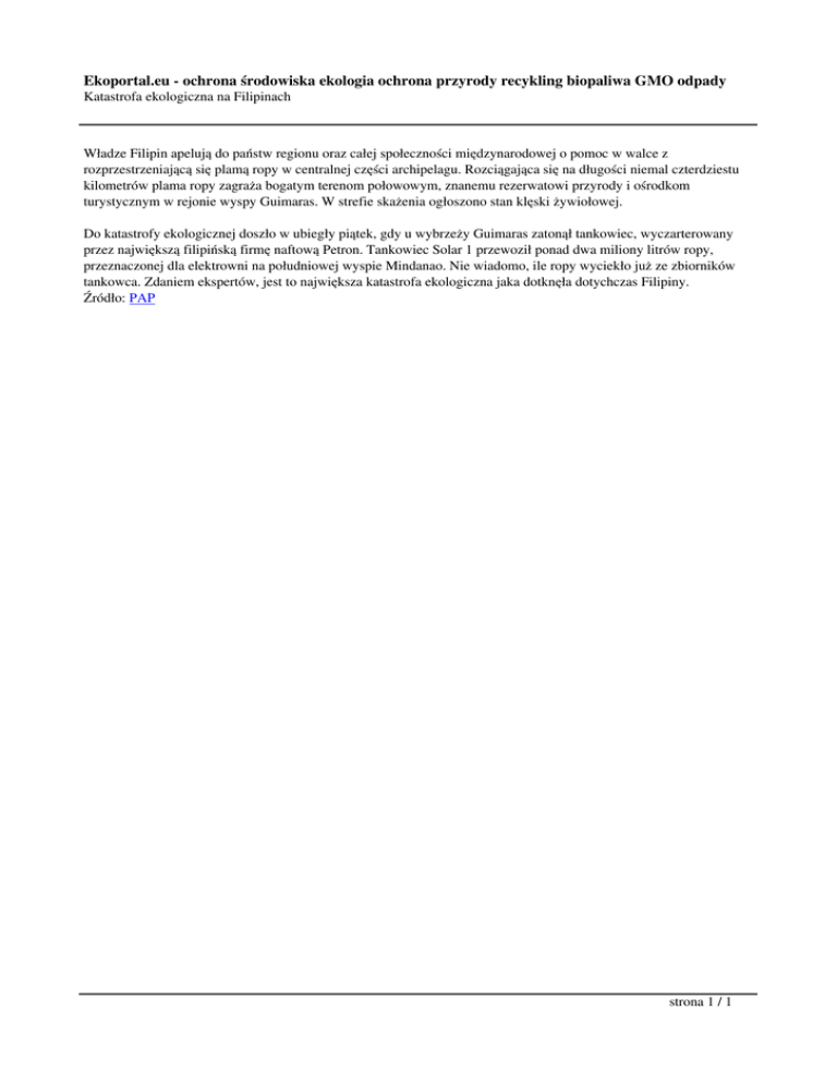 Ekoportal.eu - ochrona środowiska ekologia ochrona przyrody recykling biopaliwa GMO odpady Katastrofa ekologiczna na Filipinach Władze Filipin apelują do państw regionu oraz całej społeczności międzynarodowej o pomoc w walce z rozprzestrzeniającą się plamą ropy w centralnej części archipelagu. Rozciągająca się na długości niemal czterdziestu kilometrów plama ropy zagraża bogatym terenom połowowym, znanemu rezerwatowi przyrody i ośrodkom turystycznym w rejonie wyspy Guimaras. W strefie skażenia ogłoszono stan klęski żywiołowej. Do katastrofy ekologicznej doszło w ubiegły piątek, gdy u wybrzeży Guimaras zatonął tankowiec, wyczarterowany przez największą filipińską firmę naftową Petron. Tankowiec Solar 1 przewoził ponad dwa miliony litrów ropy, przeznaczonej dla elektrowni na południowej wyspie Mindanao. Nie wiadomo, ile ropy wyciekło już ze zbiorników tankowca. Zdaniem ekspertów, jest to największa katastrofa ekologiczna jaka dotknęła dotychczas Filipiny. Źródło: PAP strona 1 / 1