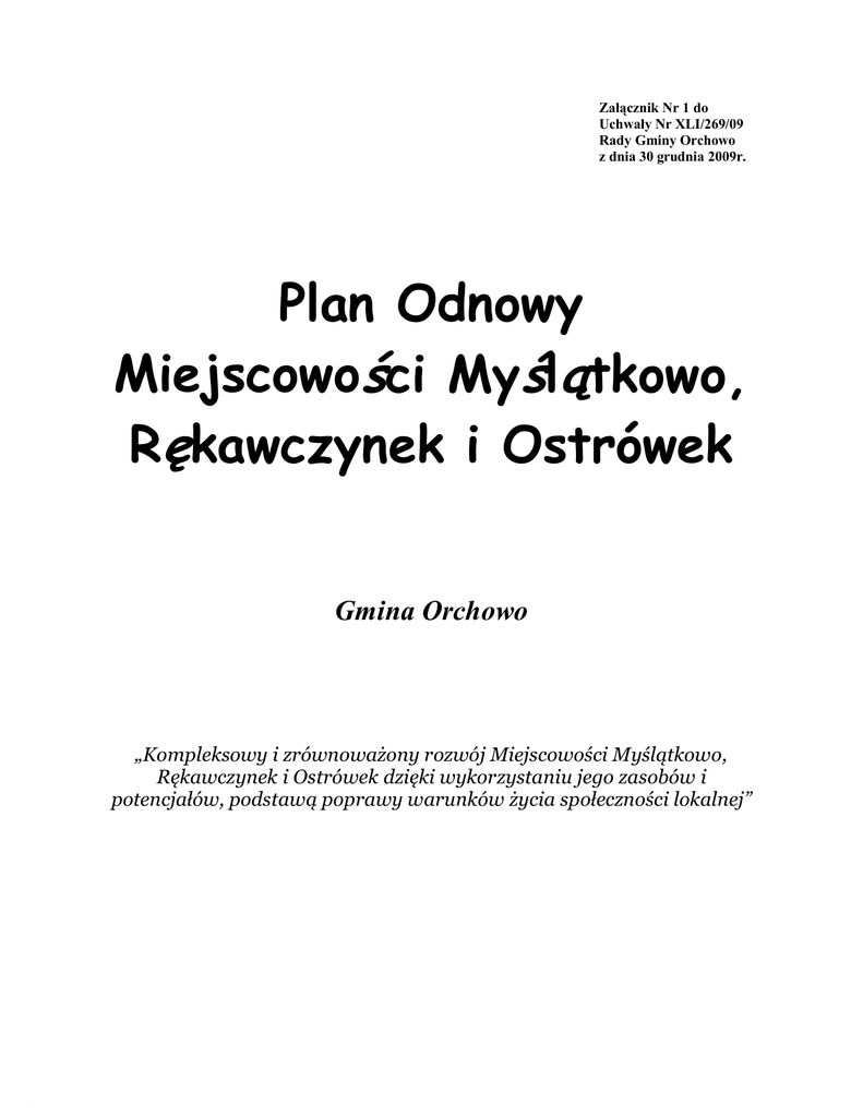 Załącznik Nr 1 do Uchwały Nr XLI/269/09 Rady Gminy Orchowo z dnia 30 grudnia 2009r. Plan Odnowy Miejscowości Myślątkowo, Rękawczynek i Ostrówek Gmina Orchowo „Kompleksowy i zrównoważony rozwój Miejscowości Myślątkowo, Rękawczynek i Ostrówek dzięki wykorzystaniu jego zasobów i potencjałów, podstawą poprawy warunków życia społeczności lokalnej” Spis treści: 1. Wstęp 2. Ogólna charakterystyka a. Położenie b. Historia 3. Zasoby miejscowości a. Środowisko przyrodnicze b. Obiekty zabytkowe c. Mieszkańcy 4. Analiza SWOT 5. Arkusz planowania długoterminowego 6. Arkusz planowania krótkoterminowego 7. Zarządzanie 8. Zgodność Planu Odnowy ze strategiami i planami rozwoju wyższego rzędu 2 1. Wstęp Powstanie niniejszego dokumentu należy zawdzięczać wszystkim mieszkańcom miejscowości Myślątkowo, Rękawczynek i Ostrówek. Grupę inicjatywną tworzyli członkowie Rady Sołeckiej z sołtysem wsi na czele oraz Radnym Rady Gminy pochodzącym z Myślątkowa. 2. Ogólna charakterystyka Miejscowości Myślątkowo, Rękawczynek i Ostrówek tworzą Sołectwo Myślątkowo. a. Położenie Myślątkowo, Rękawczynek i Ostrówek – to miejscowości położone w województwie wielkopolskim, w powiecie słupeckim, w Gminie Orchowo. Myślątkowo położone jest 2 km na północ od Orchowa przy drodze Orchowo - Mogilno. Wieś leży przy drodze wojewódzkiej nr 262 Kwieciszewo - Gębice - Orchowo - Szyszłowo. Rękawczynek leży 1 km na zachód od Myślątkowa, a wieś Ostrówek 3,5 km od Myślątkowa. Sołectwo Myślątkowo sąsiaduje z sołectwami Różanna, Orchowo, Słowikowo. Myślątkowo leży na terenie Powidzkiego Parku Krajobrazowego powołanego przez Wojewodę Konińskiego rozporządzeniem nr 18 z dnia 16 grudnia 1998 roku. Park obejmuje tereny znajdujące się na obszarze gmin: Kleczew, Orchowo, Ostrowite, Powidz, Słupca, Wilczyn i Witkowo. Ochroną objęto 24 600 ha gruntów znacznie zróżnicowanych pod względem przyrodniczym. Znajdują się tam lasy, jeziora, torfowiska i łąki oraz tereny intensywniej użytkowane przez ludzi, jak pola i zabudowa o charakterze wiejskim. Powidzki Park Krajobrazowy został utworzony w celu zabezpieczenia wartości przyrodniczych oraz kulturalnych. Swoistą cechą krajobrazu tego regionu jest system 17 jezior polodowcowych, zwykle wąskich, długich i głębokich. W pobliżu sołectwa przebiega Szlak Piastowski. Szlak rozpoczyna się w Poznaniu i dalej biegnie na północ przez Pobiedziska, Moraczewo, Ostrów Lednicki, Gniezno, Trzemeszno, Mogilno, Strzelno, Kruszwicę, Inowrocław, Kościelec Kujawski, Pakość, Barcin, Lubostroń, Żnin, Wenecję, Biskupin, Gąsawę, Marcinkowo Górne, Rogowo do Gniezna. Wzdłuż głównej osi szlaku skupione są inne bardzo ciekawe, historycznie i krajobrazowo miejscowości: Uzarzewo, Wierzenica, Tuczno, Wronczyn, Pomarzanowice, Imielenko, Imielno, Imiołki, Łubowo, Czerniejewo, Giecz, Miłosław, Września, Grzybowo, Witkowo, Skorzęcin, Powidz, Małachowo, Kołaczkowo, Arcugowo, Niechanowo, Jankowo Dolne, Duszno, z najwyższym wzniesieniem /Wałem Wydartowskim/, Wylatowo, Kwieciszewo, Sławsk Wielki, Kobylniki, Szarlej, Łojewo, Szymborze, Tupadła i Markowice oraz Waplewo, Piechcin z miejscowością Żnin Górna, Ryszewo, Gościeszyn, Kruchowo, Przyjma I i II, Niestronno, Bełki i Wieniec, Rzym, Łopienno, Mielno, Kłecko, Kiszkowo i Dąbrówka Kość. b. Historia Nazwa miejscowości Myślątkowo pochodzi prawdopodobnie od przezwiska kmiecego Myślątko (w r. 1138 imię Mislac), stąd Myślątek, Myślętka. W XV wieku wieś Myślątkowo była w posiadaniu rodu Pomianów. Myślątkowo pierwotnie należało do parafii Rękawczyn (rękawieckiej). Około roku 1520 wchodziło w skład parafii orchowskiej. W tym czasie do uposażenia parafii orchowskiej należała się z Myślątkowa dziesięcina folwarczna (co 10 snopek z 3 pola), zaś z kmiecych meszne po ćwiertni żyta i owsa od łana. Według regestrów poborowych powiatu gnieźnieńskiego z 1580 roku Miśladkowo (w 1465 r. Myslantkowo) było własnością Sew. Pałęckiego, miało 4 łany i 1 zagrodnika. W 1748 roku dziedzicem Myślątkowa był Kazimierz Wągrocki, a w następnym roku właścicielką była Konstancja Kossowska. W Słowniku Geograficznym Królestwa Polskiego z 1888 r. znajdujemy następujące informacje o wsi: “wieś leży w powiecie mogileńskim, w 3 domostwach mieszkało 31 osób, w tym 7 protestantów, 24 katolików, 9 analfabetów. Poczta w Orchowie o 3,5 km, telegraf w Gębicach o 8 km, stacja drogi żelaznej w Mogilnie o 16 km, gościniec o 9 km. Dobra myślątkowskie wraz z Różanną obejmowały obszar 7208 mórg. Stanowiły niegdyś własność Malczewskiego. W pierwszej połowie XIX wieku Malczewscy posiadali też majątek w Procyniu, który w 1863 roku kupił Hermann Schneider. Na początku XX wieku zaczęło się rozwijać na skalę przemysłową mleczarstwo. Mleczarnię spółdzielczą w Myślątkowie założono w 1901 roku, a więc w okresie zaborów. Wówczas większość mieszkańców okolicy stanowili Niemcy. Współczesne opracowania różnie datują założenie tej mleczarni. Według Ratajskiego - Okręgowa Spółdzielnia Mleczarska wywodzi się ze spółdzielni założonej w 1891 roku w Myślątkowie, a w Mogilnie działa od 1902 roku. Według Dworeckiego - Najstarszą z czterech spółdzielni mleczarskich, bo założoną w 1874 roku a zarazem najmniejszą w powiecie i jedną z najmniejszych w województwie jest spółdzielnia w Myślątkowie. Autorzy III tomu "Studiów..." podają, że mleczarnię w Myślątkowie k. Orchowa założono w 1874 roku. "Rozmaitości Mogileńskie" stwierdzają, że w roku 1874 w Myślątkowie założona została pierwsza w powiecie mleczarnia. Z powyższego należy sądzić, że wiarygodną datą jest rok 1874. W dniu 29 maja 1957 roku powstała Okręgowa Spółdzielnia Mleczarska w Mogilnie, która zrzeszała wówczas 6 zakładów, w tym Myślątkowo. W roku 1962