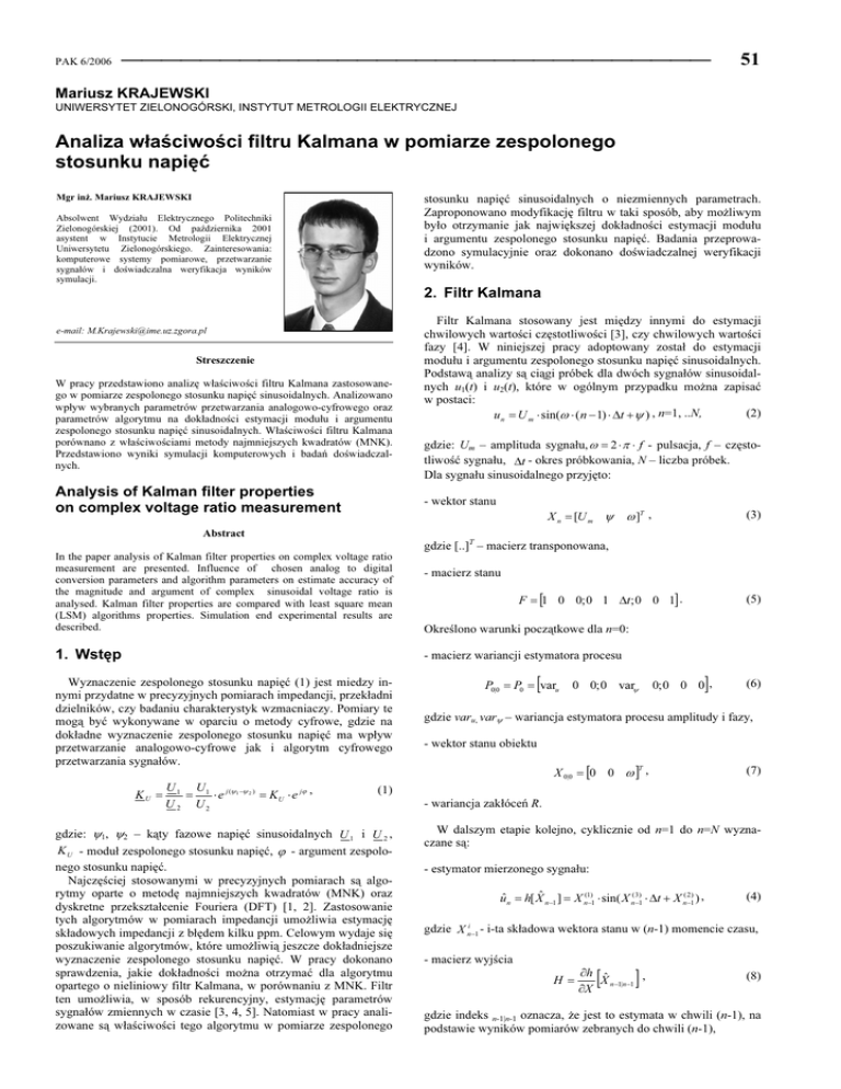 PAK 6/ 2 0 0 6 51 Mariusz K R A J E W S K I UNIWERSYTET ZIELONOGÓ RSK I, INSTYTUT M ETROLOGII ELEK TRYC ZNEJ Analiza właściwości filtru Kalmana w pomiarze zespolonego stosunk u napię ć s t os u nku napię ć s inu s oid al ny c h o niez m ienny c h param et rac h . Z aproponow ano m od y f ikac j ę f il t ru w t aki s pos ób , ab y m ożl iw y m b y ł o ot rz y m anie j ak naj w ię ks z ej d okł ad noś c i es t y m ac j i m od u ł u i argu m ent u z es pol onego s t os u nku napię ć . B ad ania prz eprow ad z ono s y m u l ac y j nie oraz d okonano d oś w iad c z al nej w ery f ikac j i w y ników . Mgr inż. Mariusz K R A J E W S K I A b s o lw e n t W y d z ia łu Z ie lo n o g ó rs k ie j (2 0 0 a s y s te n t w In s ty tu U n iw e rs y te tu Z ie lo n k o m p u te ro w e s y s te m s y g n a łó w i d o ś w ia d s y m u la c ji. E le k try c z n 1 ). O d p a c ie M e tro lo o g ó rs k ie g o . y p o m ia ro w c z a ln a w e ry e g o ź d z g ii Z a e , fik a P ie rn E in te p rz c ja o lite c ik a le k try re so w e tw a r w y n h n ik i 2 0 0 1 c z n e j a n ia : z a n ie ik ó w 2 . F il t r K al man a e-m a i l : M . K r a j ew s k i @ i m e. u z . z g o r a . p l S tr e s z c z e n ie W p rac y p rz e d s t aw i o n o an al i z ę w ł aś c i w o ś c i f i l t ru Kal m an a z as t o s o w an e g o w p o m i arz e z e s p o l o n e g o s t o s u n k u n ap i ę ć s i n u s o i d al n y c h . An al i z o w an o w p ł y w w y b ran y c h p aram e t ró w p rz e t w arz an i a an al o g o w o -c y f ro w e g o o raz p aram e t ró w al g o ry t m u n a d o k ł ad n o ś c i e s t y m ac j i m o d u ł u i arg u m e n t u z e s p o l o n e g o s t o s u n k u n ap i ę ć s i n u s o i d al n y c h . W ł aś c i w o ś c i f i l t ru Kal m an a p o ró w n an o z w ł aś c i w o ś c i am i m e t o d y n aj m n i e j s z y c h k w ad rat ó w ( M N K) . Prz e d s t aw i o n o w y n i k i s y m u l ac j i k o m p u t e ro w y c h i b ad ań d o ś w i ad c z al n y c h . A n al y sis o f K al man f il t e r p ro p e rt ie s o n c o mp l e x v o l t ag e rat io me asure me n t F il t r K al m ana s t os ow any j es t m ię d z y inny m i d o es t y m ac j i c h w il ow y c h w art oś c i c z ę s t ot l iw oś c i [ 3 ] , c z y c h w il ow y c h w art oś c i f az y [ 4 ] . W niniej s z ej prac y ad opt ow any z os t ał d o es t y m ac j i m od u ł u i argu m ent u z es pol onego s t os u nku napię ć s inu s oid al ny c h . P od s t aw ą anal iz y s ą c ią gi prób ek d l a d w óc h s y gnał ów s inu s oid al ny c h u1(t) i u2(t) , kt óre w ogól ny m prz y pad ku m ożna z apis ać w pos t ac i: (2 ) u n = U m ⋅ sin(ω ⋅ (n − 1) ⋅ ∆t + ψ ) , n=1 , ..N, gd z ie: Um – am pl it u d a s y gnał u , ω = 2 ⋅ π ⋅ f - pu l s ac j a, f – c z ę s t ot l iw oś ć s y gnał u , ∆t - okres prób kow ania, N – l ic z b a prób ek. D l a s y gnał u s inu s oid al nego prz y j ę t o: - w ekt or s t anu A b str a c t I n t h e p ap e r an al y s i s o f Kal m an f i l t e r p ro p e rt i e s o n c o m p l e x v o l t ag e rat i o m e as u re m e n t are p re s e n t e d . I n f l u e n c e o f c h o s e n an al o g t o d i g i t al c o n v e rs i o n p aram e t e rs an d al g o ri t h m p aram e t e rs o n e s t i m at e ac c u rac y o f t h e m ag n i t u d e an d arg u m e n t o f c o m p l e x s i n u s o i d al v o l t ag e rat i o i s an al y s e d . Kal m an f i l t e r p ro p e rt i e s are c o m p are d w i t h l e as t s q u are m e an ( L S M ) al g o ri t h m s p ro p e rt i e s . S i m u l at i o n e n d e x p e ri m e n t al re s u l t s are d e s c ri b e d . 1 . W st ę p X n = [U m ψ ω ]T , (3 ) gd z ie [ ..] T – m ac ierz t rans ponow ana, - m ac ierz s t anu F = [1 0 0; 0 1 ∆t ; 0 0 1] . O kreś l ono w aru nki poc z ą t kow e d l a n=0 : - m ac ierz w arianc j i es t y m at ora proc es u W y z nac z enie z es pol onego s t os u nku napię ć (1 ) j es t m ied z y inny m i prz y d at ne w prec y z y j ny c h pom iarac h im ped anc j i, prz ekł ad ni d z iel ników , c z y b ad aniu c h arakt ery s t y k w z m ac niac z y . P om iary t e m ogą b y ć w y kony w ane w oparc iu o m et od y c y f row e, gd z ie na d okł ad ne w y z nac z enie z es pol onego s t os u nku napię ć m a w pł y w prz et w arz anie anal ogow o-c y f row e j ak i al gory t m c y f row ego prz et w arz ania s y gnał ów . KU = U 1 U 1 j (ψ 1 −ψ 2 ) = ⋅e = K U ⋅ e jϕ , U 2 U2 (1 ) gd z ie: ψ1, ψ2 – ką t y f az ow e napię ć s inu s oid al ny c h U 1 i U 2 , K U - m od u ł z es pol onego s t os u nku napię ć , ϕ - argu m ent z es pol onego s t os u nku napię ć . N aj c z ę ś c iej s t os ow any m i w prec y z y j ny c h pom iarac h s ą al gory t m y opart e o m et od ę naj m niej s z y c h kw ad rat ów (M N K ) oraz d y s kret ne prz eks z t ał c enie F ou riera (D F T ) [ 1 , 2 ] . Z as t os ow anie t y c h al gory t m ów w pom iarac h im ped anc j i u m ożl iw ia es t y m ac j ę s kł ad ow y c h im ped anc j i z b ł ę d em kil ku ppm . C el ow y m w y d aj e s ię pos z u kiw anie al gory t m ów , kt óre u m ożl iw ią j es z c z e d okł ad niej s z e w y z nac z enie z es pol onego s t os u nku napię ć . W prac y d okonano s praw d z enia, j akie d okł ad noś c i m ożna ot rz y m ać d l a al gory t m u opart ego o niel iniow y f il t r K al m ana, w porów naniu z M N K . F il t r t en u m ożl iw ia, w s pos ób reku renc y j ny , es t y m ac j ę param et rów s y gnał ów z m ienny c h w c z as ie [ 3 , 4 , 5 ] . N at om ias t w prac y anal iz ow ane s ą w ł aś c iw oś c i t ego al gory t m u w pom iarz e z es pol onego (5 ) [ P0|0 = P0 = varu gd z ie v a r u, v a r ψ 0 0; 0 varψ ] 0; 0 0 0 , (6 ) – w arianc j a es t y m at ora proc es u am pl it u d y i f az y , - w ekt or s t anu ob iekt u T X 0|0 = [0 0 ω ] , (7 ) - w arianc j a z akł óc eń R. W d al s z y m c z ane s ą 