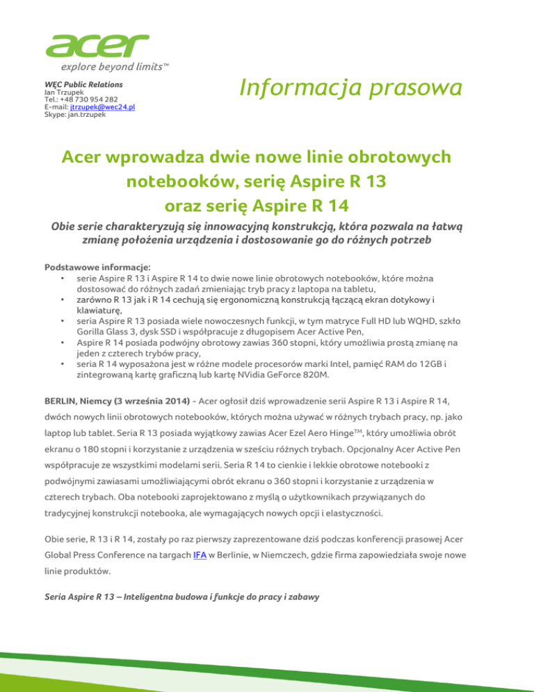 Aspire R13, Aspire R14 – inf. prasowa Acer