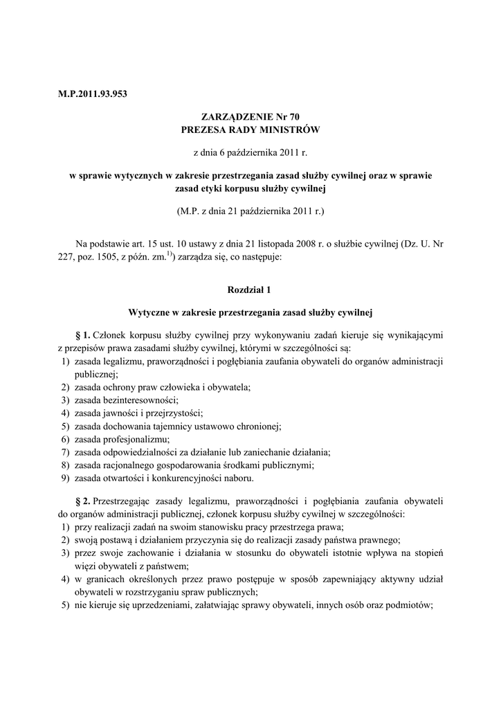 M.P.2011.93.953 ZARZĄDZENIE Nr 70 PREZESA RADY MINISTRÓW z dnia 6 października 2011 r. w sprawie wytycznych w zakresie przestrzegania zasad służby cywilnej oraz w sprawie zasad etyki korpusu służby cywilnej (M.P. z dnia 21 października 2011 r.) Na podstawie art. 15 ust. 10 ustawy z dnia 21 listopada 2008 r. o służbie cywilnej (Dz. U. Nr 227, poz. 1505, z późn. zm.1)) zarządza się, co następuje: Rozdział 1 Wytyczne w zakresie przestrzegania zasad służby cywilnej § 1. Członek korpusu służby cywilnej przy wykonywaniu zadań kieruje się wynikającymi z przepisów prawa zasadami służby cywilnej, którymi w szczególności są: 1) zasada legalizmu, praworządności i pogłębiania zaufania obywateli do organów administracji publicznej; 2) zasada ochrony praw człowieka i obywatela; 3) zasada bezinteresowności; 4) zasada jawności i przejrzystości; 5) zasada dochowania tajemnicy ustawowo chronionej; 6) zasada profesjonalizmu; 7) zasada odpowiedzialności za działanie lub zaniechanie działania; 8) zasada racjonalnego gospodarowania środkami publicznymi; 9) zasada otwartości i konkurencyjności naboru. § 2. Przestrzegając zasady legalizmu, praworządności i pogłębiania zaufania obywateli do organów administracji publicznej, członek korpusu służby cywilnej w szczególności: 1) przy realizacji zadań na swoim stanowisku pracy przestrzega prawa; 2) swoją postawą i działaniem przyczynia się do realizacji zasady państwa prawnego; 3) przez swoje zachowanie i działania w stosunku do obywateli istotnie wpływa na stopień więzi obywateli z państwem; 4) w granicach określonych przez prawo postępuje w sposób zapewniający aktywny udział obywateli w rozstrzyganiu spraw publicznych; 5) nie kieruje się uprzedzeniami, załatwiając sprawy obywateli, innych osób oraz podmiotów; 6) nie uczestniczy w strajkach lub akcjach protestacyjnych, zakłócających normalne funkcjonowanie urzędu. § 3. Przestrzegając zasady ochrony praw człowieka i obywatela, członek korpusu służby cywilnej w szczególności zna prawa człowieka i obywatela, nie proponuje ani nie podejmuje działań, które naruszają prawa człowieka i obywatela, oraz ma na uwadze, że ich skuteczna ochrona przyczynia się do wzrostu autorytetu państwa. § 4. Przestrzegając zasady bezinteresowności, członek korpusu służby cywilnej w szczególności: 1) nie przyjmuje od osób zaangażowanych w prowadzone sprawy żadnych korzyści; 2) nie przyjmuje żadnej formy zapłaty za publiczne wystąpienia, gdy mają one związek z zajmowanym stanowiskiem; 3) rezygnuje z dodatkowego zatrudnienia lub zajęcia zarobkowego, jeżeli dalsze wykonywanie dodatkowego zatrudnienia lub zajęcia zarobkowego może mieć negatywny wpływ na sprawy prowadzone w ramach obowiązków służbowych; 4) nie prowadzi szkoleń, jeżeli mogłoby to negatywnie wpłynąć na bezstronność prowadzonych spraw. § 5. Przestrzegając zasady jawności i przejrzystości, członek korpusu służby cywilnej w szczególności: 1) w granicach określonych przez prawo zapewnia dostępność informacji o zasadach i efektach swojej pracy i podejmowanych rozstrzygnięciach, która stanowi podstawę zaufania obywateli do państwa, a ograniczenia w tym zakresie mogą wynikać jedynie z wyłączenia jawności rozstrzygnięcia; 2) przy tworzeniu przepisów, podejmowaniu decyzji oraz innych rozstrzygnięć, dąży do zapewnienia jednoznaczności oraz zrozumiałości podejmowanych działań; 3) przyjęte rozstrzygnięcia wyczerpująco uzasadnia, ze wskazaniem powodów ich przyjęcia oraz celów, które mają zostać osiągnięte, zwłaszcza w sprawach będących przedmiotem rozbieżności w debacie publicznej; 4) zna konstytucyjne i ustawowe przepisy dotyczące prawa dostępu do informacji publicznej oraz zapewnia praktyczną realizację tego prawa. § 6. Przestrzegając zasady dochowania tajemnicy ustawowo chronionej, członek korpusu służby cywilnej w szczególności: 1) dochowuje tajemnicy ustawowo chronionej; 2) obejmując ochroną informację, czyni to w celu zabezpieczenia wyraźnie wskazanych interesów państwa, obywateli oraz innych podmiotów, a nie w celu ograniczenia jawności i przejrzystości działania. § 7. Przestrzegając w szczególności: zasady profesjonalizmu, członek korpusu służby cywilnej 1) realizując zadania państwa, posiada niezbędną wiedzę dotyczącą funkcjonowania państwa, podnosi kwalifikacje oraz rozwija wiedzę zawodową, potrzebną do jak najlepszego wykonywania pracy w urzędzie; 2) zna akty prawne dotyczące funkcjonowania urzędu, w którym jest zatrudniony, oraz zapoznaje się z wszystkimi istotnymi okolicznościami faktycznymi i prawnymi prowadzonych przez siebie spraw; 3) zna zasady etyki korpusu służby cywilnej i sumiennie ich przestrzega; 4) zna zasady służby cywilnej i sumiennie ich przestrzega; 5) poddaje się weryfikacji znajomości zasad służby cywilnej; 6) dąży do stosowania wysokich standardów zarządzania publicznego, wykorzystuje wiedzę przełożonych, kolegów i podwładnych, dzieli się z nimi własnym doświadczeniem zawodowym, a jeżeli jest to uzasadnione, korzysta z pomocy ekspertów; 7) efektywnie i racjonalnie zarządza posiadanymi zasobami kadrowymi i wykorzystuje w taki sposób czas pracy; 8) w wykonywaniu zadań dąży do uzgodnień opartych na rzeczowej argumentacji; 9) jest gotów do przyjęcia krytyki, uznania swoich błędów i do naprawienia ich konsekwencji; 10) przez swoją postawę dba o wizerunek służby cywilnej; 11) korzystając z zagwarantowanych praw pracowniczych: a) ma na względzie wynikające z przepisów ograniczenia możliwości podjęcia zatrudnienia lub wykonywania innych zajęć, b) ma na względzie wynikające z przepisów ograniczenia poufności informacji dotyczącej również jego życia osobistego; 12) korzystając z określonej w przepisach szczególnej ochrony stosunku pracy urzędnika służby cywilnej, ma na względzie cel tej sz