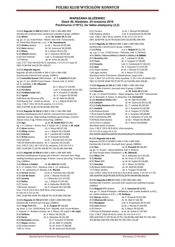 POLSKI KLUB WYŚCIGÓW KONNYCH WARSZAWA SŁUŻEWIEC Dzień 40, Niedziela, 25 września 2016 Pochmurno (+19°C), tor lekko elastyczny (3,2) 1 (322) Nagroda 11 900 zł (6 800–2 720–1 360–680–340) Gonitwa dla 3-letnich koni czystej krwi arabskiej II grupy. (1800m) 1 (6) Mirlet pr.dż. M. Szabla 58 (47,80) og. gn. 3 l. (ur. 8.02) Perkal – Miami, hod. B.M. Tomaszewski, wł. Polski Klub Wiejski Sp. z o.o., tr M. Nowakowski 2 (5) Ondina okulary pr.dż. J. Wyrzyk 56 (47,80) 3 (2) Haris okulary dż. W. Szymczuk 58 (18,00) 4 (1) Matar dż. S. Mazur 58 (12,70) 5 (4) Abduhl okulary dż. S. Vasyutov 58 (45,50) 6 (3) Farid Talatash k.dż. K. Grzybowski 58 (23,90) 7 (7) Mimzy dż. M. Srnec 56 (36,70) Czas: 2'11" (23,5-36-35,8-35,7), wysyłany, 1-1½-2½-1½-szyja-12 ZWC 47,80 PDK 244,30 TRJ 1296,70 2 (323) Nagroda Jaguara Nagroda 18 550 zł (10 600–4 240–2 120–1 060–530) Gonitwa dla 2-letnich koni I grupy. (1300m) 1 (7) Invincible Gunner (IRE) okulary dż. T. Lukášek 57 (6,60) og. gn. 2 l. (ur. 28.04) Frozen Power – Sisceal, hod. G. Smith, wł. D. Jaskólski, tr W. Olkowski 2 (3) Dżumandi dż. S. Mazur 57 (33,40) 3 (2) Persifona k.dż. K. Grzybowski 56 (57,50) 4 (5) Freddyisready (IRE) dż. P. Krowicki 57 (40,00) 5 (1) Ugoda dż. A. Turgaev 56 (59,40) 6 (6) Ravie des Bournais (FR) dż. M. Abík 56 (38,30) 0 (4) Beauty Star - został na starcie st. u. I. Wójcik 56 (65,70) Czas: 1'20,1" (19,2-29-31,9), pewnie, 3-1-2-¾-1½ ZWC 6,50 PDK 41,80 TRJ 96,90 DBL-DWJ BW 3 (324) Nagroda 10 150 zł (5 800–2 320–1 160–580–290) Gonitwa handikapowa dla 4-letnich i starszych koni czystej krwi arabskiej II grupy. Wagi według handikapu generalnego: 5-letnie i starsze minus 5 kg, 4-letnie minus 8 kg. (1800m) 1 (4) Agis pr.dż. M. Szabla 60,5 (15,90) og. s. 5 l. Dahess – Amina, hod. Z. Górski, wł. Z. Górski, tr M. Łojek 2 (1) Ajron okulary dż. S. Mazur 60 (37,10) 3 (3) Olimp okulary st.u. I. Wójcik 59,5 (20,60) 4 (2) Estarion dż. T. Lukášek 60,5 (16,80) 5 (7) Al-Ral okulary dż. P. Krowicki 56 (55,00) 6 (5) Gerhard pr.dż. J. Wyrzyk 56,5 (51,20) 7 (6) GH Wahid (DE) okulary dż. S. Vasyutov 56 (31,60) Czas: 2'07,3" (22,1-34,7-33-37,5), wysyłany, 2-2½-3½-3-4-½ ZWC 15,90 PDK 71,30 TRJ 228,90 TPL 216,20 DBL-DWJ BW 4 (325) Nagroda 10 500 zł (6 000–2 400–1 200–600–300) Gonitwa handikapowa IV grupy dla 3-letnich i starszych koni. Wagi według handikapu generalnego: 4-letnie i starsze plus 8 kg, 3-letnie plus 5 kg. (1800m) 1 (4) Silence is Golden dż. M. Abík 54 (14,00) kl. k. 3 l. Golden Tirol – Sylvatica, hod. E. i K. Laskowscy, wł. E. i K. Laskowscy i A. Wyrzyk, tr A. Wyrzyk 2 (1) Serock okulary pr.dż. D. Pantchev 56,5 (36,20) 3 (5) Just Be Sweet pr.dż. J. Wyrzyk 54 (29,10) 4 (2) Javorka u. J. Balcerska 52,5 (15,50) 5 (3) Rakisz st.u. I. Wójcik 57 (33,20) 6 (7) Tarwin dż. A. Kabardov 58 (65,20) 7 (6) Green Souvenir dż. P. Krowicki 56,5 (41,80) Czas: 1'57,8" (21,4-32,1-33,8-30,5), silnie wysyłany, kr. łeb-2½-½-1¼-1½-4½ ZWC 14,00 PDK 59,90 TRJ 308,00 TPL 50,50 DBL-DWJ BW 5 (326) Nagroda 15 750 zł (9 000–3 600–1 800–900–450) Gonitwa dla 2-letnich koni II grupy. (1000m) 1 (5) Tango Turf (FR) dż. A. Turgaev 57 (16,90) og. kaszt. 2 l. (ur. 20.03) König Turf – Nayada, hod. Ecurie Biraben, E. Vayssier i C. Biraben-Loustau, wł. S. Plavac i M. Łojek, tr M. Łojek 2 (4) Solitaire dż. S. Mazur 56 (10,10) 3 (6) Karen dż. A. Kabardov 56 (31,30) 4 (2) Rainstorm okulary dż. P. Krowicki 57 (50,40) 5 (7) Najaar okulary dż. M. Abík 57 (158,90) 6 (3) Uridao okulary dż. M. Srnec 57 (86,00) 7 (9) Tu i Teraz dż. W. Szymczuk 56 (42,10) Wydział Spraw Hodowlano-Wyścigowych 8 (1) Turnera pr.dż. J. Wyrzyk 56 (206,60) 9 (8) Hadassa okulary k.dż. K. Grzybowski 56 (93,90) Czas: 1'00,5" (30,2-30,3), pewnie, ¾-3½-¾-½-1-2½-1¼-9 ZWC 16,90 PDK 16,70 TRJ 66,60 CZW 252,60 DBL-DWJ BW 6 (327) Nagroda 15 750 zł (9 000–3 600–1 800–900–450) Gonitwa dla 2-letnich koni II grupy. (1400m) 1 (10) Percy st.u. I. Wójcik 57 (21,70) og. c.gn. 2 l. (ur. 27.02) Ecosse – Palixodia, hod. A. Zieliński, wł. A. Zieliński, J. Mierzwa-Zielińska, R. Zieliński, K. Zielińska, tr A. Zielińska 2 (5) Bromsky (GB) dż. T. Lukášek 57 (9,00) 3 (3) Tunis dż. A. Turgaev 57 (18,90) 4 (9) Encanto k.dż. K. Grzybowski 57 (36,10) 5 (6) Spar dż. S. Vasyutov 57 (119,10) 6 (1) Joazar okulary pr.dż. J. Wyrzyk 57 (126,50) 7 (4) Jegor okulary dż. S. Mazur 57 (77,80) Wycofane konie: Shantaram, Illdowhatican, Largo Forte Czas: 1'30,4" (27,4-32-31), silnie wysyłany, ½-2½-1-4½-16-daleko (22) ZWC 21,70 PDK 20,80 TRJ 97,50 TPL 417,50 DBL-DWJ 436,80 7 (328) Nagroda 12 250 zł (7 000–2 800–1 400–700–350) Gonitwa dla 3-letnich i starszych koni III grupy. (1300m) 1 (4) Novelina dż. M. Srnec 60 (23,60) kl. c.gn. 3 l. Grand Presidium – Nowa Aragonia, hod. B.M. Tomaszewski, wł. O. Narowski, R. Świerc, B. Nowacka, tr K. Ziemiański 2 (10) Meadows Kisses (IRE) dż. M. Abík 59 (47,80) 3 (6) Lafayett dż. W. Szymczuk 60 (13,10) 4 (11) Crafty Business (IRE) okulary dż. T. Lukášek 60 (39,50) 5 (7) Sunbird dż. P. Krowicki 61 (34,30) 6 (5) Królowa Grodu dż. A. Turgaev 57 (70,90) 7 (3) So Good So Right (GB) dż. S. Vasyutov 58 (38,80) 8 (2) Triumfatorka (FR) dż. A. Kabardov 57 (121,10) 9 (9) Realy Gold okulary pr.dż. I. Wójcik 56 (98,00) 10 (1) Free-Lu okulary dż. S. Mazur 60 (68,60) Wycofane konie: A'Latune Czas: 1'20,3" (19,5-29,9-30,9), silnie wysyłany, 1¼-½-1-1½-¾-szyja-1¾-½-15 ZWC 23,60 PDK 190,60 TRJ 422,00 CZW 329,10 KWN 3258,20 TPL-DWJ BW DBL-DWJ BW 8 (329) Nagroda Łeb w łeb Nagroda 18 550 zł (10 600–4 240–2 120–1 060–530) Gonitwa dla 3-letnich i starszych koni I grupy. (2800m) 1 (6) Neo dż. P. Krowicki 55 (30,40) og. gn. 3 l. Ecosse – Nowa Nadzieja, hod. K. Mirpuri, wł. Estel Studio Adam Chodowiec, tr W. Olkowski 2 (2) Nikus (FR) dż. A. Kabardov 52,5 (45,20) 3 (3) Novitor dż. M. Srnec 57 (73,50) 4 (5) Thorn (FR) pr.dż. M. Szabla 50 (16,80) 