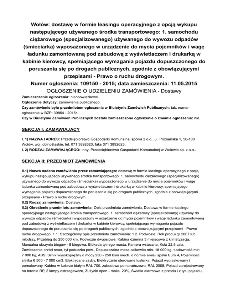 Wołów: dostawę w formie leasingu operacyjnego z opcją wykupu następującego używanego środka transportowego: 1. samochodu ciężarowego (specjalizowanego) używanego do wywozu odpadów (śmieciarka) wyposażonego w urządzenie do mycia pojemników i wagę ładunku zamontowaną pod zabudową z wyświetlaczem i drukarką w kabinie kierowcy, spełniającego wymagania pojazdu dopuszczonego do poruszania się po drogach publicznych, zgodnie z obowiązującymi przepisami - Prawo o ruchu drogowym. Numer ogłoszenia: 109150 - 2015; data zamieszczenia: 11.05.2015 OGŁOSZENIE O UDZIELENIU ZAMÓWIENIA - Dostawy Zamieszczanie ogłoszenia: nieobowiązkowe. Ogłoszenie dotyczy: zamówienia publicznego. Czy zamówienie było przedmiotem ogłoszenia w Biuletynie Zamówień Publicznych: tak, numer ogłoszenia w BZP: 39854 - 2015r. Czy w Biuletynie Zamówień Publicznych zostało zamieszczone ogłoszenie o zmianie ogłoszenia: nie. SEKCJA I: ZAMAWIAJĄCY I. 1) NAZWA I ADRES: Przedsiębiorstwo Gospodarki Komunalnej spółka z o.o., ul. Poznańska 1, 56-100 Wołów, woj. dolnośląskie, tel. 071 3892623, faks 071 3892623. I. 2) RODZAJ ZAMAWIAJĄCEGO: Inny: Przedsiębiorstwo Gospodarki Komunalnej w Wołowie sp. z o.o.. SEKCJA II: PRZEDMIOT ZAMÓWIENIA II.1) Nazwa nadana zamówieniu przez zamawiającego: dostawę w formie leasingu operacyjnego z opcją wykupu następującego używanego środka transportowego: 1. samochodu ciężarowego (specjalizowanego) używanego do wywozu odpadów (śmieciarka) wyposażonego w urządzenie do mycia pojemników i wagę ładunku zamontowaną pod zabudową z wyświetlaczem i drukarką w kabinie kierowcy, spełniającego wymagania pojazdu dopuszczonego do poruszania się po drogach publicznych, zgodnie z obowiązującymi przepisami - Prawo o ruchu drogowym.. II.2) Rodzaj zamówienia: Dostawy. II.3) Określenie przedmiotu zamówienia: Opis przedmiotu zamówienia. Dostawa w formie leasingu operacyjnego następującego środka transportowego: 1. samochód ciężarowy (specjalizowany) używany do wywozu odpadów (śmieciarka) wyposażony w urządzenie do mycia pojemników i wagę ładunku zamontowaną pod zabudową z wyświetlaczem i drukarką w kabinie kierowcy, spełniającego wymagania pojazdu dopuszczonego do poruszania się po drogach publicznych, zgodnie z obowiązującymi przepisami - Prawo ruchu drogowego. 1.1. Szczegółowy opis przedmiotu zamówienia: 1.2. Podwozie: Rok produkcji 2007 lub młodszy, Przebieg do 250 000 km, Podwozie dwuosiowe, Kabina dzienna 3 miejscowa z klimatyzacją, Manualna skrzynia biegów - 8 biegowa, Blokada tylnego mostu, Kamera wsteczna, Koła 22,5 cala, Zawieszenie przód resor, tył poduszka pow., Dopuszczalna masa całkowita min. 18 000 kg, Ładowność min. 7 000 kg, ABS, Silnik wysokoprężny o mocy 230 - 250 koni mech. o normie emisji spalin Euro 4, Pojemność silnika 6 500 - 7 000 cm3, Elektryczne szyby, Elektrycznie sterowane lusterka, Pojazd wypiaskowany i pomalowany, Kabina w kolorze białym RAL 700, zabudowa pomarańczowa, RAL 2008, Pojazd zarejestrowany na terenie RP, 2 lampy ostrzegawcze, Zużycie opon - maks. 20%, Światła alarmowe z przodu i z tyłu pojazdu, Tachograf z aktualną legalizacją, Sygnalizator dźwiękowy dla włączonego biegu wstecznego, Pojazd zarejestrowany i ubezpieczony w dniu odbioru. 1.3. Zabudowa: Zabudowa jednokomorowa o pojemności 14-15 m3 wyprodukowana najpóźniej w tym samym roku jak podwozie samochodu, Prasa ze zgniotem liniowym minimum x4, Niski zasyp przystosowany do opróżniania pojemników 110 -1 100 l, 2 stopnie dla ładowaczy, Światło ostrzegawcze na zabudowie, Możliwość regulacji siły zgniotu w zależności od wyboru frakcji odpadów , sterowane z pulpitu w kabinie kierowcy, Waga ładunku zamontowana pod zabudową z wyświetlaczem i drukarką w kabinie kierowcy - zalegalizowana (świadectwo legalizacji na okres 2 lat wystawione na Zamawiającego). 1.4. Urządzenie do mycia pojemników z osprzętem i wyposażeniem: Zbiornik na czystą wodę (pojemność dostosowana do warunków zabudowy w podwoziu od 300 do 500 l), Pompa wysokociśnieniowa do 120 - 150 bar i wydajność około 15 l/min, Wysokociśnieniowy pistolet do mycia pojemników zewnątrz, z ciśnieniem min. 120 bar, wąż min. 10 m, Zawijak bębnowy wąż z wężem o min. długości 15 m, Pulpit do załączania urządzenia do mycia pojemników, Urządzenie przystosowane do mycia pojemników o poj. od 0,11 m3 do 1,1 m3 i innych urządzeń na odpady ze zwijakiem węża. 1.5. Wyposażenie dodatkowe: Koło zapasowe, Podnośnik hydrauliczny min. 10 T, Klucz do kół, Apteczka, Gaśnica, Trójkąt ostrzegawczy. 1.6. Wykonawca udziela minimum 6 miesięcznej gwarancji na pojazd: podwozie wraz z zabudową. 1.7. Kolorystyka: - kabina RAL 700 biała, zabudowa RAL 2008 pomarańcz soczysty, podwozie szare lub czarne. 2. Stan formalno-prawny pojazdu określony w punkcie 1 opisu przedmiotu zamówienia: - w pełni udokumentowane, legalne pochodzenie pojazdu. 3. Pojazd zarejestrowany na terenie Rzeczypospolitej Polskiej w dniu odbioru pojazdu od Wykonawcy. 4. Pojazd: podwozie wraz z zabudową i wyposażeniem dodatkowym w osprzęt (urządzenia) wymienione w dziale IV SIWZ w 100% przygotowany do pracy, kompletny, sprawny technicznie, zarejestrowany w Polsce zgodnie z przeznaczeniem użytkowania. 5. Stan techniczny: w pełni przygotowany do użytkowania (do pracy). 6. Gwarancja, bez wyłączeń, na cały pojazd wraz z zabudową z minimum określonym w opisie przedmiotu zamówienia. 7. Pojazd musi posiadać ocenę i wycenę Rzeczoznawcy majątkowego uprawnionego z dziedziny motoryzacji. Wykonawca zobowiązany jest dostarczyć przedmiot zamówienia na swój koszt i na własne ryzyko na adres Zamawiającego (ul. Poznańska l, 56-100 Wołów), gdzie dokona rozruchu oraz przeszkoli pracowników z obsługi urządzenia. Miejsce serwisowania w ramach udzielonej gwarancji - Przedsiębiorstwo Gospodarki Komunalnej w Wołowie Sp. z o.o. przy ul. Poznański