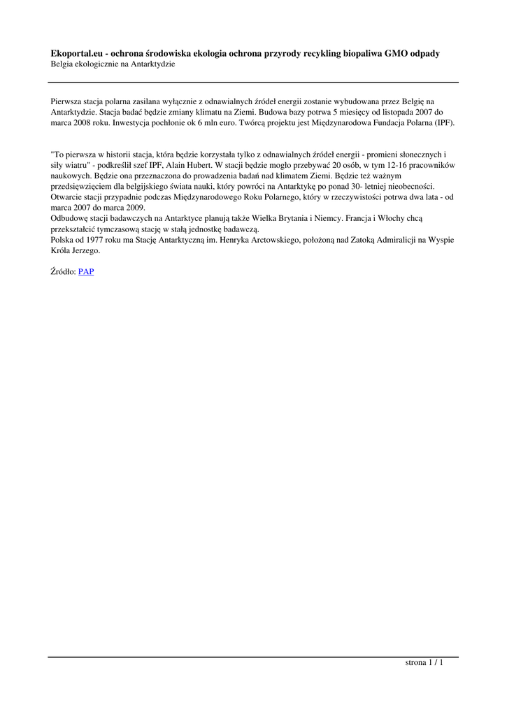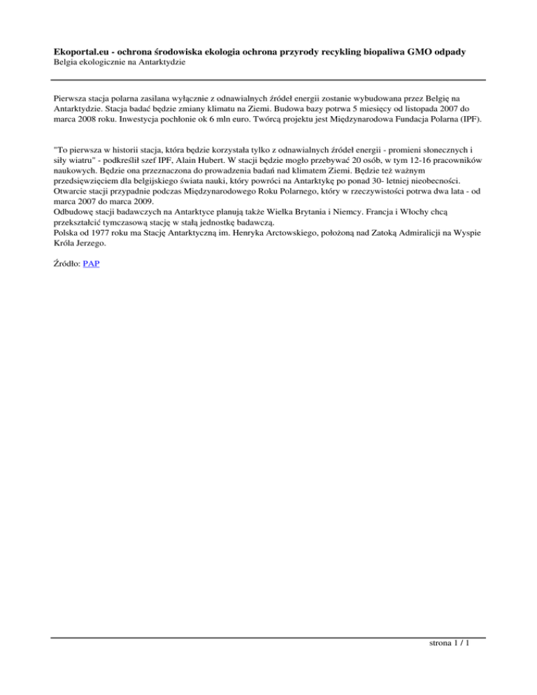 Ekoportal.eu - ochrona środowiska ekologia ochrona przyrody recykling biopaliwa GMO odpady Belgia ekologicznie na Antarktydzie Pierwsza stacja polarna zasilana wyłącznie z odnawialnych źródeł energii zostanie wybudowana przez Belgię na Antarktydzie. Stacja badać będzie zmiany klimatu na Ziemi. Budowa bazy potrwa 5 miesięcy od listopada 2007 do marca 2008 roku. Inwestycja pochłonie ok 6 mln euro. Twórcą projektu jest Międzynarodowa Fundacja Polarna (IPF). "To pierwsza w historii stacja, która będzie korzystała tylko z odnawialnych źródeł energii - promieni słonecznych i siły wiatru" - podkreślił szef IPF, Alain Hubert. W stacji będzie mogło przebywać 20 osób, w tym 12-16 pracowników naukowych. Będzie ona przeznaczona do prowadzenia badań nad klimatem Ziemi. Będzie też ważnym przedsięwzięciem dla belgijskiego świata nauki, który powróci na Antarktykę po ponad 30- letniej nieobecności. Otwarcie stacji przypadnie podczas Międzynarodowego Roku Polarnego, który w rzeczywistości potrwa dwa lata - od marca 2007 do marca 2009. Odbudowę stacji badawczych na Antarktyce planują także Wielka Brytania i Niemcy. Francja i Włochy chcą przekształcić tymczasową stację w stałą jednostkę badawczą. Polska od 1977 roku ma Stację Antarktyczną im. Henryka Arctowskiego, położoną nad Zatoką Admiralicji na Wyspie Króla Jerzego. Źródło: PAP strona 1 / 1