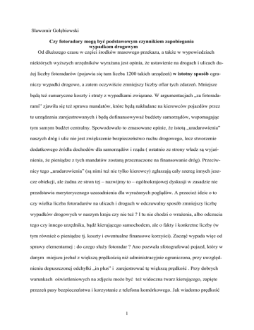 Sławomir Gołębiowski Czy fotoradary mogą być podstawowym czynnikiem zapobiegania wypadkom drogowym Od dłuższego czasu w części środków masowego przekazu, a także w wypowiedziach niektórych wyższych urzędników wyrażana jest opinia, że ustawienie na drogach i ulicach dużej liczby fotoradarów (pojawia się tam liczba 1200 takich urządzeń) w istotny sposób ograniczy wypadki drogowe, a zatem oczywiście zmniejszy liczby ofiar tych zdarzeń. Mniejsze będą też sumaryczne koszty i straty z wypadkami związane. W argumentacjach „za fotoradarami” zjawiła się też sprawa mandatów, które będą nakładane na kierowców pojazdów przez te urządzenia zarejestrowanych i będą dofinansowywać budżety samorządów, wspomagając tym samym budżet centralny. Spowodowało to zmasowane opinie, że istotą „uradarowienia” naszych dróg i ulic nie jest zwiększenie bezpieczeństwo ruchu drogowego, lecz stworzenie dodatkowego żródła dochodów dla samorządów i rządu ( ostatnio ze strony władz są wyjaśnienia, że pieniądze z tych mandatów zostaną przeznaczone na finansowanie dróg). Przeciwnicy tego „uradarowienia” (są nimi też nie tylko kierowcy) zgłaszają cały szereg innych jeszcze obiekcji, ale żadna ze stron tej – nazwijmy to – ogólnokrajowej dyskusji w zasadzie nie przedstawia merytorycznego uzasadnienia dla wyrażanych poglądów. A przecież idzie o to czy wielka liczba fotoradarów na ulicach i drogach w odczuwalny sposób zmniejszy liczbę wypadków drogowych w naszym kraju czy nie też ? I tu nie chodzi o wrażenia, albo odczucia tego czy innego urzędnika, bądż kierującego samochodem, ale o fakty i konkretne liczby (w tym również o pieniądze tj. koszty i ewentualne finansowe korzyści). Zacząć wypada więc od sprawy elementarnej : do czego służy fotoradar ? Ano pozwala sfotografować pojazd, który w danym miejscu jechał z większą prędkością niż administracyjnie ograniczona, przy uwzględnieniu dopuszczonej odchyłki „in plus” i zarejestrować tę większą prędkość . Przy dobrych warunkach oświetleniowych na zdjęciu może być też widoczna twarz kierującego, zapięte przezeń pasy bezpieczeństwa i korzystanie z telefonu komórkowego. Jak wiadomo prędkość 1 administracyjnie ograniczona w przepisach ruchu drogowego określona jest nazwą „prędkość dopuszczalna” . W oczywisty sposób nasuwa się pytanie czy prędkość dopuszczalna jest tożsama z prędkością bezpieczną ? Niestety nie ! Prędkością bezpieczną jest zawsze prędkość dostosowana do aktualnych warunków drogowo-ruchowych, czyli: stanu drogi, natężenia ruchu i rodzaju jego uczestników, rodzaju i gęstości zabudowy w rejonie drogi , warunków atmosferycznych oraz widoczności itp. , czyli tych wszystkich czynników, które pozwalają na ocenienie przez kierującego pojazdem z jaką w danej chwili prędkością powinien jechać, by w przypadku pojawienia się sytuacji grożącej wypadkiem był w stanie wykonać skuteczne działania obronne (tj. zapobiegające wypadkowi). Oczywiście milczącym założeniem jest tu prawidłowa sprawność psychofizyczna kierującego. Ten nieco długi wywód był konieczny dla możliwie klarownego wyjaśnienia różnicy pomiędzy prędkością dopuszczalną i prędkością bezpieczną, bowiem wydaje się, że część uczestników dyskusji o fotoradarach nie zdaje sobie sprawy z konieczności rozróżniania obu tych prędkości. Aby to było jeszcze wyraźniej przestawione możnaby podać np. że w jakimś miejscu prędkość dopuszczalna jest określona znakiem drogowym na 40 km/h i w danym czasie pada marznący deszcz – jest oczywiste że jazda z prędkościa bliską dopuszczalnej grozi wpadnięciem w poślizg i wypadkiem, a prędkość bezpieczna jest znacznie poniżej dopuszczonej tym znakiem. Dlaczego zatem stosowana jest prędkość dopuszczalna, skoro nie jest jednoznaczna z bezpieczną ? Jest ona stosowana jako pewne poinformowanie kierującego pojazdem o istnieniu w danym miejscu (rejonie, miejscowości) prawdopodobieństwa powstania sytuacji grożącej wypadkiem oraz – przez nakaz jazdy z prędkością nieprzekraczającą dopuszczalnej – zwiększenie szansy na uniknięcie wywypadku, jeśli powstanie grożba takiego zdarzenia. Czy zatem fotoradary , będące podstawowo urządzeniami rejestrującymi przekraczanie prędkości dopuszczalnej, będą wpływały w zauważalny sposób na zmniejszenie liczby wypadków ? Odwołać się tu trzeba do statystyki wypadków drogowych – przede wszystkim w statystyce tej nie figuruje prędkośc dopuszczalna 2 jako przyczyna wypadków drogowych, natomiast figuruje tam w tym względzie prędkość niedostosowana do warunków ruchu i jest jej – jako przyczynie - przypisanych 28,5 % z wypadków, spowodowanych przez kierujących pojazdami (wg danych statystycznych za 2011 rok). Przed laty, gdy przekraczanie prędkości dopuszczalnej było wskazywane jako przyczyna wypadków, odpowiedni procent zawierał się w granicach 5 – 7. Można zasadnie przyjąć, że jeśli w oficjalnej statystyce nie występuje przekroczenie prędkości dopuszczalnej jako przyczyny wypadków, to nie było podstaw, by tę prędkość tak oceniać. Działając przez ponad 25 lat jako biegły sądowy w zakresie wypadków drogowych nie spotkałem się z przypadkiem, w którym mógłbym podać jako przyczynę wypadku przekroczenie prędkości dopuszczalnej, co najwyżej mogła ona być współprzyczyną. I można z dużym prawdopodobieństwem twierdzić, że byłby to nikły procent wypadków, spowodowanych przez kierujących pojazdami. A warto w tym miejscu podać, że nieprawidłowe działania kierujących pojazdami, takie jak: nieprzestrzeganie pierwszeństwa, nieprawidłowe wyprzedzanie, wadliwe omijanie i wymijanie czy zmiana pasa ruchu itp. są wg danych statystycznych za 2011 rok przyczyną ok. 67 % wypadków, spowodowanych przez kierujących pojazdami. I tu jest głów