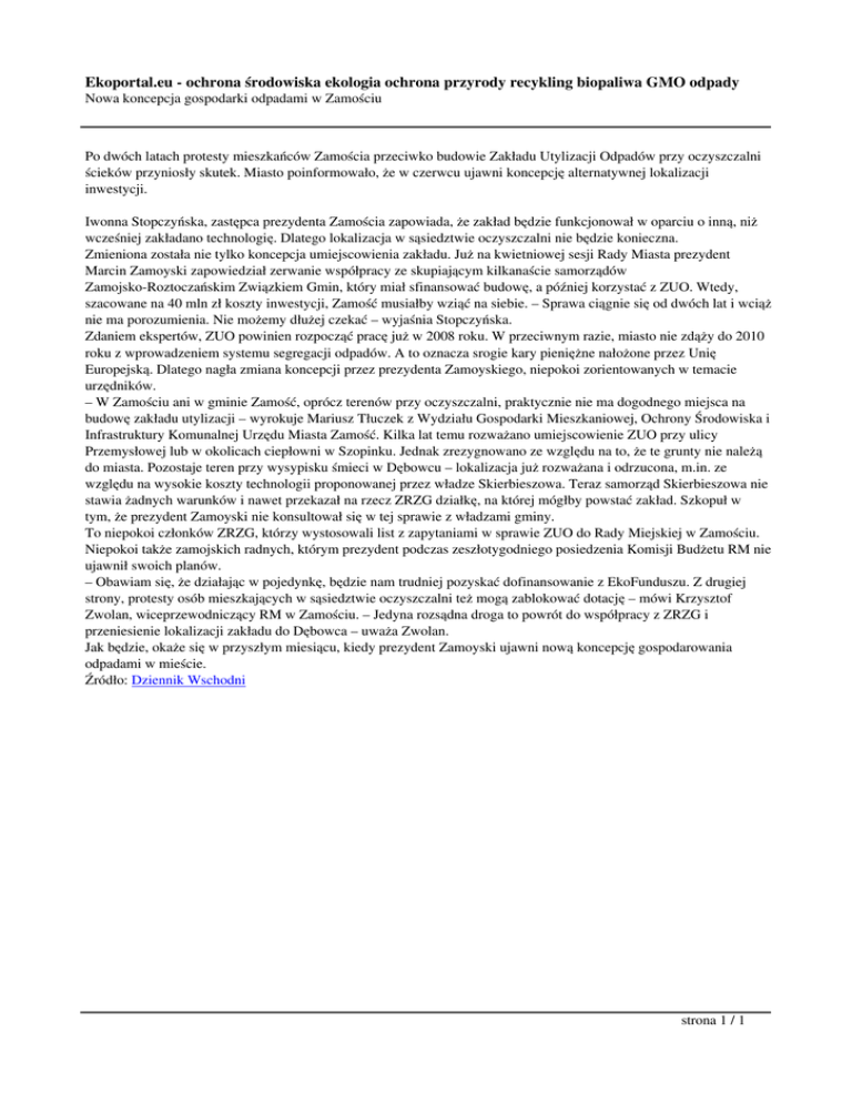 Ekoportal.eu - ochrona środowiska ekologia ochrona przyrody recykling biopaliwa GMO odpady Nowa koncepcja gospodarki odpadami w Zamościu Po dwóch latach protesty mieszkańców Zamościa przeciwko budowie Zakładu Utylizacji Odpadów przy oczyszczalni ścieków przyniosły skutek. Miasto poinformowało, że w czerwcu ujawni koncepcję alternatywnej lokalizacji inwestycji. Iwonna Stopczyńska, zastępca prezydenta Zamościa zapowiada, że zakład będzie funkcjonował w oparciu o inną, niż wcześniej zakładano technologię. Dlatego lokalizacja w sąsiedztwie oczyszczalni nie będzie konieczna. Zmieniona została nie tylko koncepcja umiejscowienia zakładu. Już na kwietniowej sesji Rady Miasta prezydent Marcin Zamoyski zapowiedział zerwanie współpracy ze skupiającym kilkanaście samorządów Zamojsko-Roztoczańskim Związkiem Gmin, który miał sfinansować budowę, a później korzystać z ZUO. Wtedy, szacowane na 40 mln zł koszty inwestycji, Zamość musiałby wziąć na siebie. – Sprawa ciągnie się od dwóch lat i wciąż nie ma porozumienia. Nie możemy dłużej czekać – wyjaśnia Stopczyńska. Zdaniem ekspertów, ZUO powinien rozpocząć pracę już w 2008 roku. W przeciwnym razie, miasto nie zdąży do 2010 roku z wprowadzeniem systemu segregacji odpadów. A to oznacza srogie kary pieniężne nałożone przez Unię Europejską. Dlatego nagła zmiana koncepcji przez prezydenta Zamoyskiego, niepokoi zorientowanych w temacie urzędników. – W Zamościu ani w gminie Zamość, oprócz terenów przy oczyszczalni, praktycznie nie ma dogodnego miejsca na budowę zakładu utylizacji – wyrokuje Mariusz Tłuczek z Wydziału Gospodarki Mieszkaniowej, Ochrony Środowiska i Infrastruktury Komunalnej Urzędu Miasta Zamość. Kilka lat temu rozważano umiejscowienie ZUO przy ulicy Przemysłowej lub w okolicach ciepłowni w Szopinku. Jednak zrezygnowano ze względu na to, że te grunty nie należą do miasta. Pozostaje teren przy wysypisku śmieci w Dębowcu – lokalizacja już rozważana i odrzucona, m.in. ze względu na wysokie koszty technologii proponowanej przez władze Skierbieszowa. Teraz samorząd Skierbieszowa nie stawia żadnych warunków i nawet przekazał na rzecz ZRZG działkę, na której mógłby powstać zakład. Szkopuł w tym, że prezydent Zamoyski nie konsultował się w tej sprawie z władzami gminy. To niepokoi członków ZRZG, którzy wystosowali list z zapytaniami w sprawie ZUO do Rady Miejskiej w Zamościu. Niepokoi także zamojskich radnych, którym prezydent podczas zeszłotygodniego posiedzenia Komisji Budżetu RM nie ujawnił swoich planów. – Obawiam się, że działając w pojedynkę, będzie nam trudniej pozyskać dofinansowanie z EkoFunduszu. Z drugiej strony, protesty osób mieszkających w sąsiedztwie oczyszczalni też mogą zablokować dotację – mówi Krzysztof Zwolan, wiceprzewodniczący RM w Zamościu. – Jedyna rozsądna droga to powrót do współpracy z ZRZG i przeniesienie lokalizacji zakładu do Dębowca – uważa Zwolan. Jak będzie, okaże się w przyszłym miesiącu, kiedy prezydent Zamoyski ujawni nową koncepcję gospodarowania odpadami w mieście. Źródło: Dziennik Wschodni strona 1 / 1