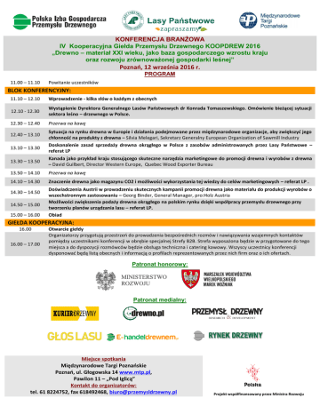 KONFERENCJA BRANŻOWA IV Kooperacyjna Giełda Przemysłu Drzewnego KOOPDREW 2016 „Drewno – materiał XXI wieku, jako baza gospodarczego wzrostu kraju oraz rozwoju zrównoważonej gospodarki leśnej” Poznań, 12 września 2016 r. PROGRAM 11.00 – 11.10 Powitanie uczestników BLOK KONFERENCYJNY: 11.10 – 12.10 Wprowadzenie - kilka słów o każdym z obecnych 12.10 - 12.30 Wystąpienie Dyrektora Generalnego Lasów Państwowych dr Konrada Tomaszewskiego. Omówienie bieżącej sytuacji sektora leśno – drzewnego w Polsce. 12.30 – 12.40 Przerwa na kawę 12.40 – 13.10 13.10 – 13.30 Sytuacja na rynku drewna w Europie i działania podejmowane przez międzynarodowe organizacje, aby zwiększyć jego chłonność na produkty z drewna – Silvia Melegari, Sekretarz Generalny European Organization of Sawmill Industry Doskonalenie zasad sprzedaży drewna okrągłego w Polsce z zasobów administrowanych przez Lasy Państwowe – referat LP 13.30 – 13.50 Kanada jako przykład kraju stosującego skuteczne narzędzia marketingowe do promocji drewna i wyrobów z drewna – David Guilbert, Director Western Europe, Quebec Wood Exporter Bureau 13.50 – 14.10 Przerwa na kawę 14.10 – 14.30 Znaczenie drewna jako magazynu CO2 i możliwości wykorzystania tej wiedzy do celów marketingowych – referat LP . 14.30 – 14.50 14.50 – 15.00 15.00 – 16.00 Doświadczenia Austrii w prowadzeniu skutecznych kampanii promocji drewna jako materiału do produkcji wyrobów o wszechstronnym zastosowaniu – Georg Binder, General Manager, pro:Holz Austria Możliwości zwiększenia podaży drewna okrągłego na polskim rynku dzięki współpracy przemysłu drzewnego przy tworzeniu planów urządzania lasu – referat LP. Obiad GIEŁDA KOOPERACYJNA: 16.00 16.00 – 17.00 Otwarcie giełdy Organizatorzy przygotują przestrzeń do prowadzenia bezpośrednich rozmów i nawiązywania wzajemnych kontaktów pomiędzy uczestnikami konferencji w obrębie specjalnej Strefy B2B. Strefa wyposażona będzie w przygotowane do tego miejsca a do dyspozycji rozmówców będzie obsługa techniczna i catering kawowy. Wszyscy uczestnicy konferencji dysponować będą listą obecnych i informacją o profilach reprezentowanych przez nich firm oraz o ich ofertach. Patronat honorowy: Patronat medialny: Miejsce spotkania Międzynarodowe Targi Poznańskie Poznań, ul. Głogowska 14 www.mtp.pl, Pawilon 11 – „Pod Iglicą” Kontakt do organizatorów: tel. 61 8224752, fax 618492468, [email protected] Projekt współfinansowany przez Ministra Rozwoju