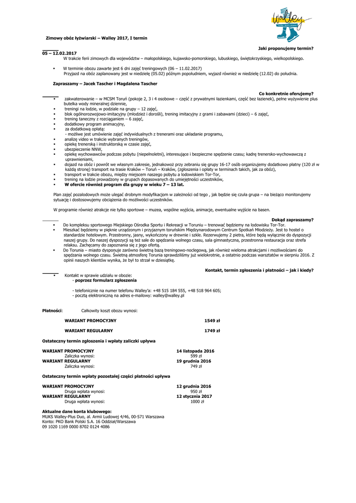 Zimowy obóz łyżwiarski – Walley 2017, I termin Jaki proponujemy termin? 05 – 12.02.2017 W trakcie ferii zimowych dla województw – małopolskiego, kujawsko-pomorskiego, lubuskiego, świętokrzyskiego, wielkopolskiego. W terminie obozu zawarte jest 6 dni zajęć treningowych (06 – 11.02.2017) Przyjazd na obóz zaplanowany jest w niedzielę (05.02) późnym popołudniem, wyjazd również w niedzielę (12.02) do południa. Zapraszamy – Jacek Tascher i Magdalena Tascher Co konkretnie oferujemy? zakwaterowanie – w MCSM Toruń (pokoje 2, 3 i 4 osobowe – część z prywatnymi łazienkami, część bez łazienek), pełne wyżywienie plus butelka wody mineralnej dziennie, treningi na lodzie, w podziale na grupy – 12 zajęć, blok ogólnorozwojowo-imitacyjny (młodzież i dorośli), trening imitacyjny z grami i zabawami (dzieci) – 6 zajęć, trening taneczny z rozciąganiem – 6 zajęć, dodatkowy program animacyjny, za dodatkową opłatą: - możliwe jest umówienie zajęć indywidualnych z trenerami oraz układanie programu, analizę video w trakcie wybranych treningów, opiekę trenerską i instruktorską w czasie zajęć, ubezpieczenie NNW, opiekę wychowawców podczas pobytu (niepełnoletni), interesujące i bezpieczne spędzenie czasu; kadrę trenersko-wychowawczą z uprawnieniami, dojazd na obóz i powrót we własnym zakresie, jednakowoż przy zebraniu się grupy 16-17 osób organizujemy dodatkowo płatny (120 zł w każdą stronę) transport na trasie Kraków – Toruń – Kraków, (zgłoszenia i opłaty w terminach takich, jak za obóz), transport w trakcie obozu, między miejscem naszego pobytu a lodowiskiem Tor-Tor, trening na lodzie prowadzony w grupach dopasowanych do umiejętności uczestników, W ofercie również program dla grupy w wieku 7 – 13 lat. Plan zajęć pozalodowych może ulegać drobnym modyfikacjom w zależności od tego , jak będzie się czuła grupa – na bieżąco monitorujemy sytuację i dostosowujemy obciążenia do możliwości uczestników. W programie również atrakcje nie tylko sportowe – muzea, wspólne wyjścia, animacje, ewentualne wyjście na basen. Dokąd zapraszamy? Do kompleksu sportowego Miejskiego Ośrodka Sportu i Rekreacji w Toruniu – trenować będziemy na lodowisku Tor-Tor. Mieszkać będziemy w pięknie urządzonym i przyjaznym toruńskim Międzynarodowym Centrum Spotkań Młodzieży. Jest to hostel o standardzie hotelowym. Przestronny, jasny, wykończony w drewnie i szkle. Rezerwujemy 2 pietra, które będą wyłącznie do dyspozycji naszej grupy. Do naszej dyspozycji są też sale do spędzania wolnego czasu, sala gimnastyczna, przestronna restauracja oraz strefa relaksu. Zachęcamy do zapoznania się z jego ofertą. Do Torunia – miasto dysponuje zarówno świetną bazą treningowo-noclegową, jak również wieloma atrakcjami i możliwościami do spędzania wolnego czasu. Świetną atmosferę Torunia sprawdziliśmy już wielokrotnie, a ostatnio podczas warsztatów w sierpniu 2016. Z opinii naszych klientów wynika, że był to strzał w dziesiątkę. Kontakt, termin zgłoszenia i płatności – jak i kiedy? Kontakt w sprawie udziału w obozie: - poprzez formularz zgłoszenia - telefonicznie na numer telefonu Walley’a: +48 515 184 555, +48 518 964 605; - pocztą elektroniczną na adres e-mailowy: [email protected] Płatności: Całkowity koszt obozu wynosi: WARIANT PROMOCYJNY 1549 zł WARIANT REGULARNY 1749 zł Ostateczny termin zgłoszenia i wpłaty zaliczki upływa WARIANT PROMOCYJNY Zaliczka wynosi: WARIANT REGULARNY Zaliczka wynosi: 14 listopada 2016 599 zł 19 grudnia 2016 749 zł Ostateczny termin wpłaty pozostałej części płatności upływa WARIANT PROMOCYJNY Druga wpłata wynosi: WARIANT REGULARNY Druga wpłata wynosi: Aktualne dane konta klubowego: MUKS Walley-Plus Duo, al. Armii Ludowej 4/46, 00-571 Warszawa Konto: PKO Bank Polski S.A. 16 Oddział/Warszawa 09 1020 1169 0000 8702 0124 4086 12 grudnia 2016 950 zł 12 stycznia 2017 1000 zł