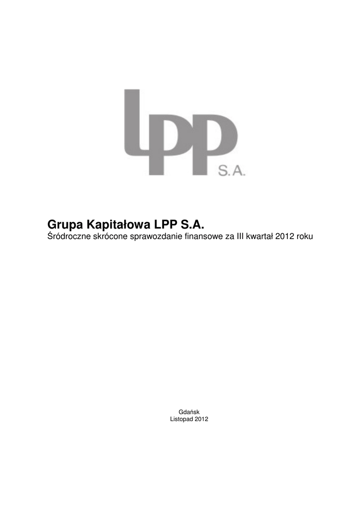 Grupa Kapitałowa LPP S.A. Śródroczne skrócone sprawozdanie finansowe za III kwartał 2012 roku Gdańsk Listopad 2012 Grupa Kapitałowa LPP S.A. Śródroczne skrócone sprawozdanie finansowe za III kwartał 2012 roku Sprawozdanie sporządzono w tys. zł. _____________________________________________________________________________________________________ 1. Wybrane skonsolidowane dane finansowe GK LPP S.A. 3 kw. 2012 3 kw. 2011 01.07.2012- 01.07.201130.09.2012 30.09.2011 w tys. zł Wybrane skonsolidowane dane finansowe Przychody netto ze sprzedaży produktów, towarów i materiałów Zysk (strata) z działalności operacyjnej w tys. zł. 3 kw. 2012 3 kw. 2011 01.07.2012- 01.07.201130.09.2012 30.09.2011 w tys. EUR 2 261 646 1 703 234 539 155 421 457 269 334 175 709 64 207 43 478 Zysk (strata) brutto 246 907 174 380 58 860 43 149 Zysk (strata) netto Przepływy pieniężne netto z działalności operacyjnej Przepływy pieniężne netto z działalności inwestycyjnej Przepływy pieniężne netto z działalności finansowej 206 435 139 433 49 212 34 502 188 429 20 721 44 920 5 127 -166 782 4 049 -39 759 1 002 -53 812 -72 500 -12 828 -17 940 -32 165 -47 730 -7 668 -11 811 Przepływy pieniężne netto, razem III kw. 2012 III kw. 2011 01.07.2012- 01.07.201130.09.2012 30.09.2011 w tys. zł 1 777 978 1 481 839 Wybrane skonsolidowane dane finansowe Aktywa razem w tys. zł. III kw. 2012 III kw. 2011 01.07.2012- 01.07.201130.09.2012 30.09.2011 w tys. EUR 432 198 335 927 Zobowiązania długoterminowe 147 781 203 850 35 923 46 212 Zobowiązania krótkoterminowe 566 349 503 306 137 671 114 097 1 063 848 774 683 258 605 175 617 3 662 3 555 890 806 1 771 063 1 743 540 1 771 063 1 743 540 Zysk (strata) na jedną akcję zwykłą (w zł / EUR) 116,6 80,0 30,3 19,9 Wartość księgowa na jedną akcję (w zł / EUR) Zadeklarowana lub wypłacona dywidenda na jedną akcję (w zł/EUR) 600,7 444,3 152,6 108,8 77,36 76,86 18,44 19,02 Kapitał własny Kapitał podstawowy Średnia ważona liczba akcji zwykłych 1 Grupa Kapitałowa LPP S.A. Śródroczne skrócone sprawozdanie finansowe za III kwartał 2012 roku Sprawozdanie sporządzono w tys. zł. _____________________________________________________________________________________________________ 2. Skonsolidowany bilans GK LPP S.A. w tys. zł. Stan na koniec: poprzedniego III kw. 2012 III kw. 2011 roku 30.09.2012 30.09.2011 31.12.2011 Bilans AKTYWA Aktywa trwałe (długoterminowe) 830 204 719 776 744 937 1. Rzeczowe aktywa trwałe 527 607 428 316 447 725 11 903 10 982 11 515 183 609 183 609 183 609 77 508 77 508 77 508 186 187 186 0 19 19 665 682 678 5 782 1 082 4 549 22 310 17 099 18 669 634 292 479 Aktywa obrotowe (krótkoterminowe) 947 774 762 063 868 931 1. Zapasy 658 204 553 613 594 606 2. Należności z tytułu dostaw i usług 135 577 100 660 114 313 406 3 277 1 936 59 191 38 223 31 402 118 184 167 6. Inne papiery wartościowe 0 0 0 7. Inne aktywa finansowe 0 9 418 0 9 477 7 948 9 541 84 801 48 740 116 966 1 777 978 1 481 839 1 613 868 2. Wartości niematerialne 3. Wartość firmy 4. Znak towarowy 5. Udziały w jednostkach zależnych 6. Inwestycje w jednostkach stowarzyszonych 7. Inwestycje w nieruchomości 8. Należności i pożyczki 9. Aktywa z tytułu podatku odroczonego 10. Rozliczenia międzyokresowe 3. Należności z tytułu podatku dochodowego 4. Pozostałe należności 5. Pożyczki 8. Rozliczenia międzyokresowe 9. Środki pieniężne i ich ekwiwalenty Aktywa RAZEM 2 Grupa Kapitałowa LPP S.A. Śródroczne skrócone sprawozdanie finansowe za III kwartał 2012 roku Sprawozdanie sporządzono w tys. zł. _____________________________________________________________________________________________________ w tys. zł. Stan na koniec: poprzedniego III kw. 2012 III kw. 2011 roku 30.09.2012 30.09.2011 31.12.2011 Bilans PASYWA Kapitał własny 1 063 848 774 683 909 194 3 662 3 555 3 555 2. Akcje własne -48 764 -48 757 -48 759 3. Kapitał ze sprzedaży akcji powyżej ich wartości nominalnej 235 069 149 829 149 829 4. Pozostałe kapitały 656 294 561 433 562 429 -2 905 -8 607 -4 537 217 839 114 685 243 977 12 558 -24 748 -24 748 205 281 139 433 268 725 2 653 2 545 2 700 Zobowiązania długoterminowe 147 781 203 850 89 356 1. Kredyty bankowe i pożyczki 143 112 118 159 86 446 0 82 693 0 99 48 31 4. Rezerwy z tytułu świadczeń pracowniczych 1 263 1 132 1 135 5. Rezerwa z tytułu odroczonego podatku 3 208 1 798 1 685 99 20 59 Zobowiązania krótkoterminowe 566 349 503 306 615 318 1. Zobowiązania z tytułu dostaw i usług oraz pozostałe zobowiązania 374 365 285 140 377 512 10 101 2 114 12 179 164 621 204 451 117 749 1. Kapitał podstawowy 5. Różnice kursowe z przeliczania jednostek 6. Zyski zatrzymane - zysk (strata) z lat ubiegłych - zysk (strata) netto bieżącego okresu 7. Udziały mniejszości 2. Emisja dłużnych papierów wartościowych 3. Inne zobowiązania finansowe 6. Inne zobowiązania długoterminowe 2. Zobowiązania z tytułu podatku dochodowego 3. Kredyty bankowe i pożyczki 4. Emisja dłużnych papierów wartościowych 5. Inne zobowiązania finansowe 6. Rezerwy 7. Fundusze specjalne 8. Rozliczenia międzyokresowe Pasywa RAZEM 3 0 1 362 86 243 30 51 54 11 522 7 092 14 665 340 391 296 5 370 2 705 6 620 1 777 978 1 481 839 1 613 868 Grupa Kapitałowa LPP S.A. Śródroczne skrócone sprawozdanie finansowe za III kwartał 2012 roku Sprawozdanie sporządzono w tys. zł. _____________________________________________________________________________________________________ 3. Jednolite skonsolidowane sprawozdanie z całkowitych dochodów GK LPP S.A. w tys. zł. Narastająco III kw. 2012 Narastająco III kw. 2011 01.01.2012- 01.07.2012- 01.01.2011- 01.07.201130.09.2012 30.09.2012 30.09.2011 30.09.2011 Sprawozdanie z całkowitych dochodów Działalność kontynuowana Przychody ze sprzedaży 2 261 646 843 592 1 703 234 622 232 Koszt własny sprzedaży 1 012 996 377 406 754 782 273 708 Zysk (Strata) brutto na sprzedaży 1 248 650 466 186 948 452 348 5