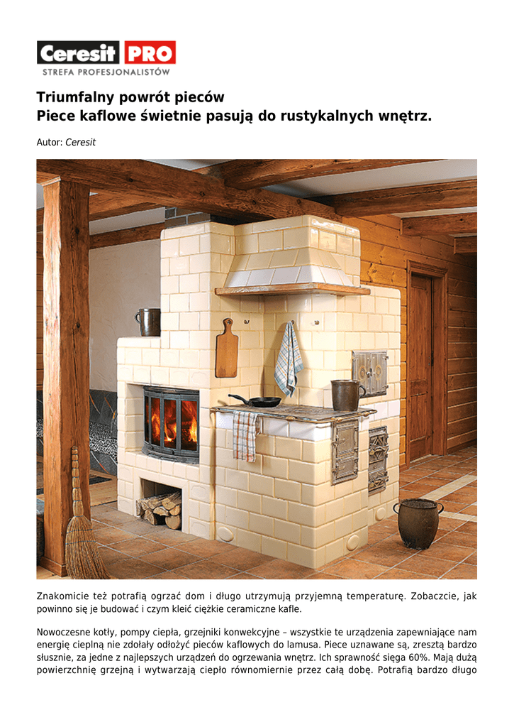 Triumfalny powrót pieców Piece kaflowe świetnie pasują do rustykalnych wnętrz. Autor: Ceresit Znakomicie też potrafią ogrzać dom i długo utrzymują przyjemną temperaturę. Zobaczcie, jak powinno się je budować i czym kleić ciężkie ceramiczne kafle. Nowoczesne kotły, pompy ciepła, grzejniki konwekcyjne – wszystkie te urządzenia zapewniające nam energię cieplną nie zdołały odłożyć pieców kaflowych do lamusa. Piece uznawane są, zresztą bardzo słusznie, za jedne z najlepszych urządzeń do ogrzewania wnętrz. Ich sprawność sięga 60%. Mają dużą powierzchnię grzejną i wytwarzają ciepło równomiernie przez całą dobę. Potrafią bardzo długo utrzymywać komfortową temperaturę w pomieszczeniach. Są również ekonomiczne w eksploatacji. Kilka drew dostarczy ciepła na pół doby. To, co dla jednych jest największą wadą pieców kaflowych, dla innych jest ich kolejną zaletą. Chodzi o staroświecki wygląd. Przyznać trzeba, że trudno dobrać taki piec do surowego, nowoczesnego wnętrza, ale przy odrobinie determinacji i to może się udać. Z pewnością jednak kaflowe kolosy idealnie pasują do domów z bali, drewnianych domów letniskowych, budynków o wnętrzach stylowych lub rustykalnych. Jak sama nazwa wskazuje, w piecach można też piec – np. chleb lub mięso. Kanałowe i bezkanałowe Producenci pieców kaflowych oferują dwa ich rodzaje: ● ● kanałowe – które mają wewnątrz sieć kanałów, potrzebnych do tego, żeby droga ciepłych spalin była jak najdłuższa. Skutecznie ogrzewają one wtedy ścianki pieca, które akumulują ciepło i oddają je wolno do otoczenia. Układ kanałów bywa często bardzo skomplikowany, co nie zawsze jest wskazane, bo powoduje nierównomierne rozgrzewanie się pieca. bezkanałowe – są wydajniejsze i ekonomiczniejsze od kanałowych, bo lepiej potrafią wykorzystać energię spalin. Zamiast sieci kanałów mają obszerną komorę spalania, w której gazy mieszają się i reagują wzajemnie, przez co spalanie jest dokładniejsze, a zużycie opału mniejsze. Wlot do komina znajduje się w dolnej części pieca. Trafiają do niego tylko najzimniejsze spaliny. Od fundamentu do kafli Piec musi stanąć nie dalej niż w odległości 2 m od przewodu kominowego, z którym zostanie połączony tak zwanym czopuchem. Z racji dużej masy pod piec powinien być przewidziany fundament lub wzmocnienie podłogi na gruncie albo stropu, gdy miejsce jego lokalizacji znajduje się na piętrze. Oto poszczególne elementy pieca kaflowego: ● ● ● Ściany – murowane są z ciężkich elementów o wysokiej akumulacyjności cieplnej. Dzięki temu temperatura spalin w kominie utrzymuje się na poziomie 120–180°C. Ściany powstają np. z cegieł ceramicznych, cegieł szamotowych lub specjalnych płyt szamotowych grubości 2,5 cm, wzmacnianych włóknami. Płyty łączy się na zaprawę i na wkręty. Cegły muruje się na zaprawę. Kiedyś stosowano zaprawę wytwarzaną z naturalnej gliny, dziś polecić można specjalne zaprawy zduńskie. To suche mieszanki lub pakowane w wiaderka gotowe masy (cementowe lub krzemionkowe), które wytrzymują temperaturę dochodzącą do 1400°C. Ściany mogą być jedno- lub kilkuwarstwowe. Te drugie są korzystniejsze, bo będą mniej podatne na naprężenia wywoływane szybkim wzrostem temperatury wewnątrz pieca. Kanały wewnętrzne – buduje się je z tych samych materiałów co ściany, a więc z cegieł lub płyt szamotowych. Powstaje w ten sposób tzw. masa kumulacyjna, czyli wewnętrzna część pieca gromadząca i rozprowadzająca ciepło. Wielkość kanałów musi być fachowo zaprojektowana, aby przepływ spalin nie był zbyt duży ani zbyt mały. Najlepiej, gdy prędkość ta wynosi od 1,5 do 2 m/s. Liczy się również grubość ich ścianek. Powinny być możliwie najcieńsze, by nie akumulowały ciepła, tylko je szybko przekazywały do ścian. Palenisko – to serce pieca. Ono zużywa się najszybciej, więc ważne, aby było solidne. Może być wymurowane z cegieł szamotowych. W nowoczesnych piecach chętniej stosuje się jednak fabrycznie produkowane wkłady żeliwne wyłożone szamotowymi lub wermikulitowymi płytami akumulacyjnymi. W palenisku jest umieszczony żeliwny ruszt. Jego elementy muszą być łatwe do demontażu przez drzwiczki, aby ewentualne naprawy lub prace konserwacyjne nie wiązały się z rozbiórką pieca. Pod rusztem paleniska znajduje się popielnik, do którego spada popiół. Zarówno popielnik, jak i palenisko są zamykane żeliwnymi drzwiczkami. Drzwiczki do paleniska zastępuje czasem niewielka szyba, ● mniejsza niż w przypadku kominków. Obudowa – wykonuje się ją rzecz jasna z kafli. Są to specjalne kafle ceramiczne pokryte szkliwem. Te najlepszej jakości są drogie. Tanich nie warto stosować, bo ich odporność na wysoką temperaturę może być zbyt mała. Obudowa pełni głównie funkcję dekoracyjną. W pobliżu pieca powinno się też znaleźć miejsce na drewno. Często tworzy ono integralną całość z piecem. Kto zbuduje piec? Tak jak przed setkami lat, tak i dziś budowę pieców powierza się zdunom. Obecnie współpracują oni ściśle z firmami produkującymi i sprzedającymi elementy do budowy pieców. Zduńskie umiejętności posiadła też pewna grupa glazurników, którzy dostrzegli spore zapotrzebowanie na takie usługi. Budowa pieca kaflowego uchodzi za trudną sztukę. Od staranności wykonawcy zależy nie tylko wygląd paleniska, ale przede wszystkim trwałość sprzętu. Gotowy piec wymaga oficjalnego odbioru, którego dokonuje kominiarz. Jak dobrać piec? Inwestorzy wybierają piec głównie oczami. Szukają ładnej formy i pięknych kafli, zapominając czasem o funkcjonalności. Warto pomóc im w podjęciu decyzji i zwrócić uwagę także na kwestie rodzaju lub rozmiaru pieca. Stanie się on komfortowym źródłem ciepła tylko wtedy, gdy nie będzie zbyt mały. Nieduże piece, żeby zapewnić pożą