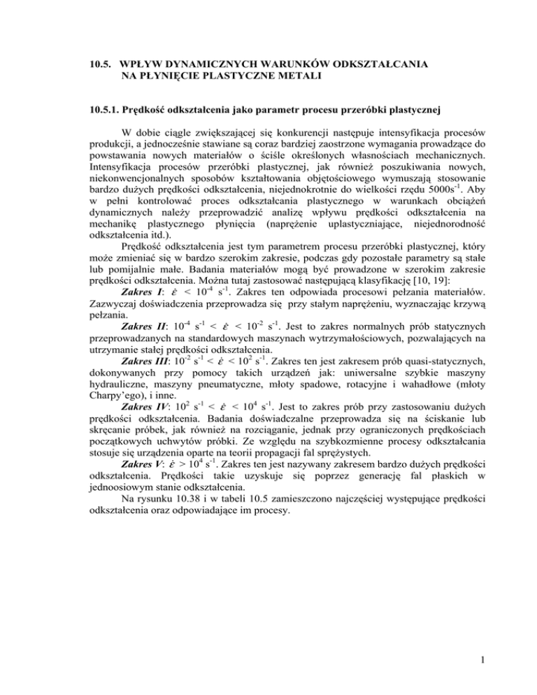 10.5. WPŁYW DYNAMICZNYCH WARUNKÓW ODKSZTAŁCANIA NA PŁYNIĘCIE PLASTYCZNE METALI 10.5.1. Prędkość odkształcenia jako parametr procesu przeróbki plastycznej W dobie ciągle zwiększającej się konkurencji następuje intensyfikacja procesów produkcji, a jednocześnie stawiane są coraz bardziej zaostrzone wymagania prowadzące do powstawania nowych materiałów o ściśle określonych własnościach mechanicznych. Intensyfikacja procesów przeróbki plastycznej, jak również poszukiwania nowych, niekonwencjonalnych sposobów kształtowania objętościowego wymuszają stosowanie bardzo dużych prędkości odkształcenia, niejednokrotnie do wielkości rzędu 5000s-1. Aby w pełni kontrolować proces odkształcania plastycznego w warunkach obciążeń dynamicznych należy przeprowadzić analizę wpływu prędkości odkształcenia na mechanikę plastycznego płynięcia (naprężenie uplastyczniające, niejednorodność odkształcenia itd.). Prędkość odkształcenia jest tym parametrem procesu przeróbki plastycznej, który może zmieniać się w bardzo szerokim zakresie, podczas gdy pozostałe parametry są stałe lub pomijalnie małe. Badania materiałów mogą być prowadzone w szerokim zakresie prędkości odkształcenia. Można tutaj zastosować następującą klasyfikację [10, 19]: Zakres I: ε& < 10-4 s-1. Zakres ten odpowiada procesowi pełzania materiałów. Zazwyczaj doświadczenia przeprowadza się przy stałym naprężeniu, wyznaczając krzywą pełzania. Zakres II: 10-4 s-1 < ε& < 10-2 s-1. Jest to zakres normalnych prób statycznych przeprowadzanych na standardowych maszynach wytrzymałościowych, pozwalających na utrzymanie stałej prędkości odkształcenia. Zakres III: 10-2 s-1 < ε& < 102 s-1. Zakres ten jest zakresem prób quasi-statycznych, dokonywanych przy pomocy takich urządzeń jak: uniwersalne szybkie maszyny hydrauliczne, maszyny pneumatyczne, młoty spadowe, rotacyjne i wahadłowe (młoty Charpy’ego), i inne. Zakres IV: 102 s-1 < ε& < 104 s-1. Jest to zakres prób przy zastosowaniu dużych prędkości odkształcenia. Badania doświadczalne przeprowadza się na ściskanie lub skręcanie próbek, jak również na rozciąganie, jednak przy ograniczonych prędkościach początkowych uchwytów próbki. Ze względu na szybkozmienne procesy odkształcania stosuje się urządzenia oparte na teorii propagacji fal sprężystych. Zakres V: ε& > 104 s-1. Zakres ten jest nazywany zakresem bardzo dużych prędkości odkształcenia. Prędkości takie uzyskuje się poprzez generację fal płaskich w jednoosiowym stanie odkształcenia. Na rysunku 10.38 i w tabeli 10.5 zamieszczono najczęściej występujące prędkości odkształcenia oraz odpowiadające im procesy. 1 Rys. 10.38. Definicje oraz charakterystyka procesów, w których prędkość odkształcenia posiada istotne znaczenie [23]. Tabela 10.5. Klasyfikacja badań w zależności od stosowanego zakresu prędkości odkształcenia [11]. Rodzaj badań Prędkość odkształcenia, s-1 107 Udarowe z maksymalnymi prędkościami 106 105 Udarowe 104 103 102 10 1 0.1 Aparatura, towarzyszące zjawiska Testy wybuchowe, pulsacje laserowe Udział sił masowych, zjawiska falowego rozprzestrzeniania naprężeń Metoda Hopkinson’a Falowe rozprzestrzenianie naprężeń Dynamiczne Maszyny wytrzymałościowe hydrauliczne lub śrubowe Quasi-statyczne Typowe badania prowadzone na maszynach wytrzymałościowych Duża jednorodność odkształceń Pełzanie i relaksacja Specjalne maszyny wytrzymałościowe Relaksacja Procesy aktywowane cieplnie 0.02 10-3 10-4 10-5 10 -6 ≤10-7 2 W tabeli 10.6 zamieszczono wartości prędkości odkształcania charakterystyczne dla różnych badań plastometrycznych i procesów odkształcania [4]. Należy zaznaczyć, że prędkości odkształcenia uzyskiwane w procesach odkształcania na większości urządzeń wykorzystywanych do badań plastometrycznych lub przeróbki plastycznej są znacznie większe niż wynikałoby to z prędkości przesuwu trawersy lub narzędzia. Jakkolwiek, nie są one wystarczająco duże, aby wystąpiły efekty tzw. „fali naprężeń”, istotne z punktu widzenia zachowania się materiału. Zaobserwowano również, że w rzeczywistych procesach przeróbki plastycznej możliwe jest występowanie bardzo dużych lokalnych prędkości odkształcenia. Dla przykładu ciągnienie cienkiego drutu z prędkością rzędu 37 m/s wywołuje prędkość odkształcenia nawet powyżej 105s-1, natomiast podczas walcowania cienkiej blachy osiągana jest średnia prędkość odkształcenia rzędu 2×103s-1. W tych przypadkach tak duże prędkości odkształcenia są efektem koncentracji odkształceń w strefie odkształcania, a nie tylko bardzo dużych prędkości ciągnienia czy walcowania. Tabela 10.6. Procesy odkształcania realizowane z bardzo dużymi prędkościami [4]. Operacja Próba rozciągania Prędkość narzędzia, m/s 6.1×10-7 ÷ 6×10-2 Wyciskanie na prasie hydraulicznej 0.003 ÷ 3 Odkształcanie na prasie mechanicznej 0.1 ÷ 1.5 Test uderzeniowy Charpy’ego 3÷6 Kucie na młocie 3÷9 Formowanie wybuchowe 30 ÷ 120 10.5.2. Istota odkształcania z dużymi prędkościami Istnieją fundamentalne różnice pomiędzy odkształcaniem quasi-statycznym a dynamicznym [15, 17]. Przy odkształcaniu quasi-statycznym mamy w każdym czasie stan równowagi statycznej tj. suma sił działających na każdy element ciała jest bliska zeru. Gdy obciążenie przyłożone jest z zewnątrz z bardzo dużą prędkością, jedna część ciała jest pod działaniem siły, podczas gdy inna część nie doświadczyła jeszcze tego oddziaływania. Innymi słowy, naprężenie musi przemieszczać się przez ciało. Naprężenie (i połączone z nim odkształcenie) przemieszcza się w ciałach z określonymi prędkościami jako fala. Tak więc, odkształcanie dynamiczne często dotyczy rozchodzenia się fali, podczas gdy odkształcanie quasi-statyczne może być rozpatrywane jako sekwencja stanów ró