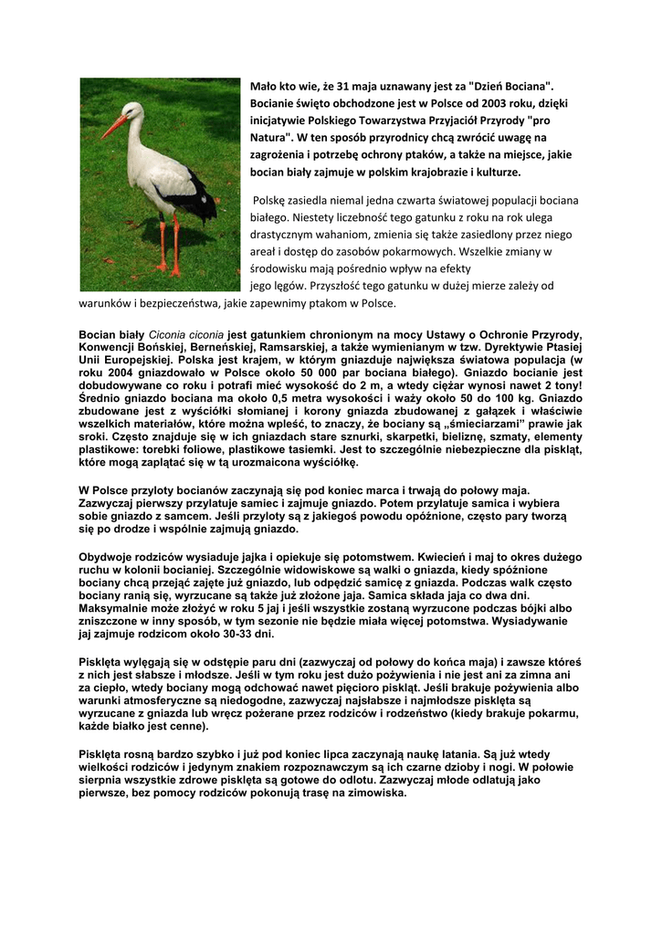 Mało kto wie, że 31 maja uznawany jest za "Dzień Bociana". Bocianie święto obchodzone jest w Polsce od 2003 roku, dzięki inicjatywie Polskiego Towarzystwa Przyjaciół Przyrody "pro Natura". W ten sposób przyrodnicy chcą zwrócić uwagę na zagrożenia i potrzebę ochrony ptaków, a także na miejsce, jakie bocian biały zajmuje w polskim krajobrazie i kulturze. Polskę zasiedla niemal jedna czwarta światowej populacji bociana białego. Niestety liczebność tego gatunku z roku na rok ulega drastycznym wahaniom, zmienia się także zasiedlony przez niego areał i dostęp do zasobów pokarmowych. Wszelkie zmiany w środowisku mają pośrednio wpływ na efekty jego lęgów. Przyszłość tego gatunku w dużej mierze zależy od warunków i bezpieczeństwa, jakie zapewnimy ptakom w Polsce. Bocian biały Ciconia ciconia jest gatunkiem chronionym na mocy Ustawy o Ochronie Przyrody, Konwencji Bońskiej, Berneńskiej, Ramsarskiej, a także wymienianym w tzw. Dyrektywie Ptasiej Unii Europejskiej. Polska jest krajem, w którym gniazduje największa światowa populacja (w roku 2004 gniazdowało w Polsce około 50 000 par bociana białego). Gniazdo bocianie jest dobudowywane co roku i potrafi mieć wysokość do 2 m, a wtedy ciężar wynosi nawet 2 tony! Średnio gniazdo bociana ma około 0,5 metra wysokości i waży około 50 do 100 kg. Gniazdo zbudowane jest z wyściółki słomianej i korony gniazda zbudowanej z gałązek i właściwie wszelkich materiałów, które można wpleść, to znaczy, że bociany są „śmieciarzami” prawie jak sroki. Często znajduje się w ich gniazdach stare sznurki, skarpetki, bieliznę, szmaty, elementy plastikowe: torebki foliowe, plastikowe tasiemki. Jest to szczególnie niebezpieczne dla piskląt, które mogą zaplątać się w tą urozmaicona wyściółkę. W Polsce przyloty bocianów zaczynają się pod koniec marca i trwają do połowy maja. Zazwyczaj pierwszy przylatuje samiec i zajmuje gniazdo. Potem przylatuje samica i wybiera sobie gniazdo z samcem. Jeśli przyloty są z jakiegoś powodu opóźnione, często pary tworzą się po drodze i wspólnie zajmują gniazdo. Obydwoje rodziców wysiaduje jajka i opiekuje się potomstwem. Kwiecień i maj to okres dużego ruchu w kolonii bocianiej. Szczególnie widowiskowe są walki o gniazda, kiedy spóźnione bociany chcą przejąć zajęte już gniazdo, lub odpędzić samicę z gniazda. Podczas walk często bociany ranią się, wyrzucane są także już złożone jaja. Samica składa jaja co dwa dni. Maksymalnie może złożyć w roku 5 jaj i jeśli wszystkie zostaną wyrzucone podczas bójki albo zniszczone w inny sposób, w tym sezonie nie będzie miała więcej potomstwa. Wysiadywanie jaj zajmuje rodzicom około 30-33 dni. Pisklęta wylęgają się w odstępie paru dni (zazwyczaj od połowy do końca maja) i zawsze któreś z nich jest słabsze i młodsze. Jeśli w tym roku jest dużo pożywienia i nie jest ani za zimna ani za ciepło, wtedy bociany mogą odchować nawet pięcioro piskląt. Jeśli brakuje pożywienia albo warunki atmosferyczne są niedogodne, zazwyczaj najsłabsze i najmłodsze pisklęta są wyrzucane z gniazda lub wręcz pożerane przez rodziców i rodzeństwo (kiedy brakuje pokarmu, każde białko jest cenne). Pisklęta rosną bardzo szybko i już pod koniec lipca zaczynają naukę latania. Są już wtedy wielkości rodziców i jedynym znakiem rozpoznawczym są ich czarne dzioby i nogi. W połowie sierpnia wszystkie zdrowe pisklęta są gotowe do odlotu. Zazwyczaj młode odlatują jako pierwsze, bez pomocy rodziców pokonują trasę na zimowiska. Bocian jest narażony na cały szereg zagrożeń powodowanych przez człowieka i jego działalność. Należą do nich m.in.: obniżenie poziomu wód gruntowych, melioracje odwadniające, przekształcenia użytków zielonych w pola uprawne, "zadrutowanie krajobrazu", zmiany pokryć dachowych i związane z tym przenoszenie się bocianów na czynne słupy energetyczne, stosowanie w rolnictwie plastikowych sznurków używanych do wiązania siana i słomy. Bocian jest gatunkiem bezpośrednio reagującym na zmiany środowiska, a zwłaszcza na zmieniającą się dostępność zasobów pokarmowych. Wszelkie zmiany w środowisku mają bezpośredni wpływ na efekty lęgów u tego gatunku. Stan bocianiej populacji oddaje bardzo dobrze stan środowiska i w związku z tym bocian jest wykorzystywany jako gatunek wskaźnikowy. Na wielu powierzchniach próbnych prowadzone są systematyczne badania bocianiej populacji. Wyniki tych badań pozwalają przygotowywać programy ochrony określonych terenów. Ponadto bocian jest tak zwanym gatunkiem osłonowym. Oznacza to, że chroniąc jego tereny żerowiskowe i miejsca gniazdowania chroni się wiele rzadkich gatunków roślin i zwierząt nieznanych przeciętnemu człowiekowi. Odbywa się to bez ponoszenia dodatkowych nakładów. Ochrona terenów podmokłych, oczek wodnych, wilgotnych łąk, starorzeczy itp., które są głównymi żerowiskami bociana pozwala zachować najcenniejsze siedliska z całym zespołem roślin i zwierząt np. ptaki siewkowate czy rzadkie storczyki. W niektórych krajach europejskich bardzo wcześnie dostrzeżono zagrożenia dla bocianiej populacji i w związku z tym rozpoczęto programy ochrony tego gatunku. W Szwajcarii np. gdzie bocian wyginął już w roku 1950 prowadzi się program reintrodukcji oparty na hodowli i wypuszczaniu młodych na wolność. Podobne działania prowadzono w Alzacji i Lotaryngii, Niemczech, Holandii, Szwecji. Od roku 1995 w Polsce jest prowadzony ogólnopolski program pt. “Ochrona bociana białego i jego siedlisk”.