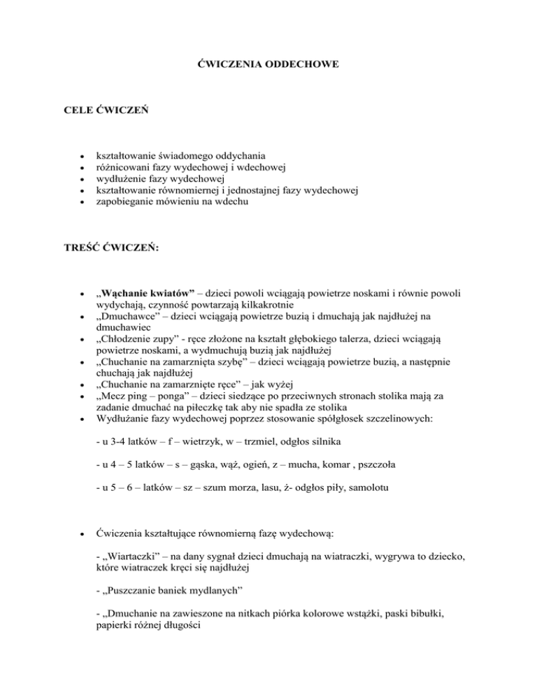 ĆWICZENIA ODDECHOWE CELE ĆWICZEŃ kształtowanie świadomego oddychania różnicowani fazy wydechowej i wdechowej wydłużenie fazy wydechowej kształtowanie równomiernej i jednostajnej fazy wydechowej zapobieganie mówieniu na wdechu TREŚĆ ĆWICZEŃ: „Wąchanie kwiatów” – dzieci powoli wciągają powietrze noskami i równie powoli wydychają, czynność powtarzają kilkakrotnie „Dmuchawce” – dzieci wciągają powietrze buzią i dmuchają jak najdłużej na dmuchawiec „Chłodzenie zupy” - ręce złożone na kształt głębokiego talerza, dzieci wciągają powietrze noskami, a wydmuchują buzią jak najdłużej „Chuchanie na zamarznięta szybę” – dzieci wciągają powietrze buzią, a następnie chuchają jak najdłużej „Chuchanie na zamarznięte ręce” – jak wyżej „Mecz ping – ponga” – dzieci siedzące po przeciwnych stronach stolika mają za zadanie dmuchać na piłeczkę tak aby nie spadła ze stolika Wydłużanie fazy wydechowej poprzez stosowanie spółgłosek szczelinowych: - u 3-4 latków – f – wietrzyk, w – trzmiel, odgłos silnika - u 4 – 5 latków – s – gąska, wąż, ogień, z – mucha, komar , pszczoła - u 5 – 6 – latków – sz – szum morza, lasu, ż- odgłos piły, samolotu Ćwiczenia kształtujące równomierną fazę wydechową: - „Wiartaczki” – na dany sygnał dzieci dmuchają na wiatraczki, wygrywa to dziecko, które wiatraczek kręci się najdłużej - „Puszczanie baniek mydlanych” - „Dmuchanie na zawieszone na nitkach piórka kolorowe wstążki, paski bibułki, papierki różnej długości Ćwiczenia oddechowe połączone z dwufazowymi ćwiczeniami ruchowymi - u 5-6 latków ćwiczenia oddychania brzuszno – przeponowego Na początek rozruszanie przepony: dziecko stojąc i trzymając rączkę na brzuchu naśladuje śmiechy olbrzymów: Ha, ha..… ,ho, ho….., hu, hu….., he, he....., hi, hi……… Potem leżąc trzyma jedną rękę na brzuchu, drugą na górnej części klatki piersiowej, W czasie wdechu ręka leżąca na brzuchu unosi się znacznie wyżej niż druga /można na brzuszek dziecka położyć coś lekkiego np. zabawkę, książeczkę – dziecko „huśta” ją na brzuszku/ Ćwiczenia oddechowe połączone z mówieniem: - powtarzanie zdań na jednym wydechu - „Słonko” – dzieci stoją wyprostowane i wykonują wdech ustami, w czasie wydechu unoszą ręce do góry, wznoszą się na palce i mówią: „Słonko wschodzi coraz wyżej”, następnie znów wdychają powietrze i opuszczają ręce podczas wydechu mówią: „A zachodzi coraz niżej” - liczenie na jednym wydechu - recytacja wierszy z rozplanowanymi wdechami i wydechami