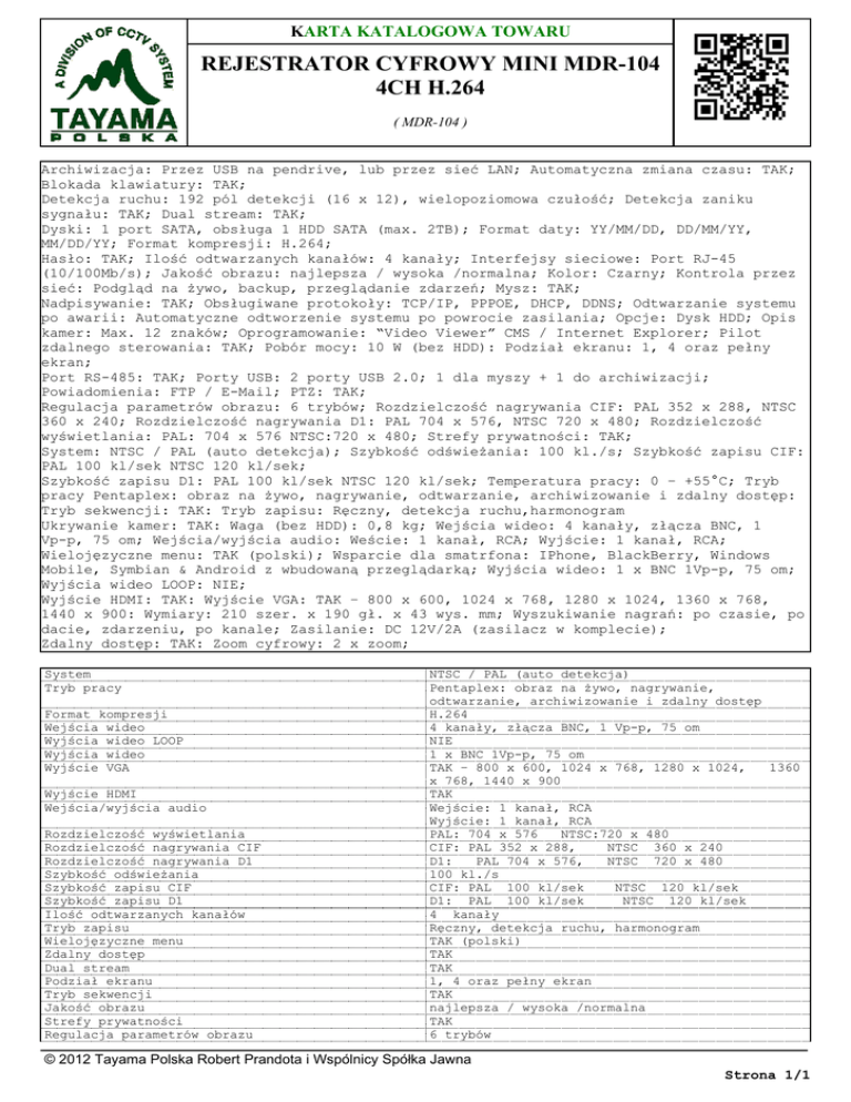 KARTA KATALOGOWA TOWARU REJESTRATOR CYFROWY MINI MDR-104 4CH H.264 ( MDR-104 ) Archiwizacja: Przez USB na pendrive, lub przez sieć LAN; Automatyczna zmiana czasu: TAK; Blokada klawiatury: TAK; Detekcja ruchu: 192 pól detekcji (16 x 12), wielopoziomowa czułość; Detekcja zaniku sygnału: TAK; Dual stream: TAK; Dyski: 1 port SATA, obsługa 1 HDD SATA (max. 2TB); Format daty: YY/MM/DD, DD/MM/YY, MM/DD/YY; Format kompresji: H.264; Hasło: TAK; Ilość odtwarzanych kanałów: 4 kanały; Interfejsy sieciowe: Port RJ-45 (10/100Mb/s); Jakość obrazu: najlepsza / wysoka /normalna; Kolor: Czarny; Kontrola przez sieć: Podgląd na żywo, backup, przeglądanie zdarzeń; Mysz: TAK; Nadpisywanie: TAK; Obsługiwane protokoły: TCP/IP, PPPOE, DHCP, DDNS; Odtwarzanie systemu po awarii: Automatyczne odtworzenie systemu po powrocie zasilania; Opcje: Dysk HDD; Opis kamer: Max. 12 znaków; Oprogramowanie: “Video Viewer” CMS / Internet Explorer; Pilot zdalnego sterowania: TAK; Pobór mocy: 10 W (bez HDD): Podział ekranu: 1, 4 oraz pełny ekran; Port RS-485: TAK; Porty USB: 2 porty USB 2.0; 1 dla myszy + 1 do archiwizacji; Powiadomienia: FTP / E-Mail; PTZ: TAK; Regulacja parametrów obrazu: 6 trybów; Rozdzielczość nagrywania CIF: PAL 352 x 288, NTSC 360 x 240; Rozdzielczość nagrywania D1: PAL 704 x 576, NTSC 720 x 480; Rozdzielczość wyświetlania: PAL: 704 x 576 NTSC:720 x 480; Strefy prywatności: TAK; System: NTSC / PAL (auto detekcja); Szybkość odświeżania: 100 kl./s; Szybkość zapisu CIF: PAL 100 kl/sek NTSC 120 kl/sek; Szybkość zapisu D1: PAL 100 kl/sek NTSC 120 kl/sek; Temperatura pracy: 0 – +55°C; Tryb pracy Pentaplex: obraz na żywo, nagrywanie, odtwarzanie, archiwizowanie i zdalny dostęp: Tryb sekwencji: TAK: Tryb zapisu: Ręczny, detekcja ruchu,harmonogram Ukrywanie kamer: TAK: Waga (bez HDD): 0,8 kg; Wejścia wideo: 4 kanały, złącza BNC, 1 Vp-p, 75 om; Wejścia/wyjścia audio: Weście: 1 kanał, RCA; Wyjście: 1 kanał, RCA; Wielojęzyczne menu: TAK (polski); Wsparcie dla smatrfona: IPhone, BlackBerry, Windows Mobile, Symbian & Android z wbudowaną przeglądarką; Wyjścia wideo: 1 x BNC 1Vp-p, 75 om; Wyjścia wideo LOOP: NIE; Wyjście HDMI: TAK: Wyjście VGA: TAK – 800 x 600, 1024 x 768, 1280 x 1024, 1360 x 768, 1440 x 900: Wymiary: 210 szer. x 190 gł. x 43 wys. mm; Wyszukiwanie nagrań: po czasie, po dacie, zdarzeniu, po kanale; Zasilanie: DC 12V/2A (zasilacz w komplecie); Zdalny dostęp: TAK: Zoom cyfrowy: 2 x zoom; System Tryb pracy Format kompresji Wejścia wideo Wyjścia wideo LOOP Wyjścia wideo Wyjście VGA Wyjście HDMI Wejścia/wyjścia audio Rozdzielczość wyświetlania Rozdzielczość nagrywania CIF Rozdzielczość nagrywania D1 Szybkość odświeżania Szybkość zapisu CIF Szybkość zapisu D1 Ilość odtwarzanych kanałów Tryb zapisu Wielojęzyczne menu Zdalny dostęp Dual stream Podział ekranu Tryb sekwencji Jakość obrazu Strefy prywatności Regulacja parametrów obrazu NTSC / PAL (auto detekcja) Pentaplex: obraz na żywo, nagrywanie, odtwarzanie, archiwizowanie i zdalny dostęp H.264 4 kanały, złącza BNC, 1 Vp-p, 75 om NIE 1 x BNC 1Vp-p, 75 om TAK – 800 x 600, 1024 x 768, 1280 x 1024, 1360 x 768, 1440 x 900 TAK Wejście: 1 kanał, RCA Wyjście: 1 kanał, RCA PAL: 704 x 576 NTSC:720 x 480 CIF: PAL 352 x 288, NTSC 360 x 240 D1: PAL 704 x 576, NTSC 720 x 480 100 kl./s CIF: PAL 100 kl/sek NTSC 120 kl/sek D1: PAL 100 kl/sek NTSC 120 kl/sek 4 kanały Ręczny, detekcja ruchu, harmonogram TAK (polski) TAK TAK 1, 4 oraz pełny ekran TAK najlepsza / wysoka /normalna TAK 6 trybów © 2012 Tayama Polska Robert Prandota i Wspólnicy Spółka Jawna Strona 1/1 KARTA KATALOGOWA TOWARU REJESTRATOR CYFROWY MINI MDR-104 4CH H.264 ( MDR-104 ) Opis kamer Detekcja ruchu Detekcja zaniku sygnału Nadpisywanie Wyszukiwanie nagrań Zoom cyfrowy Archiwizacja Interfejsy sieciowe Obsługiwane protokoły Kontrola przez sieć Porty USB Port RS-485 Dyski Pilot zdalnego sterowania Mysz Oprogramowanie Wsparcie dla smatrfona PTZ Ukrywanie kamer Blokada klawiatury Hasło Format daty Zasilanie Pobór mocy Temperatura pracy Opcje Wymiary Kolor Waga (bez HDD) Odtwarzanie systemu po awarii Automatyczna zmiana czasu Powiadomienia Folder z materiałami źródłowymi Max. 12 znaków 192 pól detekcji (16 x 12), wielopoziomowa czułość TAK TAK po czasie, po dacie, zdarzeniu, po kanale 2 x zoom Przez USB na pendrive, lub przez sieć LAN Port RJ-45 (10/100Mb/s) TCP/IP, PPPOE, DHCP, DDNS Podgląd na żywo, backup, przeglądanie zdarzeń 2 porty USB 2.0; 1 dla myszy + 1 do archiwizacji TAK 1 port SATA, obsługa 1 HDD SATA (max. 4TB) TAK TAK “Video Viewer” CMS / Internet Explorer IPhone, BlackBerry, Windows Mobile, Symbian & Android z wbudowaną przeglądarką NIE TAK TAK TAK YY/MM/DD, DD/MM/YY, MM/DD/YY DC 12V/2A (zasilacz w komplecie) 10 W (bez HDD) 0 – 55°C Dysk HDD 210 szer. x 190 gł. x 43 wys. mm Czarny 0,8 kg (bez HDD) Automatyczne odtworzenie systemu po powrocie zasilania TAK FTP / E-Mail MDR-104 © 2012 Tayama Polska Robert Prandota i Wspólnicy Spółka Jawna Strona 1/1