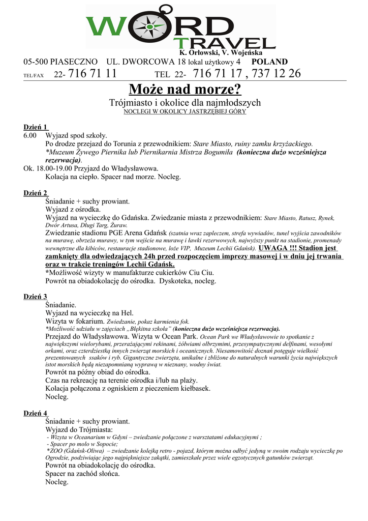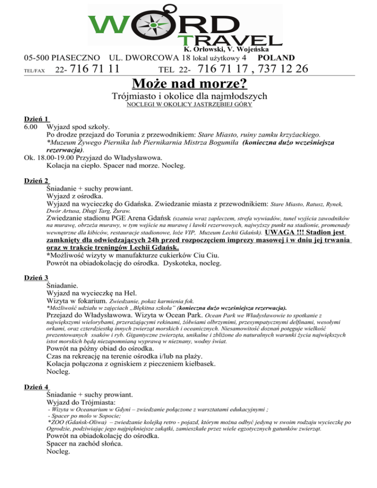 05-500 PIASECZNO TEL/FAX 22- 716 71 K. Orłowski, V. Wojeńska UL. DWORCOWA 18 lokal użytkowy 4 POLAND 11 TEL 22- 716 71 17 , 737 12 26 Może nad morze? Trójmiasto i okolice dla najmłodszych NOCLEGI W OKOLICY JASTRZĘBIEJ GÓRY Dzień 1 6.00 Wyjazd spod szkoły. Po drodze przejazd do Torunia z przewodnikiem: Stare Miasto, ruiny zamku krzyżackiego. *Muzeum Żywego Piernika lub Piernikarnia Mistrza Bogumiła (konieczna dużo wcześniejsza rezerwacja). Ok. 18.00-19.00 Przyjazd do Władysławowa. Kolacja na ciepło. Spacer nad morze. Nocleg. Dzień 2 Śniadanie + suchy prowiant. Wyjazd z ośrodka. Wyjazd na wycieczkę do Gdańska. Zwiedzanie miasta z przewodnikiem: Stare Miasto, Ratusz, Rynek, Dwór Artusa, Długi Targ, Żuraw. Zwiedzanie stadionu PGE Arena Gdańsk (szatnia wraz zapleczem, strefa wywiadów, tunel wyjścia zawodników na murawę, obrzeża murawy, w tym wejście na murawę i ławki rezerwowych, najwyższy punkt na stadionie, promenady wewnętrzne dla kibiców, restauracje stadionowe, loże VIP, Muzeum Lechii Gdańsk). UWAGA !!! Stadion jest zamknięty dla odwiedzających 24h przed rozpoczęciem imprezy masowej i w dniu jej trwania oraz w trakcie treningów Lechii Gdańsk. *Możliwość wizyty w manufakturze cukierków Ciu Ciu. Powrót na obiadokolację do ośrodka. Dyskoteka, nocleg. Dzień 3 Śniadanie. Wyjazd na wycieczkę na Hel. Wizyta w fokarium. Zwiedzanie, pokaz karmienia fok. *Możliwość udziału w zajęciach „Błękitna szkoła” (konieczna dużo wcześniejsza rezerwacja). Przejazd do Władysławowa. Wizyta w Ocean Park. Ocean Park we Władysławowie to spotkanie z największymi wielorybami, przerażającymi rekinami, żółwiami olbrzymimi, przesympatycznymi delfinami, wesołymi orkami, oraz czterdziestką innych zwierząt morskich i oceanicznych. Niesamowitość doznań potęguje wielkość prezentowanych ssaków i ryb. Gigantyczne zwierzęta, unikalne i zbliżone do naturalnych warunki życia największych istot morskich będą niezapomnianą wyprawą w nieznany, wodny świat. Powrót na późny obiad do ośrodka. Czas na rekreację na terenie ośrodka i/lub na plaży. Kolacja połączona z ogniskiem z pieczeniem kiełbasek. Nocleg. Dzień 4 Śniadanie + suchy prowiant. Wyjazd do Trójmiasta: - Wizyta w Oceanarium w Gdyni – zwiedzanie połączone z warsztatami edukacyjnymi ; - Spacer po molo w Sopocie; *ZOO (Gdańsk-Oliwa) – zwiedzanie kolejką retro - pojazd, którym można odbyć jedyną w swoim rodzaju wycieczkę po Ogrodzie, podziwiając jego najpiękniejsze zakątki, zamieszkałe przez wiele egzotycznych gatunków zwierząt. Powrót na obiadokolację do ośrodka. Spacer na zachód słońca. Nocleg. Dzień 5 Śniadanie. Wykwaterowanie, wyjazd. W drodze powrotnej zwiedzanie zamku w Malborku. Program edukacyjny ,,Szlak zamkowych tajemnic” - Klasa szkolna staje się drużyną rycerską, która otrzymuje zadanie odnalezienia ukrytego hasła. Litery poszukiwanych słów można zdobywać na zamkowej trasie, rozwiązując szereg zagadek i wypełniając zadania stawiane przez mistrza drogi (przewodnik w stroju historycznym). Skompletowane w zamku hasło daje młodym odkrywcom malborskich tajemnic możliwość spotkania z wielkim mistrzem zakonu. Dzieci uczestniczące aktywnie w zamkowej przygodzie, uzyskują wiele informacji o twierdzy nad Nogatem, zakonie krzyżackim, Królestwie Polskim i kulturze wieków średnich (ok. 2h). * Możliwość dokupienia pizzy z napojem + 10zł/os lub obiadu + 20zł/os. Ok 20:00-21.00 powrót pod szkołę. KOLEJNOŚĆ ZWIEDZANIA MOŻE ULEC ZMIANIE Świadczenia: - transport lux autokarem marki, np. Mercedes, Volvo, Scania, MAN, Neoplan z WC, DVD, barkiem, uchylnymi siedzeniami - zakwaterowanie w hotelu, pensjonacie, ośrodku wypoczynkowym, pokoje z łazienkami lub studio - wyżywienie zgodnie z programem - realizacja programu turystycznego - opieka pilota - ubezpieczenie NW 5000 zł - VAT - grupy 30 os. - 2 miejsca gratis dla nauczycieli, od 30 do 45 os. – 3 miejsca gratis dla nauczycieli Cena: 570 zł /min. 40 os. - max. 45 os. płacących 620 zł /min. 35 os. - max. 39 os. płacących 670 zł /min. 30 os. - max. 34 os. płacących + dodatkowo bilety wstępu i przewodnicy miejscowi od 100 do 150 zł/os. (w zależności od wybranych punktów programu) +Możliwość dokupienia posiłku ostatniego dnia wycieczki :pizza z napojem + 10zł/os lub obiad + 20zł/os. Standardowy rozmiar naszych autokarów to 49 miejsc (do dyspozycji grupy wraz z opiekunami). Na Państwa życzenie możemy zarezerwować autokary 57-70 miejsc (w tym przypadku prosimy o kontakt z biurem w celu sprawdzenia kalkulacji na ponadstandardowy pojazd i jego dostępności w wybranym przez Państwa terminie). W celu podpisania umowy i rezerwacji konkretnego terminu prosimy o telefon do biura 022 716 71 11 lub 022 716 71 17 lub mail [email protected] Zaliczka konieczna do podpisania umowy 200 zł/os. Ze względu na szczyt sezonu wycieczek szkolnych w miesiącach maj-czerwiec sugerujemy dokonanie rez. wstępnej na czas zebrania zaliczek! KWOTĘ NA BILETY WSTĘPU POTWIERDZAMY PRZED DOPŁATĄ ZGODNIE Z OBOWIĄZUJĄCYMI CENNIKAMI Wyciąg z warunków uczestnictwa imprez turystycznych organizowanych przez B.P. Word Travel (pełna wersja warunków uczestnictwa dostępna jest u nauczyciela organizującego wycieczkę): 13. W przypadku rezygnacji lub nie uczestniczenia Uczestnika w wykupionej imprezie Organizator uprawniony jest do potrącenia RZECZYWIŚCIE PONIESIONYCH KOSZTÓW. 14. Zmiana uczestnika nie pociąga za sobą kosztów finansowych. 18. Uczestnik odpowiada za wszelkie szkody materialne wyrządzone w trakcie trwania imprezy (zniszczenia w hotelu, autokarze) 15. Jeżeli w programie jest wyjazd poza granicę Polski - uczestnik winien posiadać na miejscu zbiórki aktualnie obowiązujące dokumenty uprawniające do przekroczenia granic krajów objętych programem imprezy (wyłącznie dowód osobisty lub paszport ważny min. 6 m-cy od daty powrotu). 9 B. W przypad