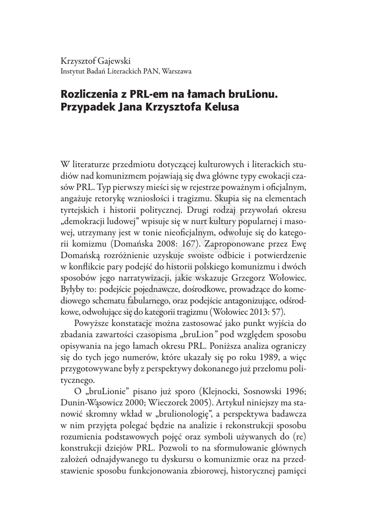 Krzysztof Gajewski Instytut Badań Literackich PAN, Warszawa Rozliczenia z PRL-em na łamach bruLionu. Przypadek Jana Krzysztofa Kelusa W literaturze przedmiotu dotyczącej kulturowych i literackich studiów nad komunizmem pojawiają się dwa główne typy ewokacji czasów PRL. Typ pierwszy mieści się w rejestrze poważnym i oficjalnym, angażuje retorykę wzniosłości i tragizmu. Skupia się na elementach tyrtejskich i historii politycznej. Drugi rodzaj przywołań okresu „demokracji ludowej” wpisuje się w nurt kultury popularnej i masowej, utrzymany jest w tonie nieoficjalnym, odwołuje się do kategorii komizmu (Domańska 2008: 167). Zaproponowane przez Ewę Domańską rozróżnienie uzyskuje swoiste odbicie i potwierdzenie w konflikcie pary podejść do historii polskiego komunizmu i dwóch sposobów jego narratywizacji, jakie wskazuje Grzegorz Wołowiec. Byłyby to: podejście pojednawcze, dośrodkowe, prowadzące do komediowego schematu fabularnego, oraz podejście antagonizujące, odśrodkowe, odwołujące się do kategorii tragizmu (Wołowiec 2013: 57). Powyższe konstatacje można zastosować jako punkt wyjścia do zbadania zawartości czasopisma „bruLion” pod względem sposobu opisywania na jego łamach okresu PRL. Poniższa analiza ograniczy się do tych jego numerów, które ukazały się po roku 1989, a więc przygotowywane były z perspektywy dokonanego już przełomu politycznego. O „bruLionie” pisano już sporo (Klejnocki, Sosnowski 1996; Dunin-Wąsowicz 2000; Wieczorek 2005). Artykuł niniejszy ma stanowić skromny wkład w „brulionologię”, a perspektywa badawcza w nim przyjęta polegać będzie na analizie i rekonstrukcji sposobu rozumienia podstawowych pojęć oraz symboli używanych do (re) konstrukcji dziejów PRL. Pozwoli to na sformułowanie głównych założeń odnajdywanego tu dyskursu o komunizmie oraz na przedstawienie sposobu funkcjonowania zbiorowej, historycznej pamięci 132 Część trzecia. Literatura (p)o komunizmie o czasach PRL, opierającej się, jak zauważa Katarzyna Chmielewska, na biegunach dziedzictwa i traumy: tego, co chcielibyśmy zachować i tego, co staramy się wyprzeć (Chmielewska 2011: 19). Perspektywa tak zakrojona może wydawać się zaskakująca w odniesieniu do przekazu płynącego ze stronic „bruLionu”. Nazwa tego czasopisma posłużyła przecież do oznaczenia całej generacji twórców literatury, poetów, prozaików, eseistów, artystów plastyków, muzyków, tworzących w specyficznej atmosferze artystyczno-intelektualnej, którą emanowała redakcja „pisma nosem” (podtytuł periodyku). A generacja ta programowo odżegnywała się od udziału w polityce, niekiedy ostentacyjnie ignorowała konflikty historyczne i swoją ideową orientację budowała na podstawie zmysłowego konkretu, tu i teraz, a za swe podstawowe wartości uznała wolność i indywidualizm, manifestowane chętnie przy zastosowaniu strategii skandalu towarzyskiego i obyczajowego. Hipoteza badawcza niniejszej pracy głosi, że dyskurs „bruLionu” nie wpisuje się w żaden z wymienionych na wstępie typów ewokacji rzeczywistości PRL. Nie należy do nurtu tragicznego ze względu na ostentacyjną deheroizację przedstawianych wydarzeń, a jednocześnie nie daje się on zredukować do nurtu kultury masowej i popularnej, opartej na paradygmacie kategorii estetycznej komizmu, gdyż zawiera szereg składników nietypowych dla produkcji masowej i popularnej, jak rozbudowana refleksja socjologiczna i filozoficzna, a także dość wąskie grono odbiorców, zarówno empirycznych, jak i modelowych. Niewątpliwie „bruLion” ze względu na sposób funkcjonowania, niezależnego, przynajmniej u swych początków, i pozainstytucjonalnego, niejako „podziemnego”, należałoby zaklasyfikować jako zjawisko kultury nieoficjalnej. Wskazuje na to również zastosowana stylistyka, pełna wyrażeń dosadnych, niekiedy wulgarnych, sięgająca po środki wyrazu wywołujące efekt „niedbałości”, „brutalności”. Ów „uliczny” styl deheroizuje przedstawiane wydarzenia, uniemożliwiając pojawienie się kategorii wzniosłości. Na łamach czasopisma przez trzynaście lat jego ukazywania się (na potrzeby niniejszej pracy badany był jedynie zakres lat 1989–1999) ukazało się wiele wypowiedzi, w których tematyka PRL i komunizmu stanowi temat główny lub jest przywoływana przy omawianiu innych zagadnień. Wśród autorów tego typu tekstów (wywiadów, Krzysztof Gajewski | Rozliczenia z PRL-em na łamach bruLionu 133 esejów, utworów literackich oraz dokumentów urzędowych) wymienić można Macieja Grebenau, Jerzego Satrynana, Jakuba Szapera oraz Krzysztofa Gajdę w rozmowie z Janem Krzysztofem Kelusem. Przedmiotem poniższych analiz będzie właśnie ów wywiad, zatytułowany Kawał w bok od szosy głównej... opublikowany w „bruLionie” w roku 1998 (Kelus 1998). Jan Krzysztof Kelus to postać nieco skrywająca się w cieniu innych wielkich postaci opozycji demokratycznej, KOR-u, a potem Solidarności. Jeden z bardów pokoleniowych, mniej jednak głośny niż Jacek Kaczmarski. Wynikało to chociażby z wyboru medium: Kaczmarski kładł nacisk na koncertowanie i bezpośredni kontakt z publicznością studencką, Kelus zaś, prototyp współczesnego geeka, wolał użyć nowego medium, jakim były wówczas kasety magnetofonowe (Kelus 1998: 169). Jan Krzysztof Kelus urodził się w 1942 roku w Warszawie. W roku 1966 ukończył studia socjologiczne na Uniwersytecie Warszawskim. Trzy lata później został aresztowany za udział w „sprawie taterników”. W latach 70. pracował jako socjolog w Instytucie Wenerologii Akademii Medycznej w Warszawie. Aktywnie działał w KOR, m.in. organizował wsparcie dla robotników z Radomia. W latach 80. wraz z Czesławem Bieleckim założył Niezależną Oficynę Wydawniczą CDN. Następnie przeniósł się na Warmię, gdzie zarabiał na życie przekładami literatury popularnej i produkcją miodu