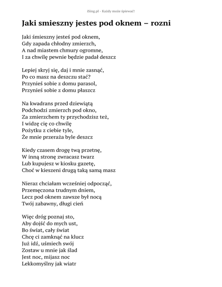 iSing.pl - Każdy może śpiewać! Jaki smieszny jestes pod oknem – rozni Jaki śmieszny jesteś pod oknem, Gdy zapada chłodny zmierzch, A nad miastem chmury ogromne, I za chwilę pewnie będzie padał deszcz Lepiej skryj się, daj i mnie zasnąć, Po co masz na deszczu stać? Przynieś sobie z domu parasol, Przynieś sobie z domu płaszcz Na kwadrans przed dziewiątą Podchodzi zmierzch pod okno, Za zmierzchem ty przychodzisz też, I widzę cię co chwilę Pożytku z ciebie tyle, Że mnie przeraża byle deszcz Kiedy czasem drogę twą przetnę, W inną stronę zwracasz twarz Lub kupujesz w kiosku gazetę, Choć w kieszeni drugą taką samą masz Nieraz chciałam wcześniej odpocząć, Przemęczona trudnym dniem, Lecz pod oknem zawsze był nocą Twój zabawny, długi cień Więc dróg poznaj sto, Aby dojść do mych ust, Bo świat, cały świat Chcę ci zamknąć na klucz Już idź, uśmiech swój Zostaw u mnie jak ślad Jest noc, mijasz noc Lekkomyślny jak wiatr Na kwadrans przed dziewiątą Podchodzi zmierzch pod okno, Za zmierzchem ty przychodzisz też, I widzę cię co chwilę Pożytku z ciebie tyle, Że mnie przeraża byle deszcz Jaki śmieszny jesteś pod oknem, Gdy zapada chłodny zmierzch, A nad miastem chmury ogromne, I za chwilę pewnie będzie padał deszcz Po co włóczysz się tu jak widmo? Tyś z księżyca chyba spadł! Ale wiem, na polu jest zimno, A ty masz we włosach wiatr Więc dróg poznaj sto, Aby dojść do mych ust, Bo świat, cały świat Chcę ci zamknąć na klucz Już idź, uśmiech swój Zostaw u mnie jak ślad Jest noc, mijasz noc Lekkomyślny jak wiatr La la la la la La la la la la la Jest noc, mijasz noc Lekkomyślny jak wiatr Słowa: brak danych Muzyka: brak danych Rok wydania: brak danych Płyta: brak danych