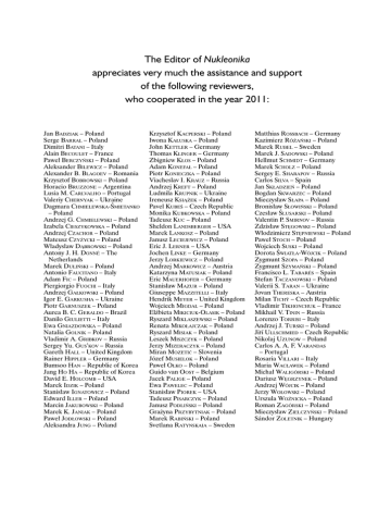 The Editor of Nukleonika appreciates very much the assistance and support of the following reviewers, who cooperated in the year 2011: Jan BADZIAK – Poland Serge BARRAL – Poland Dimitri BATANI – Italy Alain BECOULET – France Paweł BERCZYŃSKI – Poland Aleksander BILEWICZ – Poland Alexander B. BLAGOEV – Romania Krzysztof BOBROWSKI – Poland Horacio BRUZZONE – Argentina Lusia M. CARLVALHO – Portugal Valeriy CHERNYAK – Ukraine Dagmara CHMIELEWSKA-ŚMIETANKO – Poland Andrzej G. CHMIELEWSKI – Poland Izabela CIESZYKOWSKA – Poland Andrzej CZACHOR – Poland Mateusz CZYŻYCKI – Poland Władysław DĄBROWSKI – Poland Antony J. H. DONNÉ – The Netherlands Marek DULIŃSKI – Poland Antonio FAUCITANO – Italy Adam FIC – Poland Piergiorgio FUOCHI – Italy Andrzej GAŁKOWSKI – Poland Igor E. GARKUSHA – Ukraine Piotr GARNUSZEK – Poland Aurea B. C. GERALDO – Brazil Danilo GIULIETTI – Italy Ewa GNIAZDOWSKA – Poland Natalia GOLNIK – Poland Vladimir A. GRIBKOV – Russia Sergey Yu. GUS’KOV – Russia Gareth HALL – United Kingdom Rainer HIPPLER – Germany Bumsoo HAN – Republic of Korea Jang HO HA – Republic of Korea David E. HOLCOMB – USA Marek IDZIK – Poland Stanisław IGNATOWICZ – Poland Edward ILLER – Poland Marcin JAKUBOWSKI – Poland Marek K. JANIAK – Poland Paweł JODŁOWSKI – Poland Aleksandra JUNG – Poland Krzysztof KACPERSKI – Poland Iwona KAŁUSKA – Poland John KETTLER – Germany Thomas KLINGER – Germany Zbigniew KŁOS – Poland Adam KONEFAŁ – Poland Piotr KONIECZKA – Poland Viacheslav I. KRAUZ – Russia Andrzej KREFT – Poland Ludmila KRUPNIK – Ukraine Ireneusz KSIĄŻEK – Poland Pavel KUBEŠ – Czech Republic Monika KUBKOWSKA – Poland Tadeusz KUC – Poland Sheldon LANDSBERGER – USA Marek LANKOSZ – Poland Janusz LECIEJEWICZ – Poland Eric J. LERNER – USA Jochen LINKE – Germany Jerzy LORKIEWICZ – Poland Andrzej MARKOWICZ – Austria Katarzyna MATUSIAK – Poland Eric MAUERHOFER – Germany Stanisław MAZUR – Poland Giuseppe MAZZITELLI – Italy Hendrik MEYER – United Kingdom Wojciech MIGDAŁ – Poland Elżbieta MIKICIUK-OLASIK – Poland Ryszard MIKLASZEWSKI – Poland Renata MIKOŁAJCZAK – Poland Ryszard MISIAK – Poland Leszek MISZCZYK – Poland Jerzy MIZERACZYK – Poland Miran MOZETIČ – Slovenia Józef MUSIELOK – Poland Paweł OLKO – Poland Guido van OOST – Belgium Jacek PALIGE – Poland Ewa PAWELEC – Poland Stanisław PIOREK – USA Tadeusz PISARCZYK – Poland Janusz PODLIŃSKI – Poland Grażyna PRZYBYTNIAK – Poland Marek RABIŃSKI – Poland Svetlana RATYNSKAIA – Sweden Matthias ROSSBACH – Germany Kazimierz RÓŻAŃSKI – Poland Marek RUBEL – Sweden Marek J. SADOWSKI – Poland Hellmut SCHMIDT – Germany Marek SCHOLZ – Poland Sergey E. SHARAPOV – Russia Carlos SILVA – Spain Jan SKŁADZIEŃ – Poland Bogdan SKWARZEC – Poland Mieczysław SŁAPA – Poland Bronisław SŁOWIŃSKI – Poland Czesław ŚLUSARSKI – Poland Valentin P. SMIRNOV – Russia Zdzisław STĘGOWSKI – Poland Włodzimierz STĘPNIEWSKI – Poland Paweł STOCH – Poland Wojciech SUSKI – Poland Dorota ŚWIATŁA-WÓJCIK – Poland Zygmunt SZOPA – Poland Zygmunt SZYMAŃSKI – Poland Francisco L. TABARÉS – Spain Stefan TACZANOWSKI – Poland Valerii S. TARAN – Ukraine Jovan THERESKA – Austria Milan TICHÝ – Czech Republic Vladimir TIKHONCHUK – France Mikhail V. TININ – Russia Lorenzo TORRISI – Italy Andrzej J. TURSKI – Poland Jiří ULLSCHMIED – Czech Republic Nikolaj UZUNOW – Poland Carlos A. A. F. VARANDAS – Portugal Rosaria VILLARI – Italy Maria WACŁAWEK – Poland Michał WALIGÓRSKI – Poland Dariusz WĘGRZYNEK – Poland Andrzej WÓJCIK – Poland Jerzy WOŁOWSKI – Poland Urszula WOŹNICKA – Poland Roman ZAGÓRSKI – Poland Mieczysław ZIELCZYŃSKI – Poland Sándor ZOLETNIK – Hungary
