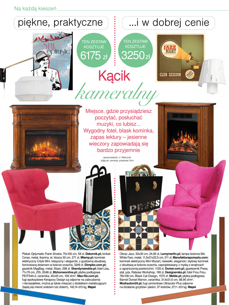 Na każdą kieszeń piękne, praktyczne TEN ZESTAW KOSZTUJE 6175 zł …i w dobrej cenie TEN ZESTAW KOSZTUJE 3250zł Kącik kameralny Miejsce, gdzie przysiądziesz poczytać, posłuchać muzyki, co lubisz... Wygodny fotel, blask kominka, zapas lektury – jesienne wieczory zapowiadają się bardzo przyjemnie opracowanie: J. Marczuk zdjęcia: serwisy prasowe firm Plakat Optymistic Frank Sinatra, 70x100 cm, 58 zł, Dekornik.pl; kinkiet Corse, metal, tkanina, śr. klosza 30 cm, 271 zł, Mlamp.pl; kominek elektryczny Crlyle Mini, klasyczny i elegancki, z gustowną obudową fornirowaną drewnem w kolorze orzecha, 3249 zł, Dimplex.com.pl; gazetnik MagBag, metal, Maze, 298 zł, Skandynawskie.pl; fotel Lisa, 71x79 cm, ZIS, 2048 zł, Bbhomeonline.pl; płytka podłogowa PE/FS44-2, ceramika, 45x45 cm, 109 zł/m2, Max-fliz.com.pl; fugi epoksydowe Kerapoxy Design są odporne na zabrudzenia i nienasiąkliwe, można je także mieszać z dodatkiem metalizującym (będą się mienić srebrem lub złotem), 142,14 zł/3 kg, Mapei 20 Obraz Jazz, 30x30 cm, 24,90 zł, Leroymerlin.pl; lampa ścienna Mix White Faro, metal, 11,5x21x22,5 cm, 211 zł, Manufakturapomyslu.com; kominek elektryczny Mini Mozart, niewielki, elegancki i stylowy kominek z obudową w kolorze orzecha, zaprojektowany z myślą o wnętrzach o ograniczonej powierzchni, 1129 zł, Domer.com.pl; gazetownik Press, stal, juta, Rabose Workshop, 199 zł, Designersko.pl; fotel Frou Frou, 78x106 cm, Black Cat Design, 1570 zł, Meble.pl; płytka podłogowa Barnet Dorset Marron, ceramika, 31,6x31,6 cm, 88,90 zł/m2, Modnydom24.pl; fugi cementowe Ultracolor Plus odporne na działanie grzybów i pleśni, 37 kolorów, 27,11 zł/2 kg, Mapei