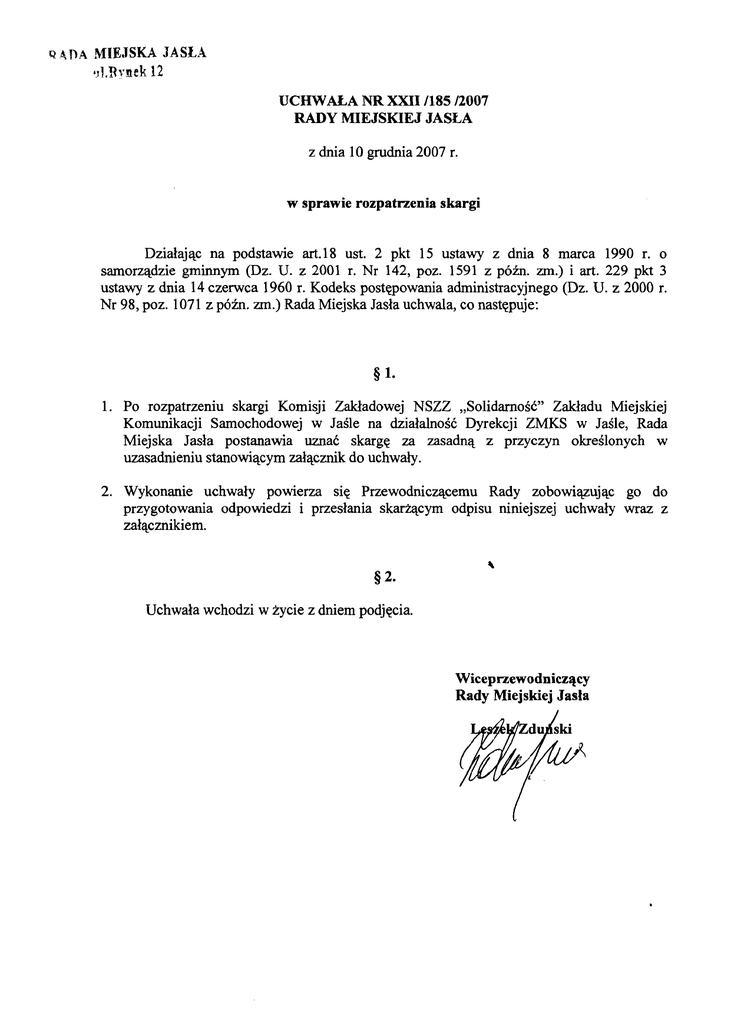 QA nA MIEJSKA JASŁA 'J1.Rvnek 12 UCHWALA NR XXII 1185 12007 RADY MIEJSKIEJ JASŁA z dnia 10 grudnia 2007 r. w sprawie rozpatrzenia skargi Działając na podstawie art.l8 ust. 2 pkt 15 ustawy z dnia 8 marca 1990 r. o samorządzie gminnym (Dz. U. z 2001 r. Nr 142, poz. 1591 z późno zm.) i art. 229 pkt 3 ustawy z dnia 14 czerwca 1960 r. Kodeks postępowania administracyjnego (Dz. U. z 2000 r. Nr 98, poz. 1071 z późno zm.) Rada Miejska Jasła uchwala, co następuje: §l. 1. Po rozpatrzeniu skargi Komisji Zakładowej NSZZ "Solidarność" Zakładu Miejskiej Komunikacji Samochodowej w Jaśle na działalność Dyrekcji ZMKS w Jaśle, Rada Miejska Jasła postanawia uznać skargę za zasadną z przyczyn określonych w uzasadnieniu stanowiącym załącznik do uchwały. 2. Wykonanie uchwały powierza się Przewodniczącemu Rady zobowiązując go do przygotowania odpowiedzi i przesłania skarżącym odpisu niniejszej uchwały wraz z załącznikiem. , § 2. Uchwała wchodzi w życie z dniem podjęcia. Wiceprzewodniczący Rady Miejskiej Jasła Załącznik do uchwały Rady Miejskiej Jasła Nr XXII / 185 / 2007 z dnia 10 grudnia 2007 r. Uzasadnienie W dniu 20 lipca 2007 r. wpłynęła skarga do Urzędu Miasta w Komisji Zakładowej NSZZ "Solidarność" Złv1KS w Jaśle dotycząca: 1.Nieprawidłowości Jaśle w organizacji czasu pracy. 2. Nie przekazywania wyżej wymienionemu związkowi zawodowemu składek członkowskich. 3. Zakupu samochodu IVECO DAILY 49-12. 4. Nie zapewnienia pracownikom odzieży ochronnej. Z przyczyn podanych poniżej skargę należy uznać za zasadną. Ad. 1. W zakresie nieprawidłowości w organizacji czasu pracy - należy stwierdzić, że takie zjawiska miały miejsce. Dotyczyły one braku zapewnienia odpoczynku dobowego i tygodniowego, co było wynikiem wadliwego planowania czasu pracy. Dochodziło także do przekroczeń limitu godzin nadliczbowych. Ustalenia powyższe potwierdza kontrola Państwowej Inspekcji Pracy w Złv1KS Jasło przeprowadzona w dniach 20-22.06.2007 badająca drobiazgowo poszczególne przypadki - wyniki kontroli w tym zakresie zawarto w części IV protokołu kontroli z dnia 22.06.2007 r. Ad. 2. W zakresie nie przekazywanie zawodowemu składek członkowskich. Składki wymIemonemu związkowi zawodowy nie były regularnie odprowadzane. W toku kontroli Zespołu Kontrolnego Komisji Rewizyjnej Rady Miejskiej Jasła ustalono, że kwota zaległości z tytułu nie odprowadzonych składek za 2007 rok; za miesiące od lutego do lipca, wynosi 7947,94 zł. Ustalenia te zawarto w załączniku Nr 10 do Protokołu z dnia 19.11.2007 r. z Kontroli kompleksowej przeprowadzonej w Złv1KS w Jaśle. Obowiązek odprowadzania składek na rachunek bankowy związku zawodowego wynika wprost z art. 33\ ust. 2 ustawy z dnia 23 maja 1991 r. o związkach zawodowych (t.j. Dz. U. z 2001 r. Nr 79 poz. 854 ze zm.). na związek wyżej Ad. 3. W zakresie zakup samochodu IVECO DAILY 49-12. Z analizy otrzymanych dokumentów oraz opinii prawnej wynika, że w sprawie zakupu samochodu IVECO DAILY 49-12 nie dotrzymano należytej dbałości o przestrzeganie przepisów prawa WYnikających z ustawy z dnia 29 stycznia 2004 r. o zamówieniach publicznych oraz z ustawy z dnia 30 czerwca 2005 r. -, o finansach publicznych - naruszono w tym zakresie dyscyplinę finansową. Zakupy środków trwałych w ZNIK.S o określonej przepisami ww. ustawy prawo zamówień publicznych wartości, powinny odbywać się w fonnie pisemnej i w trybie przetargowym, a wynika to z przepisów art. 3 ust. 1 i art. 9 ust. 1 tej ustawy. Ad. 4. W zakresie nie zapewnienia pracownikom odzieży ochronnej. Normy wyposażenia pracowników w odzież i obuwie robocze reguluje załącznik Nr 9 do Układu Zbiorowego Pracy. Zasady wypłacania ekwiwalentu za pranie i naprawę odzieży roboczej ustalono w "Porozumieniu" z dnia 12.01.2005 r. zawartym pomiędzy pracodawcą, a związkami zawodowymi. Na podstawie "kart ewidencji wyposażenia" stwierdzić można, że kierowcy nie mają na bieżąco wydawanej odzieży roboczej mimo, że ekwiwalent nie jest wypłacany. Państwowa Inspekcja Pracy stwierdziła, że braki w wyposażeniu w odzież i obuwie robocze dotyczą w praktyce wszystkich kierowców. Ustalenia w tym zakresie zawarto w części III protokołu kontroli PIP z dnia 22.06.2007 r. Ad. 5. W zakresie Zakładowego funduszu świadczeń socjalnych. Z ustaleń dokonanych przez Inspektora Pracy wynika, że w ZNIK.S w Jaśle obniżone zostały odpisy na Zakładowy fundusz świadczeń socjalnych do wysokości 8% (zamiast ustawowych 37,5%). Dokonano tego na podstawie Protokołu zawartego pomiędzy Dyrekcją ZNIK.S a działającymi w zakładzie organizacjami związkowymi. Inspektor ustalił jednocześnie, że Protokołu tego nie zarejestrowano w Olf' w Rzeszowie. Skutkiem tego ZNIK.S powinien odprowadzić na rachunek funduszu pełny odpis a nie ograniczony do wysokości 8%. Skutkiem tego także i ten zarzut skargi należy uznać za uzasadniony. Biorąc pod uwagę powyższe argumenty oparte na pracy Zespołu Kontrolnego nr 3/2007 Komisji Rewizyjnej Rady Miejskiej Jasła oraz ustaleniach zawartych w Protokole Kontroli Kompleksowej z dnia 19.11.2007 roku oraz z uwagi na ustalenia kontroli Państwowej Inspekcji Pracy przeprowadzonej w ZMKS w Jaśle w dniach 20-22.06.2007 roku, skargę należy uznać za zasadną.