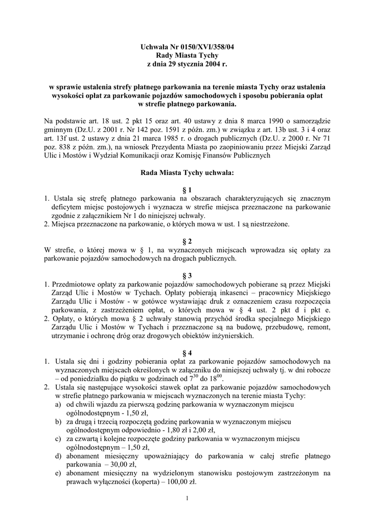 8FKZDáD1U;9, Rady Miasta Tychy z dnia 29 stycznia 2004 r. ZVSUDZLHXVWDOHQLDVWUHI\SáDWQHJRSDUNRZDQLDQDWHUHQLHPLDVWD7\FK\RUD]XVWDOHQLD Z\VRNRFLRSáDW]DSDUNRZDQLHSRMD]GyZVDPRFKRGRZ\FKLVSRVREXSRELHUDQLDRSáDW ZVWUHILHSáDWQHJRSDUNRZDQLD Na podstawie art. 18 ust. 2 SNW RUD] DUW XVWDZ\ ] GQLD PDUFD R VDPRU]G]LH gminnym (Dz.U. z 2001 r. Nr 142 poz. 1591 z Sy(Q]PZ]ZL]NX]DUWEXVWLRUD] art. 13f ust. 2 ustawy z dnia 21 marca 1985 r. o drogach publicznych (Dz.U. z 2000 r. Nr 71 poz. 838 z Sy(Q]PQDZQLRVHN3UH]\GHQWD0LDVWDSR]DRSLQLRZDQLXSU]H]0LHMVNL=DU]G 8OLFL0RVWyZL:\G]LDá.RPXQLNDFMLRUD].RPLVM )LQDQVyZ3XEOLF]Q\FK Rada Miasta Tychy uchwala: §1 8VWDOD VL VWUHI SáDWQHJR SDUNRZDQLD QD REV]DUDFK FKDUDNWHU\]XMF\FK VL ]QDF]Q\P deficytem miejsc postojowych i wyznacza w strefie miejsca przeznaczone na parkowanie ]JRGQLH]]DáF]QLNLHP1UGRQLQLHMV]HMXFKZDá\ 0LHMVFDSU]H]QDF]RQHQDSDUNRZDQLHRNWyU\FKPRZDZXVWVQLHVWU]H*RQH §2 : VWUHILH R NWyUHM PRZD Z QD Z\]QDF]RQ\FK PLHMVFDFK ZSURZDG]D VL RSáDW\ ]D parkowanie pojazdów samochodowych na drogach publicznych. §3 3U]HGPLRWRZHRSáDW\]DSDUNRZDQLHSRMD]GyZVDPRFKRGRZ\FKSRELHUDQHVSU]H]0LHMVNL =DU]G 8OLF L 0RVWyZ Z 7\FKDFK 2SáDW\ SRELHUDM LQNDVHQFL ± SUDFRZQLF\ 0LHMVNLHJR =DU]GX 8OLF L 0RVWyZ Z JRWyZFH Z\VWDZLDMF GUXN ] R]QDF]HQLHP F]DVX UR]SRF] FLD SDUNRZDQLD ] ]DVWU]H*HQLHP RSáDW R NWyU\FK PRZD Z XVW pkt d i pkt e. 2SáDW\ R NWyU\FK PRZD XFKZDá\ VWDQRZL SU]\FKyG URGND VSHFMDOQHJR 0LHMVNLHJR =DU]GX 8OLF L 0RVWyZ Z 7\FKDFK L SU]H]QDF]RQH V QD EXGRZ SU]HEXGRZ UHPRQW XWU]\PDQLHLRFKURQ GUyJRUD]GURJRZ\FKRELHNWyZLQ*\QLHUVNLFK §4 1. 8VWDOD VL GQL L JRG]LQ\ SRELHUDQLD RSáDW ]D SDUNRZDQLH SRMD]GyZ VDPRFKRGRZ\FK QD Z\]QDF]RQ\FKPLHMVFDFKRNUHORQ\FKZ]DáF]QLNXGRQLQLHMV]HMXFKZDá\WMZGQLURERF]H ±RGSRQLHG]LDáNXGRSLWNXZJRG]LQDFKRG30 do 1800. 2. 8VWDOD VL QDVW SXMFH Z\VRNRFL VWDZHN RSáDW ]D SDUNRZDQLH SRMD]GyZ VDPRFKRGRZ\FK ZVWUHILHSáDWQHJRSDUNRZDQLDZPLHMVFDFKZ\]QDF]RQ\FKQDWHUHQLHPLDVWD7\FK\ a) RGFKZLOLZMD]GX]DSLHUZV]JRG]LQ SDUNRZDQLDZZ\]QDF]RQ\PPLHMVFX RJyOQRGRVW SQ\P]á b) ]DGUXJLWU]HFLUR]SRF] WJRG]LQ SDUNRZDQLDZZ\]QDF]RQ\PPLHMVFX RJyOQRGRVW SQ\PRGSRZLHGQLR]áL]á c) ]DF]ZDUWLNROHMQHUR]SRF] WHJRG]LQ\SDUNRZDQLDZZ\]QDF]RQ\PPLHMVFX RJyOQRGRVW SQ\P±]á d) DERQDPHQW PLHVL F]Q\ XSRZD*QLDMF\ GR SDUNRZDQLD Z FDáHM VWUHILH SáDWQHJR SDUNRZDQLD±]á e) DERQDPHQW PLHVL F]Q\ QD Z\G]LHORQ\P VWDQRZLVNX SRVWRMRZ\P ]DVWU]H*RQ\P QD SUDZDFKZ\áF]QRFLNRSHUWD±]á 1 3. :\G]LDá .RPXQLNDFML Z 7\FKDFK Z X]JRGQLHQLX ] 3UH]\GHQWHP 0LDVWD 7\FK\ Z\]QDF]\ Z VWUHILH SáDWQHJR SDUNRZDQLD ]DVWU]H*RQH VWDQRZLVND SRVWRMRZH NRSHUW\ Z FHOX NRU]\VWDQLD]QLFKQDSUDZDFKZ\áF]QRFLZRNUHORQ\FKJRG]LQDFKOXEFDáRGRERZR 4. :\G]LDá.RPXQLNDFMLZ7\FKDFKZX]JRGQLHQLX]3UH]\GHQWHP0LDVWD7\FK\Z\]QDF]\Z VWUHILHSáDWQHJRSDUNRZDQLDPLHMVFDSU]H]QDF]RQHQDSDUNRZDQLHR]QDNRZDQ\FKSRMD]GyZ NRQVWUXNF\MQLH SU]H]QDF]RQ\FK GR SU]HZR]X RVyE QLHSHáQRVSUDZQ\FK R REQL*RQHM VSUDZQRFLUXFKRZHMJG]LHRERZL]\ZDüE G]LH]HURZDVWDZNDRSáDW\ 5. :SURZDG]DVL ]HURZVWDZN RSáDW\GODX*\WNRZQLNyZGURJLZ\PLHQLRQ\FKZ]DáF]QLNX 1UGRQLQLHMV]HMXFKZDá\ §5 2SáDW\DERQDPHQWRZHRNWyU\FKPRZDZXVWpkt d i SNWHXFKZDá\XLV]F]DVL SRSU]H] Z\NXSLHQLH NDUW\ DERQDPHQWRZHM .DUW\ DERQDPHQWRZH PXV] E\ü XPLHV]F]RQH ]D SU]HGQL V]\ESRMD]GXVDPRFKRGRZHJRZVSRVyENWyU\QLHEXG]LZWSOLZRFLFRGRZD*QRFLNDUW\ §6 0LHMVNL=DU]G8OLFL0RVWyZZ7\FKDFKXSRZD*QLRQ\MHVWGRNRQWUROLXLV]F]DQLDRSáDW]D SDUNRZDQLHSRMD]GyZVDPRFKRGRZ\FKNWyU\FKVWDZNL]RVWDá\RNUHORQHZXVW XFKZDá\ ,QNDVHQFL ± SUDFRZQLF\ 0LHMVNLHJR =DU]GX 8OLF L 0RVWyZ NRQWUROHU]\ Z\NRQXM NRQWURO SRSU]H] VSUDZG]DQLH ZQRV]HQLD RSáDW ]D F]DV SDUNRZDQLD SRMD]GyZ VDPRFKRGRZ\FKRUD]VSUDZG]DQLHZD*QRFLNDUWDERQDPHQWRZ\FK : UD]LH VWZLHUG]HQLD QLH XLV]F]HQLD RSáDW NWyU\FK VWDZNL ]RVWDá\ RNUHORQH Z XVW XFKZDá\ NRQWUROHU]\ GRNXPHQWXM EUDN RSáDW\ SRSU]H] VSRU]G]HQLH Z GZyFK HJ]HPSODU]DFK ZH]ZDQLD GR ]DSáDW\ RSáDW\ GRGDWNRZHM Z Z\VRNRFL ]á L XPLHV]F]HQLD MHGQHJR HJ]HPSODU]D ZH]ZDQLD ]D Z\FLHUDF]N SRMD]GX VDPRFKRGRZHJR NWyUHJR NLHURZFDQLHXLFLáRSáDW\OXEZLQQ\PRGSRZLHGQLPPLHMVFX 2ND]DQLH Z VLHG]LELH 0LHMVNLHJR =DU]GX 8OLF L 0RVWyZ Z WHUPLQLH GQL RG GDW\ Z\VWDZLHQLD ZH]ZDQLD NDUW\ DERQDPHQWRZHM ZD*QHM Z GDFLH Z\VWDZLHQLD ZH]ZDQLD ]ZDOQLD]RERZL]NXXLV]F]HQLDRSáDW\GRGDWNRZHM 8LV]F]HQLH RSáDW\ GRGDWNRZHM QDVW SXMH Z VLHG]LELH 0LHMVNLHJR =DU]GX 8OLF L 0RVWyZ w Tychach w terminie 14 dni od daty wystawienia wezwania. 2SáDWD GRGDWNRZD VWDQRZL SU]\FKyG URGND VSHFMDOQHJR 0LHMVNLHJR =DU]GX 8OLF L0RVWyZ]SU]H]QDF]HQLHPRNUHORQ\PZXVWXFKZDá\ §7 =RERZL]XMHVL 6WUD*0LHMVNGRGRNRQ\ZDQLDVSUDZG]DQLD ZD*QRFL NDUW DERQDPHQWRZ\FK LLQIRUPRZDQLDNRQWUROHUyZRVWZLHUG]RQHMQLHZD*QRFLNDUW\DOEREUDNXNDUW\DERQDPHQWRZHM Z SRMD]GDFK VDPRFKRGRZ\FK ]DSDUNRZDQ\FK QD ]DVWU]H*RQ\FK VWDQRZLVNDFK SRVWRMRZ\FK (kopertach). §8 'R GRFKRG]HQLD RSáDW PDM ]DVWRVRZDQLH SU]HSLV\ R SRVW SRZDQLX HJ]HNXF\MQ\P w administracji. §9 :\NRQDQLH8FKZDá\SRZLHU]DVL 3UH]\GHQWRZL0LDVWD7\FK\ § 10 8FKZDáD ZFKRG]L Z *\FLH SR XSá\ZLH GQL RG MHM RJáRV]HQLD Z ']LHQQLNX 8U] GRZ\P :RMHZyG]WZDOVNLHJR 2 Nr 0150/XVI/ /04. Rady Miasta Tychy z dnia 29 stycznia 2004 r. STREFY SáDWQHJRSDUNRZDQLDQDWHUHQLH0LDVWD7\FK\ 1. ul. G. Roweckiego - SRERF]DRGXO'EURZVNLHJRGR$O1LHSRGOHJáRFL - SRERF]DRGXO(OIyZGR$O1LHSRGOHJáRFL 2. ul. Dmowskiego - zatoki (po stronie wschodniej) od Hotelu Tychy do Al. 3LáVXGVNLHJR $O1LHSRGOHJáRFL - SDUNLQJSU]HG8U] GHP0LDVWDLEDQNDPL - SDUNLQJLZURGNRZ\PSDVLH]LHOHQL 4. ul. Armii Krajowej - przy pawilonie handlowym na os. „O” XO.RFLXV]NL - parking - lewa strona od ul. Miarki do ul. Sienkiewicza 6. ul. 'DPURWDRG5\QNXGRVNU]\*RZDQLD]XO:ROQRFL 7. ul. Biblioteczna - od ul. Budowlanych do ul. Batorego - VWURQD]DFKRGQLD±]DWRNDQDSyáQRFRGXO%DWRUHJR 8. Plac %DF]\VNLHJR - SRREXVWURQDFKXO%DWRUHJRRGXO%LEOLRWHF]QHMGRXO%RFKHVNLHJR - SU]\XO%RFKHVNLHJRZRNROLF\NLQD$QGURPHGD 9. ul. Budowlanych - SDUNLQJSU]\5HMRQRZ\P8U] G]LH3UDF\ 10. Dworzec PKP – Tychy - SRáXGQLRZDVWURQDS WOL 11. ul. Asnyka - ]DFKRGQLDVWURQDXOLF\SU]\=DNáDG]LH(QHUJHW\F]Q\P 12. ul. Dmowskiego - SDUNLQJSRPL G]\Ä%UDP6áRFD´DEXG\QNLHP3.2 13. Al. 3LáVXGVNLHJR - VW