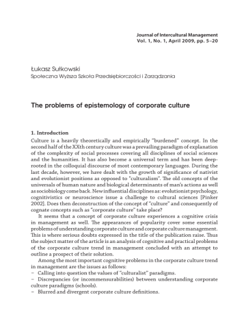 Journal of Intercultural Management Vol. 1, No. 1, April 2009, pp. 5–20 Łukasz Sułkowski Społeczna Wyższa Szkoła Przedsiębiorczości i Zarządzania The problems of epistemology of corporate culture 1. Introduction Culture is a heavily theoretically and empirically “burdened” concept. In the second half of the XXth century culture was a prevailing paradigm of explanation of the complexity of social processes covering all disciplines of social sciences and the humanities. It has also become a universal term and has been deeprooted in the colloquial discourse of most contemporary languages. During the last decade, however, we have dealt with the growth of significance of nativist and evolutionist positions as opposed to “culturalism”. The old concepts of the universals of human nature and biological determinants of man’s actions as well as sociobiology come back. New influential disciplines as: evolutionist psychology, cognitivistics or neuroscience issue a challenge to cultural sciences [Pinker 2002]. Does then deconstruction of the concept of “culture” and consequently of cognate concepts such as “corporate culture” take place? It seems that a concept of corporate culture experiences a cognitive crisis in management as well. The appearances of popularity cover some essential problems of understanding corporate culture and corporate culture management. This is where serious doubts expressed in the title of the publication raise. Thus the subject matter of the article is an analysis of cognitive and practical problems of the corporate culture trend in management concluded with an attempt to outline a prospect of their solution. Among the most important cognitive problems in the corporate culture trend in management are the issues as follows: - Calling into question the values of “culturalist” paradigms. - Discrepancies (or incommensurabilities) between understanding corporate culture paradigms (schools). - Blurred and divergent corporate culture definitions. Łukasz Sułkowski - Unclear and variously described correlations between corporate culture and structure, strategy and organizational environment. - Lack of consensus of researchers on a model and typology of corporate culture i.e. its dimensions, components or levels. 2. The cognitive evolutionism-based criticism of culturalist approach The culturalist approaches interpret the societal world and human behaviour through the prism of cultural diversification i.e. human communities which have different values, norms and culture patterns. Classical nature-versusculture opposition confronts man’s innate and genetic conditions and learned assimilated patterns transmitted by the society. The second half of the XXth century is the period of indisputable dominance of culturalism which rejects or at least marginalises the significance of the universalism of biological human nature. Culturalism was a sui generis reaction to cognitive and political excesses of a vulgarised form of social Darwinism which had become one of the ideological foundations of the XXth century totalitarian systems. Frenology and eugenics gave a pseudo scientific justification to discrimination, racism and, in extreme version, genocide inflicted upon “lower” and “genetically inferior” races. It appears, however, that the contemporary development of biological sciences, evolutionary psychology, cognitivistics and neuroscience allows to break this tradition of culturalist-nativist antagonism indicating a possibility of existence of a moderate position combining the vision of universal human nature with its biological roots and the cultural diversity concept. According to this approach culture is being created in a close relation with biology [Barkow (ed.) 2006]. The ability of symbolic thinking and creation of social institutions is an innate evolutionarily formed characteristic of human nature which, anyway, is a continuation of clearly visible trend among primates [Tomasello 2002, pp. 286–287]. Neo-evolutionist research of culture makes it possible to construct mathematical models which accurately diagnose and forecast human behaviour. Commencing with sociobiological and evolutionist concepts we can arrive at the foundations of functioning of the society and culture. The key, albeit concealed, motive of people’s decisions remains “the egoism of genes”, thus genetic reproduction equal to duration and development of the complex information structure which genes actually are. Organisms and species are to some extent “a side effect” of that development of information structures. Such an assumption was the basis of research explaining human behaviours related to drive for reproduction, relations with family and kinsmen, the problems of an organism’s survival, kin and non-relative altruism, cooperation and conflict within social groups and the sexual diversity of human species [Buss 2007, In the article two designations: cognitive evolutionism and neoevolutionism are used interchangeably and in a bit simplified way. The problems of epistemology of corporate culture pp. 36–70]. The development of human brain in the course of evolution became an adaptive effect conducive to reproduction. Due to it man, along with the development of cognitive skills and complexity of human communities, started to create and form basic organizational skills: division of labour, cooperation, leadership and societal communication. The use of evolutionist perspective in social sciences allows for explanation of numerous hard to interpret behaviours. Evolutionary sources of cultural universals such as: language, individual identity, marriage, incest taboo and many others are being studied [Pinker 2005, pp. 617–621]. The structures have been found which enable individuals and communities to detect and eliminate social impostors, in a parasitic manner taking advantage of people’s openness and will to cooperate in a group [Cosmides, Tooby 1996, pp