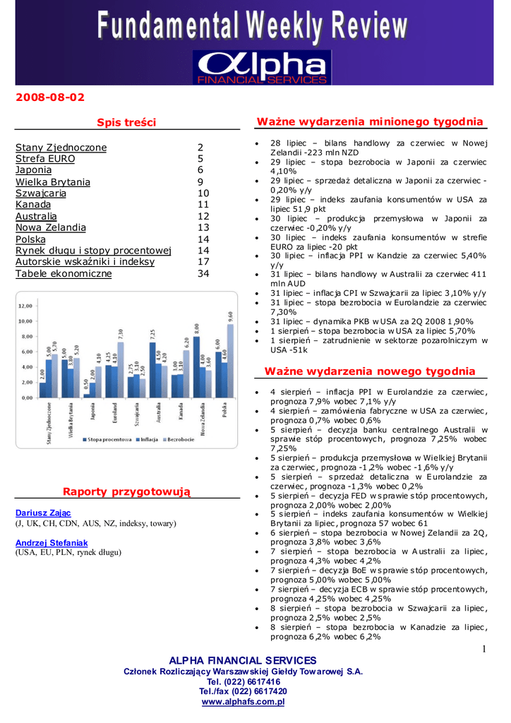 2008-08-02 Ważne wydarzenia minionego tygodnia Spis treści Stany Zjednoczone Strefa EURO Japonia Wielka Brytania Szwajcaria Kanada Australia Nowa Zelandia Polska Rynek dł ugu i stopy procentowej Autorskie wskaźniki i indeksy Tabele ekonomiczne 2 5 6 9 10 11 12 13 14 14 17 34 28 lipiec – bilans handlowy za c zerwiec w Nowej Zelandii -223 mln NZD 29 lipiec – s topa bezrobocia w J aponii za c zerwiec 4 ,10% 29 lipiec – sprzedażdetaliczna w Japonii za czerwiec 0 ,20% y/y 29 lipiec – indeks zaufania kons umentów w USA za lipiec 51 ,9 pkt 30 lipiec – produkc ja przemysł owa w Japonii za czerwiec -0 ,20% y/y 30 lipiec – indeks zaufania konsumentów w strefie EURO za lipiec -20 pkt 30 lipiec – inflac ja PPI w Kandzie za czerwiec 5,40% y/y 31 lipiec – bilans handlowy w Australii za czerwiec 411 mln AUD 31 lipiec – inflac ja CPI w Szwajcarii za lipiec 3 ,10% y/y 31 lipiec – stopa bezrobocia w Eurolandzie za czerwiec 7 ,30% 31 lipiec – dynamika PKB w USA za 2Q 2008 1 ,90% 1 sierpień– s topa bezroboc ia w USA za lipiec 5 ,70% 1 sierpień– zatrudnienie w sektorze pozarolniczym w USA -51k Ważne wydarzenia nowego tygodnia Raporty przygotowują Dariusz Zając (J, UK, CH, CDN, AUS, NZ, indeksy, towary) Andrzej Stefaniak (USA, EU, PLN, rynek dł ugu) 4 sierpień – inflacja PPI w E urolandzie za czerwiec , prognoza 7 ,9% wobec 7 ,1% y/y 4 sierpień– zamówienia fabryczne w USA za czerwiec , prognoza 0 ,7% wobec 0 ,6% 5 sierpień – decyzja banku centralnego Australii w sprawie stóp procentowyc h, prognoza 7 ,25% wobec 7 ,25% 5 sierpień– produkcja przemysł owa w Wielkiej Brytanii za c zerwiec , prognoza -1 ,2% wobec -1 ,6% y/y 5 sierpień – s przedaż detalic zna w E urolandzie za czerwiec , prognoza -1 ,3% wobec 0 ,2% 5 sierpień– decyzja FED w s prawie s tóp procentowych, prognoza 2 ,00% wobec 2 ,00% 5 s ierpień– indeks zaufania konsumentów w Wielkiej Brytanii za lipiec , prognoza 57 wobec 61 6 sierpień– stopa bezrobocia w Nowej Zelandii za 2Q , prognoza 3 ,8% wobec 3 ,6% 7 sierpień – stopa bezroboc ia w A ustralii za lipiec , prognoza 4 ,3% wobec 4 ,2% 7 sierpień– decyzja BoE w s prawie s tóp procentowych, prognoza 5 ,00% wobec 5 ,00% 7 sierpień– dec yzja ECB w sprawie stóp procentowych, prognoza 4 ,25% wobec 4 ,25% 8 sierpień – stopa bezrobocia w Szwajcarii za lipiec , prognoza 2 ,5% wobec 2 ,5% 8 sierpień – stopa bezroboc ia w Kanadzie za lipiec , prognoza 6 ,2% wobec 6 ,2% 1 ALPHA FINANCIAL SERVICES Czł onek Rozliczający Warszaw skiej Gieł dy Tow arowej S.A. Tel. (022) 6617416 Tel./fax (022) 6617420 www.alphafs.com.pl Stany Zjednoczone Ostatni tydzień przyniósł kilka ważnych publikacji makroekonomicznych; pierwsze z nich to dane z rynku pracy, a drugie to dane o dynamice wzrostu PKB w II kwartale. Dodatkowo wydarzeniem ostatnich dni jest także mocna przecena Ropy Naftowej, która wyraźnie spada zbliż ając się już do poziomu 120 usd. Surowiec ten ma ważne wsparcie w okolicach 122 usd. Jeśli doszł oby do pokonania tego poziomu oraz dodatkowo ważnego wsparcia 120 usd to doszł oby do odwrócenia średnioterminowego trendu na spadkowy sugerując spadki nawet w kierunku poziomu 100 usd. Dodatkowo spadająca cena Ropy Naftowej będzie miał a chwilowo pozytywny wpł yw na notowania na gieł dach. Należy pamiętać, że wzrosty cen Ropy Naftowej do poziomu 145 usd był gł ównie zasł ugą spekulantów jednak u podł oż a tego wzrostu znajdowałsięsilny popyt pochodzący z C hin i Indii. Pęknięcie bańki będzie więc oznaczać, że zmniejsza się popyt wynikający z aktywności ludzi w tych państwach, a to z kolei będzie zagrożeniem dla koniunktury gospodarczej na cał ym świecie. Wiele analiz wskazuje na to, że poziomem równowagi sąteraz okolice 80 usd za barył kę. Miesiąc po zakończeniu kwartał u ukazał y się pierwsze dane o dynamice wzrostu PKB w II kwartale 2008 roku. Byłto dopiero pierwszy odczyt – pierwsze przybliż enie oznacza, że zawierał w sobie dane jedynie z dwóch pierwszych miesięcy tworzących kwartał . Okazał o się, ż e pomimo bardzo optymistycznych prognoz dynamika wzrostu PKB wyniosł a +1,9 %, prognoza +1,8 % czyli więcej niżzakł adał y szacunki jednak rynek w pierwszej reakcji odebrałte dane w zupeł nie inny sposób. Wszystko przez interpretacje innych danych publikowanych ł ącznie z ważnym wskaźnikiem PKB. Między innymi ukazał y się także dane o inflacji w II kwartale – delator PKB - pokazał , że inflacja … nie jest problemem wyniosł a 1,1 %, prognoza 2,4 %. Tak wyraźny spadek inflacji spowodował zdecydowany spadek oczekiwań co do momentu publikacji pierwszej decyzji o podwyżce stóp procentowych w USA, która po piątkowej sesji przewidywana jest dopiero na styczeń 2009 roku, gdy ma dojść do podwyż ki stóp o 25 punktów bazowych. Dla rynków finansowych, a szczególnie inwestorów krótkoterminowych ważne był y dane z rynku pracy. Dane makroekonomiczne z rynku pracy skł adał y się z dwóch subraportów; okazał y sięnieco lepsze -51k, od prognoz -75k w subraporcie zmiany zatrudnienia w sektorze pozarolniczym, 2 ALPHA FINANCIAL SERVICES Czł onek Rozliczający Warszaw skiej Gieł dy Tow arowej S.A. Tel. (022) 6617416 Tel./fax (022) 6617420 www.alphafs.com.pl oraz nieco gorsze 5,7 % od prognoz 5,6 % w subraporcie ogólny poziom bezrobocia. Jak widaćbezrobocie w lipcu wzrosł o co jest oczywistym sygnał em trwającego spowolnienia gospodarczego w USA. Sygnał y te potwierdza cotygodniowy raport z amerykańskiego rynku pracy, który niespodziewanie wzrósł do poziomu 448k, prognoza 390k, poprzednio 406k. Natomiast zupeł nym przeciwieństwem jest raport ADP, który pozytywnie zaskoczył wskazując, ż e w lipcu w sektorze prywatnym powstał o 9k nowych miejsc pracy, zamiast ubyć 48k jak zakł adał y prognozy, w czerwcu byłto ubytek 79k. Dane z rynku pracy pokazują ogólny niekorzystny trend wskazując na wyraźny okres spowolnie