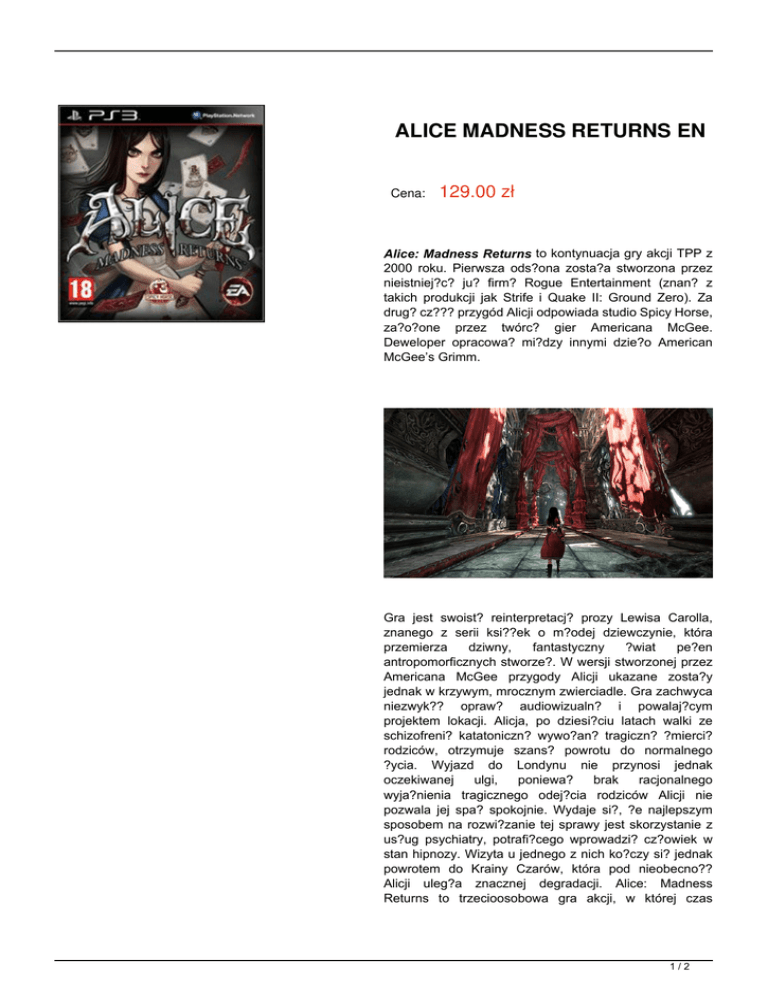 ALICE MADNESS RETURNS EN Cena: 129.00 zł Alice: Madness Returns to kontynuacja gry akcji TPP z 2000 roku. Pierwsza ods?ona zosta?a stworzona przez nieistniej?c? ju? firm? Rogue Entertainment (znan? z takich produkcji jak Strife i Quake II: Ground Zero). Za drug? cz??? przygód Alicji odpowiada studio Spicy Horse, za?o?one przez twórc? gier Americana McGee. Deweloper opracowa? mi?dzy innymi dzie?o American McGee’s Grimm. Gra jest swoist? reinterpretacj? prozy Lewisa Carolla, znanego z serii ksi??ek o m?odej dziewczynie, która przemierza dziwny, fantastyczny ?wiat pe?en antropomorficznych stworze?. W wersji stworzonej przez Americana McGee przygody Alicji ukazane zosta?y jednak w krzywym, mrocznym zwierciadle. Gra zachwyca niezwyk?? opraw? audiowizualn? i powalaj?cym projektem lokacji. Alicja, po dziesi?ciu latach walki ze schizofreni? katatoniczn? wywo?an? tragiczn? ?mierci? rodziców, otrzymuje szans? powrotu do normalnego ?ycia. Wyjazd do Londynu nie przynosi jednak oczekiwanej ulgi, poniewa? brak racjonalnego wyja?nienia tragicznego odej?cia rodziców Alicji nie pozwala jej spa? spokojnie. Wydaje si?, ?e najlepszym sposobem na rozwi?zanie tej sprawy jest skorzystanie z us?ug psychiatry, potrafi?cego wprowadzi? cz?owiek w stan hipnozy. Wizyta u jednego z nich ko?czy si? jednak powrotem do Krainy Czarów, która pod nieobecno?? Alicji uleg?a znacznej degradacji. Alice: Madness Returns to trzecioosobowa gra akcji, w której czas 1/2 sp?dza si? na eksploracji kolejnych lokacji, a tak?e walce z ró?nego rodzaju przeciwnikami. Do dyspozycji Alicji oddanych zosta?o wiele rodzajów broni, z no?em kuchennym i ?mierciono?nymi kartami na czele. W wyprawie towarzysz? jej postacie znane z historii o Krainie Czarów. Zabaw? dzieli si? pomi?dzy pokonywanie etapów typowo platformowych oraz fragmentów, w których gracz skupia si? stricte na walce. W grze nie zabrak?o równie? prostych zagadek logicznych, obecnych w cz??ci pierwszej (np. próba odnalezienia przej?cia po?ród niezliczonej liczby drzwi). Powróci?y tak?e znane doskonale krainy – zamek Królowej Kier, Dolina ?ez, czy te? Forteca Drzwi. Zobacz wideo: ?ród?o: http://www.gry-online.pl/S016.asp?ID=12872 Szczegóły wersja językowa ANGIELSKA 2/2 Powered by TCPDF (www.tcpdf.org)