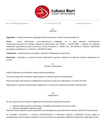 m: [email protected] t: +48 793 409 709 www.lukaszbort.pl §1 Definicje Regulamin – niniejszy dokument regulujący zasady korzystania z Portalu www.lukaszbort.pl Portal - serwis internetowy www.lukaszbort.pl znajdujący się w pod adresem internetowym http://www.lukaszbort.pl, którego wyłącznym właścicielem jest FIT4ALL - ŁUKASZ BORT – wpisana do ewidencji działalności gospodarczej przez burmistrza miasta Pruszków nr. 18392, NIP: 534-218-88-31, REGON: 143237240, posiadająca siedzibę przy ul. Żelaznej 1, 05-804 Pruszków. Użytkownik – osoba fizyczna korzystająca z płatnych i bezpłatnych usług Portalu Rejestracja – procedura, w procesie której Użytkownik otrzymuje możliwość zarządzania usługami dostępnymi na Portalu. §2 Kontakt ze specjalistą Każdy Użytkownik ma możliwość zadania pytania specjaliście. Portal zastrzega sobie możliwość odpowiadania na wybrane pytania Użytkowników. Portal zastrzega sobie prawo do publikowania wybranych pytań oraz odpowiedzi, na swoich stronach. Odpowiedzi na wybrane pytania będą publikowane w serwisie bez podawania danych Użytkowników. §3 Usługi płatne W celu rozpoczęcia korzystania z odpłatnych usług Portalu Użytkownik powinien: • Dokonać wyboru jednej z konsultacji, treningów personalnych lub innych usług. • Dokonać przedpłaty wybranej usługi. Płatności można dokonać za pomocą przelewu bankowego lub za pośrednictwem systemu płatności internetowych. W przypadku korzystania z serwisów pośredniczących w dokonaniu płatności Użytkownik wyraża zgodę na przekazywanie swoich danych osobowych temu serwisowi oraz akceptuje regulamin świadczenia usług tego serwisu. §4 Warunki świadczenia usług Indywidualny plan dietetyczny lub treningowy zostanie przesłany w formie elektronicznej na wskazany przez użytkownika adres e-mail. Ceny usług wyrażone są w złotych polskich (PLN) i są cenami brutto, co oznacza, iż zawierają one podatek od towarów i usług (VAT). Użytkownik oświadcza, iż przyjął do wiadomości i rozumie, że: stosowanie diety określonego rodzaju może być wykluczone w przypadku istnienia przeciwwskazań zdrowotnych do jej stosowania. Użytkownik oświadcza, iż decydując się na korzystanie z usług świadczonych przez Portal robi to własną odpowiedzialność. FIT4ALL - ŁUKASZ BORT posiada ochronę ubezpieczeniową w zakresie odpowiedzialności cywilnej, związanej z prowadzeniem działalności o charakterze sportowo-rekreacyjnym (wykonywania zawodu trenera, instruktora sportowego). Indywidualne plany dietetyczne oraz indywidualne treningowe mimo, iż przygotowywane będą w oparciu o stan aktualnej wiedzy naukowej, to jednak ze względu na specyfikę i złożoność ludzkiego organizmu nie gwarantują osiągnięcia pożądanych przez Użytkownika efektów, za co FIT4ALL - ŁUKASZ BORT nie ponosi odpowiedzialności. Użytkownik oświadcza, iż wyraża zgodę na otrzymywanie od FIT4ALL - ŁUKASZ BORT, współpracowników lub kontrahentów FIT4ALL - ŁUKASZ BORT, informacji handlowych w rozumieniu obowiązujących przepisów prawa oraz do otrzymywania na adres wskazanego konta poczty elektronicznej wykorzystywanej przez Użytkownika do korespondencji w związku z usługami www.lukaszbort.pl dowolnych ankiet, z tym jednak zastrzeżeniem, iż udzielanie na nie odpowiedzi pozostawione jest do wyłącznej woli Użytkownika, a także informacji związanych z konkursami organizowanymi przez FIT4ALL - ŁUKASZ BORT lub na zlecenie FIT4ALL - ŁUKASZ BORT lub przy jej udziale. Użytkownik ma obowiązek poinformować FIT4ALL - ŁUKASZ BORT lub firmę współpracującą przed rozpoczęciem pierwszego treningu o jakichkolwiek przeciwwskazaniach do trenowania (przebyte choroby, urazy, kontuzje). Użytkownika jak i FIT4ALL - ŁUKASZ BORT lub firmę współpracującą obowiązuje punktualność. Spóźnienie Użytkownika nie oznacza, że FIT4ALL - ŁUKASZ BORT lub firma współpracującą przedłuży trening kosztem innego Użytkownika chyba, że istnieje ku temu sposobność i FIT4ALL - ŁUKASZ BORT lub firma współpracującą zgodzi się na to. Natomiast spóźnienie FIT4ALL - ŁUKASZ BORT lub firmy współpracującej oznacza, że poświęci on swój czas, by trening trwał tyle, ile założono, zgodnie z zamówioną usługą. Użytkownik powinien stawić się na trening w stroju sportowym, tj.: sportowe obuwie (kategorycznie zabronione jest trenowanie w klapkach, japonkach, sandałach), sportowe spodnie (dresy lub krótkie spodnie sportowe), sportowa koszulka. Użytkownik zobowiązany jest przestrzegać regulaminu klubu, w którym ćwiczy z FIT4ALL - ŁUKASZ BORT lub firmą współpracującą. Użytkownik, jeśli chce odwołać umówione wcześniej zajęcia z FIT4ALL - ŁUKASZ BORT lub firmę współpracującą, musi zrobić to minimalnie na 12 godzin przed treningiem. Każdy trening odwołany nie stosując się do tego punktu, będzie uznany za odbyty chyba, że FIT4ALL - ŁUKASZ BORT lub firma współpracująca zadecyduje inaczej. FIT4ALL - ŁUKASZ BORT lub firma współpracującą również jest zobowiązana odwołać trening minimalnie na 12 godzin przed treningiem. Każdy trening odwołany nie stosując się do tego punktu, będzie premiowany gratisowym kolejnym treningiem chyba, że Użytkownik zdecyduje inaczej. Użytkownik wykupuje wejście do klubu fitness we własnym zakresie, zgodnie z ofertą wybranego fitness klubu. §5 Zbieranie informacji W żadnym momencie nie są pobierane dodatkowe informacje identyfikujące użytkownika jeśli nie wyraził na to zgody. Tylko w przypadku rejestracji są zapisywane i przechowywane dane dobrowolnie podane przez użytkownika. Rejestracja jest wymagana tylko w przypadkach zakupu produktów, zapytań przez formularze, przystępowania do programów lojalnościowych i innych form komunikacji związanych z www.lukaszbort.pl czy jego ofertą. FIT4ALL - ŁUKASZ BORT wykorzystuje informacje gromadzone online w celu świadczenia