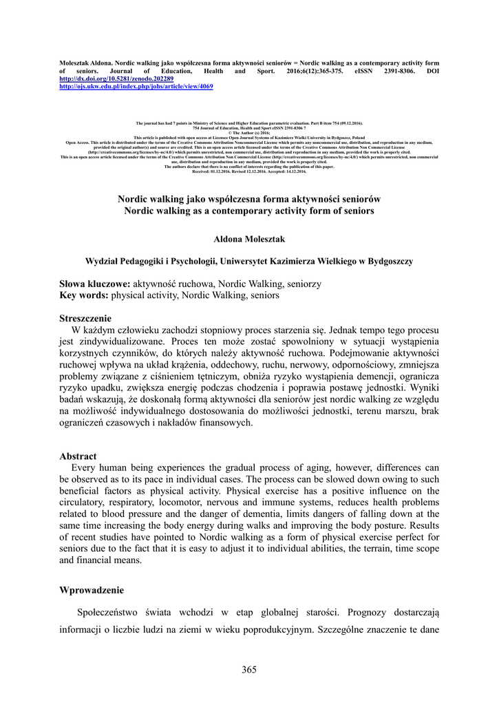 Molesztak Aldona. Nordic walking jako współczesna forma aktywności seniorów = Nordic walking as a contemporary activity form of seniors. Journal of Education, Health and Sport. 2016;6(12):365-375. eISSN 2391-8306. DOI http://dx.doi.org/10.5281/zenodo.202289 http://ojs.ukw.edu.pl/index.php/johs/article/view/4069 The journal has had 7 points in Ministry of Science and Higher Education parametric evaluation. Part B item 754 (09.12.2016). 754 Journal of Education, Health and Sport eISSN 2391-8306 7 © The Author (s) 2016; This article is published with open access at Licensee Open Journal Systems of Kazimierz Wielki University in Bydgoszcz, Poland Open Access. This article is distributed under the terms of the Creative Commons Attribution Noncommercial License which permits any noncommercial use, distribution, and reproduction in any medium, provided the original author(s) and source are credited. This is an open access article licensed under the terms of the Creative Commons Attribution Non Commercial License (http://creativecommons.org/licenses/by-nc/4.0/) which permits unrestricted, non commercial use, distribution and reproduction in any medium, provided the work is properly cited. This is an open access article licensed under the terms of the Creative Commons Attribution Non Commercial License (http://creativecommons.org/licenses/by-nc/4.0/) which permits unrestricted, non commercial use, distribution and reproduction in any medium, provided the work is properly cited. The authors declare that there is no conflict of interests regarding the publication of this paper. Received: 01.12.2016. Revised 12.12.2016. Accepted: 14.12.2016. Nordic walking jako współczesna forma aktywności seniorów Nordic walking as a contemporary activity form of seniors Aldona Molesztak Wydział Pedagogiki i Psychologii, Uniwersytet Kazimierza Wielkiego w Bydgoszczy Słowa kluczowe: aktywność ruchowa, Nordic Walking, seniorzy Key words: physical activity, Nordic Walking, seniors Streszczenie W każdym człowieku zachodzi stopniowy proces starzenia się. Jednak tempo tego procesu jest zindywidualizowane. Proces ten może zostać spowolniony w sytuacji wystąpienia korzystnych czynników, do których należy aktywność ruchowa. Podejmowanie aktywności ruchowej wpływa na układ krążenia, oddechowy, ruchu, nerwowy, odpornościowy, zmniejsza problemy związane z ciśnieniem tętniczym, obniża ryzyko wystąpienia demencji, ogranicza ryzyko upadku, zwiększa energię podczas chodzenia i poprawia postawę jednostki. Wyniki badań wskazują, że doskonałą formą aktywności dla seniorów jest nordic walking ze względu na możliwość indywidualnego dostosowania do możliwości jednostki, terenu marszu, brak ograniczeń czasowych i nakładów finansowych. Abstract Every human being experiences the gradual process of aging, however, differences can be observed as to its pace in individual cases. The process can be slowed down owing to such beneficial factors as physical activity. Physical exercise has a positive influence on the circulatory, respiratory, locomotor, nervous and immune systems, reduces health problems related to blood pressure and the danger of dementia, limits dangers of falling down at the same time increasing the body energy during walks and improving the body posture. Results of recent studies have pointed to Nordic walking as a form of physical exercise perfect for seniors due to the fact that it is easy to adjust it to individual abilities, the terrain, time scope and financial means. Wprowadzenie Społeczeństwo świata wchodzi w etap globalnej starości. Prognozy dostarczają informacji o liczbie ludzi na ziemi w wieku poprodukcyjnym. Szczególne znaczenie te dane 365 mają dla krajów wysoko rozwiniętych, w których proporcja między grupami w poszczególnych okresach życia nie jest zachowana. Brak wymiany międzypokoleniowej ma niekorzystny wpływ na sytuację ekonomiczną tych państw. Dlatego istotne jest dla globalnej gospodarki jak najdłuższe utrzymywanie ludzi w dobrym zdrowiu i sprawności dzięki rozbudowanej polityce profilaktycznej. W celu zmniejszenia wydatków, jakich wymaga starzejące się społeczeństwo, nagłaśnia się wprowadzanie programów przygotowujących młodzież do okresu starości, zgodnie z zasadą wczesnej profilaktyki, która ma zapobiec występowaniu problemów zdrowotnych, społecznych i ekonomicznych. Celem artykułu jest określenie nordic walkingu jako formy aktywności seniorów sprzyjającej zachowaniu sprawności i zwalnianiu procesu starzenia się. Przywołane zostały w nim badania związane z seniorami, którzy podejmując aktywność ruchową, zapobiegają występowaniu chorób oraz spowalniają proces starzenia się organizmu. Aktywność ruchowa społeczeństwa – fakty Geriatrzy stwierdzają, że starzenie się jest procesem fizjologicznym, który prowadzi do zmian narządowych. Organizm każdego człowieka podlega powolnemu procesowi starzenia się, a zachodzące w nim zmiany są nieodwracalne. Tempo tego procesu jest zindywidualizowane i może zostać spowolnione w sytuacji wystąpienia korzystnych czynników. Z tego względu ważne są wszelkiego rodzaju działania prozdrowotne i profilaktyczne, dzięki którym można uzyskać opóźnienie efektów starzenia. Podejmowanie przez ludzi różnych działań może zapobiec wystąpieniu ograniczeń i niepełnosprawności. Wiodącą rolę w tej sferze pełni aktywność ruchowa. Podejmowanie aktywności ruchowej nie tylko sprzyja obniżeniu ciśnienia tętniczego. Badania dowodzą, że wysiłek fizyczny wpływa korzystnie na układ krążenia, oddechowy, ruchu, nerwowy, odpornościowy, zmniejsza występowanie cukrzycy typu 2 i niektórych form raka (np. okrężnicy i piersi) (Garber i in., 1998; Gębka, Kędziora-Kornatowska, 2012). Na pozytywne efekty stosowania wysiłku fizycznego u osób starszych wskazują także Iwona Wierzbicka-Damska i Rafał Szafraniec (2005). Wśród znaczący