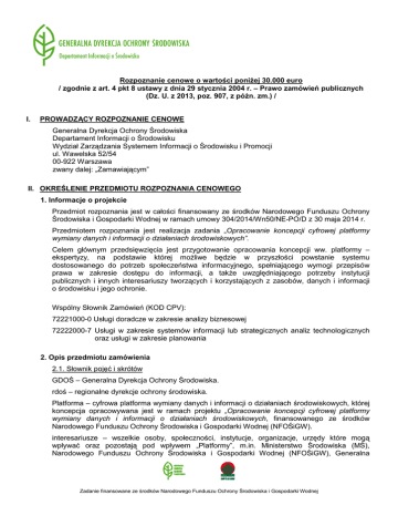 Rozpoznanie cenowe o wartości poniżej 30.000 euro / zgodnie z art. 4 pkt 8 ustawy z dnia 29 stycznia 2004 r. – Prawo zamówień publicznych (Dz. U. z 2013, poz. 907, z późn. zm.) / I. PROWADZĄCY ROZPOZNANIE CENOWE Generalna Dyrekcja Ochrony Środowiska Departament Informacji o Środowisku Wydział Zarządzania Systemem Informacji o Środowisku i Promocji ul. Wawelska 52/54 00-922 Warszawa zwany dalej: „Zamawiającym” II. OKREŚLENIE PRZEDMIOTU ROZPOZNANIA CENOWEGO 1. Informacje o projekcie Przedmiot rozpoznania jest w całości finansowany ze środków Narodowego Funduszu Ochrony Środowiska i Gospodarki Wodnej w ramach umowy 304/2014/Wn50/NE-PO/D z 30 maja 2014 r. Przedmiotem rozpoznania jest realizacja zadania „Opracowanie koncepcji cyfrowej platformy wymiany danych i informacji o działaniach środowiskowych”. Celem głównym przedsięwzięcia jest przygotowanie opracowania koncepcji ww. platformy – ekspertyzy, na podstawie której możliwe będzie w przyszłości powstanie systemu dostosowanego do potrzeb społeczeństwa informacyjnego, spełniającego wymogi przepisów prawa w zakresie dostępu do informacji, a także uwzględniającego potrzeby instytucji publicznych i innych interesariuszy tworzących i korzystających z zasobów, danych i informacji o środowisku i jego ochronie. Wspólny Słownik Zamówień (KOD CPV): 72221000-0 Usługi doradcze w zakresie analizy biznesowej 72222000-7 Usługi w zakresie systemów informacji lub strategicznych analiz technologicznych oraz usługi w zakresie planowania 2. Opis przedmiotu zamówienia 2.1. Słownik pojęć i skrótów GDOŚ – Generalna Dyrekcja Ochrony Środowiska. rdoś – regionalne dyrekcje ochrony środowiska. Platforma – cyfrowa platforma wymiany danych i informacji o działaniach środowiskowych, której koncepcja opracowywana jest w ramach projektu „Opracowanie koncepcji cyfrowej platformy wymiany danych i informacji o działaniach środowiskowych, finansowanego ze środków Narodowego Funduszu Ochrony Środowiska i Gospodarki Wodnej (NFOŚiGW). interesariusze – wszelkie osoby, społeczności, instytucje, organizacje, urzędy które mogą wpływać oraz pozostają pod wpływem „Platformy”, m.in. Ministerstwo Środowiska (MŚ), Narodowego Funduszu Ochrony Środowiska i Gospodarki Wodnej (NFOŚiGW), Generalna Zadanie finansowane ze środków Narodowego Funduszu Ochrony Środowiska i Gospodarki Wodnej Dyrekcja Lasów Państwowych (GDLP), Generalna Dyrekcja Dróg Krajowych i Autostrad (GDDKiA) i inne jednostki administracji publicznej resortowe i pozaresortowe. użytkownik – osoba lub instytucja (w tym Interesariusz) korzystająca z „Platformy”. Wykonawca – jednostka realizująca zamówienie na rzecz Zamawiającego. logika biznesowa – określenie wymagań stawianych „Platformie” przez procesy funkcjonujące w GDOŚ i rdoś, organizacjach Interesariuszy „Platformy” w odniesieniu do oprogramowania i baz danych GDOŚ i rdoś. model danych – zbiór zasad (specyfikacji), opisujących strukturę, integralność oraz reguły dostępu dotyczące danych w bazie. moduł integrujący – rozwiązanie informatyczne i systemowe wykorzystywane przez „Platformę” do integracji, standaryzacji i harmonizacji zasobów GDOŚ i rdoś (danych, metadanych i informacji) dotyczących udostępniania informacji o środowisku i jego ochronie. moduł raportujący – rozwiązanie informatyczne i systemowe wykorzystywane przez „Platformę” do dostarczania informacji o realizowanych w jej ramach: procesach, przepływach informacji i pracy (tzw. „workflow”). moduł wspierający – rozwiązanie informatyczne i systemowe wykorzystywane przez „Platformę” do dostarczania informacji dla systemów decyzyjnych w zakresie postępowań administracyjnych prowadzonych przez Generalnego Dyrektora Ochrony Środowiska i regionalnych dyrektorów ochrony środowiska. moduł wynikowy – rozwiązanie informatyczne i systemowe wykorzystywane przez „Platformę” do dostarczania informacji, danych. systemy dziedzinowe GDOŚ i rdoś – zasoby informacyjne obsługiwane przez rozwiązania informatyczne tj. bazy danych zasobów informacji o środowisku i jego ochronie oraz informacji publicznej, w tym rejestry publiczne, gromadzone w GDOŚ i rdoś. systemy zewnętrzne – podmioty dostarczające informacje na potrzeby działalności „Platformy”. dane wrażliwe (dane sensytywne) – dane zdefiniowane przez wyliczenie w art. 27 ustawy z dnia 29 sierpnia 1997 r. o ochronie danych osobowych, oznaczające grupę szczególnie chronionych danych osobowych. Termin ten dotyczy także ograniczenia dostępu do danych enumeratywnie wskazanych w art. 5 ustawy z dnia 6 września 2001 r. o dostępie do informacji publicznej oraz art. 16 ustawy z dnia 3 października 2008 r. o udostępnianiu informacji o środowisku i jego ochronie, udziale społeczeństwa w ochronie środowiska oraz ocenach oddziaływania na środowisko INSPIRE – Dyrektywa 2007/2/WE Parlamentu Europejskiego i Rady z dnia 14 marca 2007 r. ustanawiającej infrastrukturę informacji przestrzennej we Wspólnocie Europejskiej. ustawa IIP – ustawa z dnia 4 marca 2010 r. o infrastrukturze informacji przestrzennej. IIP (Infrastruktura Informacji Przestrzennej) – opisane metadanymi zbiory danych przestrzennych oraz dotyczące ich usługi, środki techniczne, procesy i procedury, które są stosowane i udostępniane przez współtworzące infrastrukturę informacji przestrzennej organy wiodące, inne organy administracji a także osoby trzecie (zgodnie z art. 3 pkt. 2 ustawy z dnia 4 marca 2010 r. o infrastrukturze informacji przestrzennej). usługi IIP – usługi sieciowe obejmujące usługi: wyszukiwania, umożliwiające wyszukiwanie zbiorów oraz usług danych przestrzennych na podstawie zawartości odpowiadających im Zadanie finansowane ze środków Narodowego Funduszu Ochrony Środowiska i Gospodarki Wodnej metadanych oraz umożliwiające wyświetlanie 