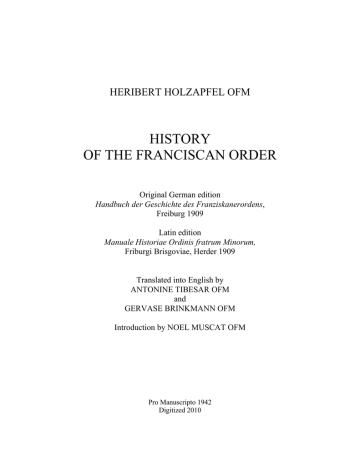 ! HERIBERT HOLZAPFEL OFM HISTORY OF THE FRANCISCAN ORDER Original German edition Handbuch der Geschichte des Franziskanerordens, Freiburg 1909 Latin edition Manuale Historiae Ordinis fratrum Minorum, Friburgi Brisgoviae, Herder 1909 Translated into English by ANTONINE TIBESAR OFM and GERVASE BRINKMANN OFM Introduction by NOEL MUSCAT OFM Pro Manuscripto 1942 Digitized 2010 ! Heribert Holzapfel: History of the Franciscan Order ______________________________________________________________________________________ © Fr. Noel Muscat ofm http://www.i-tau.org/franstudies/ Franciscan Texts 2009 Reproduced by kind permission of Fr. Maximilian Wagner ofm Minister Provincial Franciscan Province of St. Anthony of Padua, Bavaria, Germany This electronic edition can be freely downloaded and is not for sale 2 Heribert Holzapfel: History of the Franciscan Order ______________________________________________________________________________________ INTRODUCTION One hundred years ago, in 1909, the Franciscan historian brother Heribert Holzapfel published the Handbuch der Geschichte des Franziskanerordens. He composed this manual of Franciscan history when Dionysius Schüler was Minister General of the Order of Friars Minor (1903-1911), on the occasion of the 700th anniversary of the foundation of the Order (1209-1909). Heribert Holzapfel was born in Neckarsulm in northern Baden-Württemberg near Stuttgart, Germany, on 22nd November 1868, feast day of Saint Cecilia. His baptismal name was Joseph. His father, a shoemaker died very early. His pious mother raised her five children solidly and religiously. As a young student Heribert attended the Gymnasium in Landshut. He finished it as a Franciscan student after 7 years. In the meantime he had been accepted in the Order of Friars Minor in the Franciscan Province of Bavaria, and entered the Novitiate house at Dietfurt, 38 kilometres west of Regensburg, on 1st October 1884. After the Gymnasium he was called for military service in the second infantry regiment in Munich as a volunteer for one year. Heribert then continued to study philosophy and theology in Tölz and Munich. He was ordained in 1891 in the cathedral of Freising by Archbishop Antonius von Thoma. After a short time of pastoral work in the friries of Mühldorf and Dingolfing he became a rector of the seminary in Landshut for three years. He was then guardian and director of the friary of Pfreim. In 1897 he began teaching theology for the Franciscan students in Tölz and then in Munich, where he continued to live after 1900. On 8th November 1902, feast day of Blessed John Duns Scotus, brother Heribert acquired his doctorate in theology. In the Bavarian Province brother Heribert occupied the post of master of clerics. For 12 years he belonged to the definitory, or council, of the Province. He was also responsible for canonical visitations of various provinces in the Order, including the provinces of Tyrol, Austria, Thuringia and Silesia. On 1st October 1934 Heribert celebrated his golden jubilee in the Franciscan Order. For more than half of his life brother Heribert lived in the Franziskanerkloster of St. Anna in Munich. All the friars who were ordained after 1897 had been formed by him. He was very active as a priest, confessor, retreat director, and he entered into dialogue with atheists and communists. Brother Heribert specialized in mediaeval studies. He published works on St. Dominic and the Rosary, the Manual on the History of the Franciscan Order, a study on the Portiuncula Indulgence, a historical study about the disputation regarding Rites in China, to name just a few of his many publications. From 1912 to 1918 brother Heribert was Minister Provincial of the Bavarian Province. It was a difficult period, because of the Great European War. Heribert took care to open the friaries for the care of wounded soldiers. Heribert Holzapfel died on 26th May 1936 in the clinic of Kopernicus house in Frauenburg, from an embolus after a car accident on the way to visit the bishop of Ermland. At that time Heribert was travelling from Munich to Berlin in order to start the canonical visitation of the Province of Silesia. He was buried on 30th May, vigil of Pentecost, after a funeral led by Cardinal Faulhaber. 3 Heribert Holzapfel: History of the Franciscan Order ______________________________________________________________________________________ The Necrologium of the Bavarian Province states that the best way to describe brother Heribert is that of the words of St. Bonaventure: cum scientia pietas pulcherrima societas (with the science of piety there is a most beautiful company). Brother Heribert was a pious man, and he was also a man of science. The aim of what he wanted in life was that of striving to attain what the Church states in the antiphon of the divine office of the feast of St. Francis: non soli vivere, sed aliis proficere vult Dei zelo ductus (he did not live for himself, but wanted to strive for the good of others, led by zeal for God). The moment of the publication of Holzapfel’s Handbuch der Geschichte des Franziskanerordens, translated into Latin with the title Manuale Historiae Ordinis Fratrum Minorum, was one of the most fruitful in the study of Franciscan history. In 1877 the Minister General Bernardino dal Vago da Portogruaro had founded the College of San Bonaventura at Quaracchi, Florence, whose principal aim was the preparation of the critical edition of the works of Saint Bonaventure. The task was undertaken by a group of Franciscan scholars led by Fedele da Fanna (†1881), and then by Ignatius Jeiler (†1904). The eleven-volume edition of the Opera omnia was published in 1882-1902 at Quaracchi. The same scholars also took charge of the publication of the writings of Saint Francis and those of the great medieval Franciscan masters like Alexander of Hales, John Duns Scotus and Bernardine of Siena. Since 1908, just one year before Holzapfel’s volume was published, they have bee