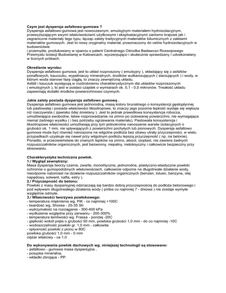 Czym jest dyspersja asfaltowo-gumowa ? Dyspersja asfaltowo-gumowa jest nowoczesnym, emulsyjnym materiałem hydroizolacyjnym, przewyższającym swymi właściwościami użytkowymi i eksploatacyjnymi zarówno krajowe jak i zagraniczne materiały tego typu, łącząc zalety tradycyjnych materiałów bitumicznych z zaletami materiałów gumowych. Jest to nowy oryginalny materiał, przeznaczony do celów hydroizolacyjnych w budownictwie i przemyśle, produkowany w oparciu o patent Centralnego Ośrodka Badawczo Rozwojowego Przemysłu Izolacji Budowlanej w Katowicach, wyczerpująco i skutecznie sprawdzany i udoskonalany w licznych próbach. Określenie wyrobu: Dyspersja asfaltowo gumowa, jest to układ rozproszony ( emulsyjny ), składający się z asfaltów ponaftowych, kauczuku, wypełniaczy mineralnych, środków wulkanizujących ( sieciujących ) i wody, w którym woda stanowi fazę ciągłą, to znaczy zewnętrzną układu. Asfalt i kauczuk występują w rozdrobnieniu charakterystycznym dla układów rozproszonych ( emulsyjnych ), to jest w postaci cząstek o wymiarach ok. 0,1 - 0,5 mikronów. Trwałość układu zapewniają dodatki środków powierzchniowo czynnych. Jakie zalety posiada dyspersja asfaltowo gumową . Dyspersja asfaltowo gumowa jest jednorodną, masą koloru brunatnego o konsystencji gęstopłynnej lub pastowatej i posiada właściwości tiksotropowe, to znaczy jego pozorna lepkość wydaje się większa niż rzeczywista ( zjawisko bitej śmietany ). Jest to jednak prawidłowa konsystencja robocza, umożliwiająca swobodne, łatwe rozprowadzanie na zimno po izolowanej powierzchni, nie wymagająca niemal żadnego wysiłku ( i bez potrzeby ogrzewania materiału). Pastowata konsystencja i tiksotropowe właściwości umożliwiają przy tym jednokrotne nanoszenie warstw izolacyjnych o grubości ok. 1 mm, nie spływających z powierzchni pochyłych lub pionowych. Dyspersja asfaltowo gumowa może być również nanoszona na wilgotne podłoża bez obawy utraty przyczepności, w wielu przypadkach uzyskuje się nawet przy wilgotnym podłożu lepszą przyczepność ( np. na betonie). Ponadto, w przeciwieństwie do znanych lepików na zimno, abizol, izoplast, nie zawiera żadnych rozpuszczalników organicznych, jest bezwonny, niepalny, nietoksyczny i całkowicie bezpieczny przy stosowaniu. Charakterystyka techniczna powłok. 1./ Wygląd zewnętrzny: Masa dyspersja tworzy czarne, zwarte, monolityczne, jednorodne, plastyczno-elastyczne powłoki ochronne o gumopodobnych właściwościach, całkowicie odporne na długotrwałe działanie wody, nieodporne natomiast na działanie rozpuszczalników organicznych (benzen, toluen, benzyna, olej napędowy, solwent, nafta, estry ). 2./ Przyczepność do betonu: Powłoki z masy dyspersyjnej odznaczają się bardzo dobrą przyczepnością do podłoża betonowego i pod wpływem długotrwałego działania wody ( próba co najmniej 7 - dniowa ) nie zostaje wymyte względnie odmyte. 3./ Właściwości tworzywa powłokowego: - temperatura mięknienia wg. PiK - co najmniej +100C - twardość wg. Shorea - 25-35 Sh - wytrzymałość na rozciąganie - 300-400 kPa - wydłużenie względne przy zerwaniu - 200-300% - temperatura łamliwości wg. Frassa - poniżej -20C - giętkość wokół pręta o grubości 50 mm, powłoka grubości 1,0 mm - do co najmniej -10C - wodoszczelność powłoki gr. 1,0 mm - całkowita - spływność powłoki z pionu w 80C powłoka grubości 1,0 mm - 0 mm ciężar właściwy - ca 1,0 Do wykonywania powłok dachowych wg. niniejszej technologii są stosowane: - asfaltowo - gumowa masa dyspersyjna , - posypka mineralna, - wkładki zbrojące - PP. Posypki mineralne są stosowane do zabezpieczania powierzchni powłoki przed bezpośrednim działaniem promieni słonecznych. Najkorzystniej stosować minerały o blaszkowatej strukturze ziaren to jest np. łupek chlorytowo serycytowy, łupki frylitowe stosowane również jako posypki papowe. Jako posypka może być również stosowany drobnoziarnisty piasek o uziarnieniu do 1,0 mm Wkładki zbrojące są stosowane do wzmacniania szczególnie newralgicznych miejsc pokrycia dachowego jak np. wokół wpustów, do nakrywania blacharki i opierzeń, w korytach spływowych itp. Jako wkładki mogą być stosowane odpowiednio przykrojone pasy włókien tkanin syntetycznych ( przeszywanych lub klejonych )oraz welon szklany o gramaturze M-64 i M-100 . Dobierać należy wkładki o możliwie luźnej strukturze, by maksymalnie ułatwić wnikanie masy dyspersyjnej i uzyskać całkowite przesycenie materiału zbrojącego. Dyspersja asfaltowo gumowa, w odróżnieniu od metod tradycyjnych, daje jednolitą powierzchnię pozbawioną jakichkolwiek łączeń. Bardzo duża elastyczność tej powłoki eliminuje wszelkie skutki naprężeń i wibracji na dużych dachach przemysłowych.