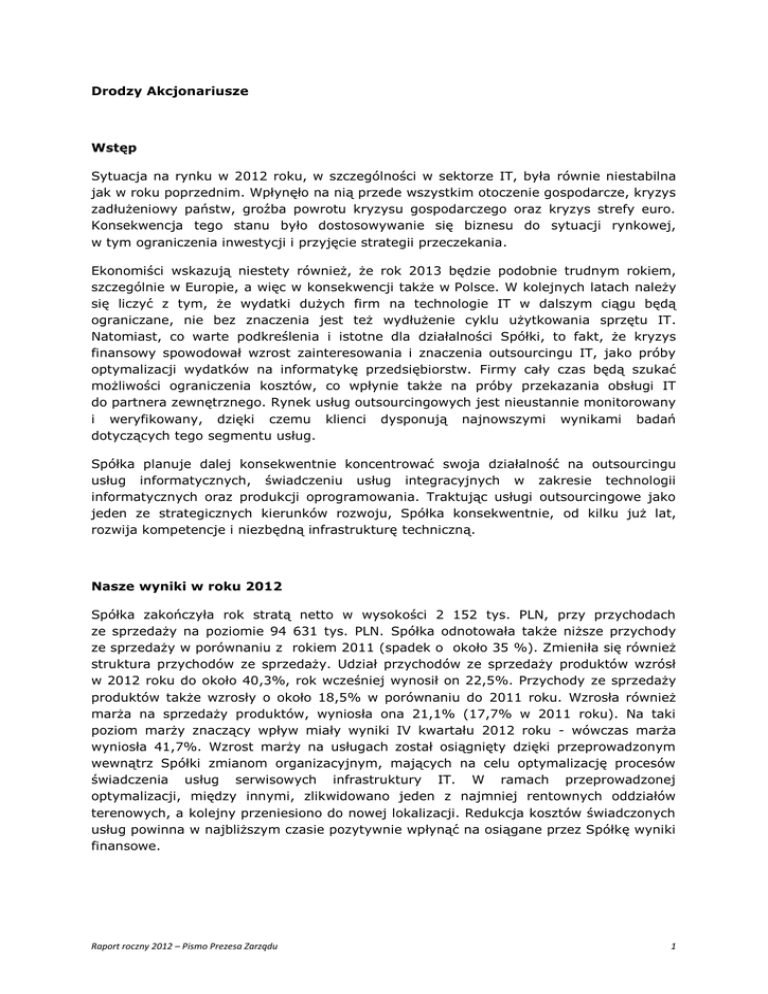 Drodzy Akcjonariusze Wstęp Sytuacja na rynku w 2012 roku, w szczególności w sektorze IT, była równie niestabilna jak w roku poprzednim. Wpłynęło na nią przede wszystkim otoczenie gospodarcze, kryzys zadłużeniowy państw, groźba powrotu kryzysu gospodarczego oraz kryzys strefy euro. Konsekwencja tego stanu było dostosowywanie się biznesu do sytuacji rynkowej, w tym ograniczenia inwestycji i przyjęcie strategii przeczekania. Ekonomiści wskazują niestety również, że rok 2013 będzie podobnie trudnym rokiem, szczególnie w Europie, a więc w konsekwencji także w Polsce. W kolejnych latach należy się liczyć z tym, że wydatki dużych firm na technologie IT w dalszym ciągu będą ograniczane, nie bez znaczenia jest też wydłużenie cyklu użytkowania sprzętu IT. Natomiast, co warte podkreślenia i istotne dla działalności Spółki, to fakt, że kryzys finansowy spowodował wzrost zainteresowania i znaczenia outsourcingu IT, jako próby optymalizacji wydatków na informatykę przedsiębiorstw. Firmy cały czas będą szukać możliwości ograniczenia kosztów, co wpłynie także na próby przekazania obsługi IT do partnera zewnętrznego. Rynek usług outsourcingowych jest nieustannie monitorowany i weryfikowany, dzięki czemu klienci dysponują najnowszymi wynikami badań dotyczących tego segmentu usług. Spółka planuje dalej konsekwentnie koncentrować swoja działalność na outsourcingu usług informatycznych, świadczeniu usług integracyjnych w zakresie technologii informatycznych oraz produkcji oprogramowania. Traktując usługi outsourcingowe jako jeden ze strategicznych kierunków rozwoju, Spółka konsekwentnie, od kilku już lat, rozwija kompetencje i niezbędną infrastrukturę techniczną. Nasze wyniki w roku 2012 Spółka zakończyła rok stratą netto w wysokości 2 152 tys. PLN, przy przychodach ze sprzedaży na poziomie 94 631 tys. PLN. Spółka odnotowała także niższe przychody ze sprzedaży w porównaniu z rokiem 2011 (spadek o około 35 %). Zmieniła się również struktura przychodów ze sprzedaży. Udział przychodów ze sprzedaży produktów wzrósł w 2012 roku do około 40,3%, rok wcześniej wynosił on 22,5%. Przychody ze sprzedaży produktów także wzrosły o około 18,5% w porównaniu do 2011 roku. Wzrosła również marża na sprzedaży produktów, wyniosła ona 21,1% (17,7% w 2011 roku). Na taki poziom marży znaczący wpływ miały wyniki IV kwartału 2012 roku - wówczas marża wyniosła 41,7%. Wzrost marży na usługach został osiągnięty dzięki przeprowadzonym wewnątrz Spółki zmianom organizacyjnym, mających na celu optymalizację procesów świadczenia usług serwisowych infrastruktury IT. W ramach przeprowadzonej optymalizacji, między innymi, zlikwidowano jeden z najmniej rentownych oddziałów terenowych, a kolejny przeniesiono do nowej lokalizacji. Redukcja kosztów świadczonych usług powinna w najbliższym czasie pozytywnie wpłynąć na osiągane przez Spółkę wyniki finansowe. Raport roczny 2012 – Pismo Prezesa Zarządu 1 Nasi klienci i dostawcy Podobnie jak w latach ubiegłych, nasza oferta skierowana jest głównie do dużych i średnich przedsiębiorstw, głownie rynku finansowego (59,3 % przychodów) oraz administracji publicznej (6,6 % przychodów). Ze względu na podpisane w minionym roku kontrakty, kolejne, znaczące źródło obrotów Spółki stanowi sektor handlu i usług (23,9 %). Strategia działalności Spółki zakłada, że znaczna część jej działalności opiera się na stałej, wieloletniej i kompleksowej obsłudze w zakresie informatyki dużych podmiotów gospodarczych. Staramy się zwiększać liczbę klientów kluczowych oraz generować część przychodów ze współpracy z wieloma mniejszymi kontrahentami, unikając w ten sposób ryzyka związanego z uzależnieniem od dużych klientów. Spółka w minionym roku podpisała szereg kolejnych znaczących umów dla przedsiębiorstwa. Spółce udało się pozyskać kolejnych klientów z sektora bankowofinansowego oraz podpisać kolejne wieloletnie umowy z dotychczasowymi partnerami biznesowymi Spółki, w tym umów na dalszą konsolidację usług informatycznych i utrzymywanie środowisk IT klienta. Naszymi głównymi dostawcami od wielu lat są polskie i światowe koncerny informatyczne takie jak Microsoft, Hewlett Packard, IBM, Dell Computer, Lenovo, Fujitsu i inne. Nie jesteśmy w znaczący sposób uzależnieni od dostawców, a towary nabywać możemy na zbliżonych warunkach handlowych od alternatywnych dystrybutorów. Nasze kompetencje Zaufanie i uznanie klientów wynika z kwalifikacji i kompetencji naszych pracowników. Dziedzina technologii informatycznych jest jedną z najszybciej rozwijających się dziedzin nauki. Nieustannie pojawiają się nowe produkty i technologie. W naszej Spółce zawsze docenialiśmy znaczenie nieustannego podnoszenia kwalifikacji i zdobywania nowych autoryzacji. Posiadamy podpisane umowy partnerskie z przodującymi na świecie producentami sprzętu i oprogramowania. Nasi inżynierowie, uczestnicząc w specjalistycznych kursach i szkoleniach oraz zdając egzaminy kwalifikacyjne, zdobywają wiedzę i umiejętności owocujące później w kontaktach z klientami. Lista certyfikatów uzyskiwanych przez naszych pracowników ciągle się rozszerza. Ciągła dbałość o rozwój infrastruktury umożliwia nam oferowanie klientom najbardziej zaawansowanych usług. Dotyczy to szczególnie usług outsourcingowych, realizowanych w naszym Centrum Przetwarzania Danych (Data Center). Mamy klientów nie tylko zainteresowanych naszymi usługami Data Center, ale już korzystających z powierzchni i infrastruktury tych obiektów. Nasze kompetencje w zakresie realizacji usług outsourcingowych, oparte o międzynarodowe standardy i wsparte certyfikatami naszych inżynierów oraz nasze zasoby i infrastruktura w tym zakresie, stanowią atrakcyjną ofertę dla kluczowych klientów sektora finansowego i przemysłowego. Raport
