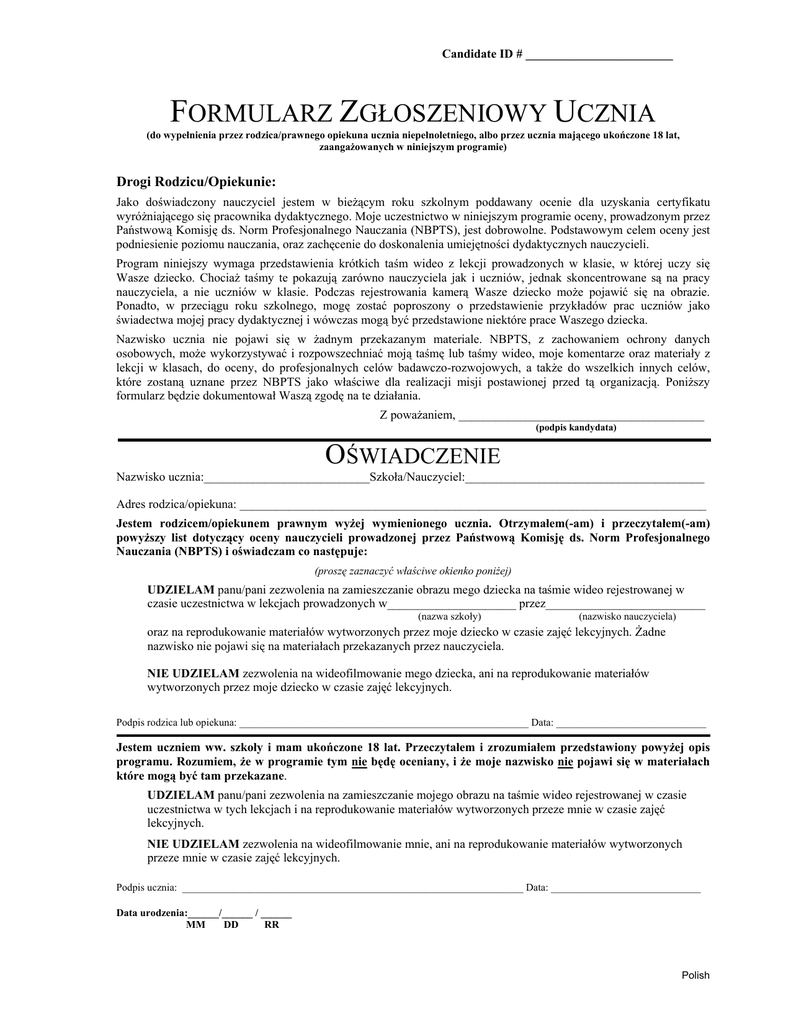 Candidate ID # ________________________ FORMULARZ ZGŁOSZENIOWY UCZNIA (do wypełnienia przez rodzica/prawnego opiekuna ucznia niepełnoletniego, albo przez ucznia mającego ukończone 18 lat, zaangażowanych w niniejszym programie) Drogi Rodzicu/Opiekunie: Jako doświadczony nauczyciel jestem w bieżącym roku szkolnym poddawany ocenie dla uzyskania certyfikatu wyróżniającego się pracownika dydaktycznego. Moje uczestnictwo w niniejszym programie oceny, prowadzonym przez Państwową Komisję ds. Norm Profesjonalnego Nauczania (NBPTS), jest dobrowolne. Podstawowym celem oceny jest podniesienie poziomu nauczania, oraz zachęcenie do doskonalenia umiejętności dydaktycznych nauczycieli. Program niniejszy wymaga przedstawienia krótkich taśm wideo z lekcji prowadzonych w klasie, w której uczy się Wasze dziecko. Chociaż taśmy te pokazują zarówno nauczyciela jak i uczniów, jednak skoncentrowane są na pracy nauczyciela, a nie uczniów w klasie. Podczas rejestrowania kamerą Wasze dziecko może pojawić się na obrazie. Ponadto, w przeciągu roku szkolnego, mogę zostać poproszony o przedstawienie przykładów prac uczniów jako świadectwa mojej pracy dydaktycznej i wówczas mogą być przedstawione niektóre prace Waszego dziecka. Nazwisko ucznia nie pojawi się w żadnym przekazanym materiale. NBPTS, z zachowaniem ochrony danych osobowych, może wykorzystywać i rozpowszechniać moją taśmę lub taśmy wideo, moje komentarze oraz materiały z lekcji w klasach, do oceny, do profesjonalnych celów badawczo-rozwojowych, a także do wszelkich innych celów, które zostaną uznane przez NBPTS jako właściwe dla realizacji misji postawionej przed tą organizacją. Poniższy formularz będzie dokumentował Waszą zgodę na te działania. Z poważaniem, ________________________________________ (podpis kandydata) OŚWIADCZENIE Nazwisko ucznia:___________________________Szkoła/Nauczyciel:_______________________________________ Adres rodzica/opiekuna: ____________________________________________________________________________ Jestem rodzicem/opiekunem prawnym wyżej wymienionego ucznia. Otrzymałem(-am) i przeczytałem(-am) powyższy list dotyczący oceny nauczycieli prowadzonej przez Państwową Komisję ds. Norm Profesjonalnego Nauczania (NBPTS) i oświadczam co następuje: (proszę zaznaczyć właściwe okienko poniżej) UDZIELAM panu/pani zezwolenia na zamieszczanie obrazu mego dziecka na taśmie wideo rejestrowanej w czasie uczestnictwa w lekcjach prowadzonych w_____________________ przez__________________________ (nazwa szkoły) (nazwisko nauczyciela) oraz na reprodukowanie materiałów wytworzonych przez moje dziecko w czasie zajęć lekcyjnych. Żadne nazwisko nie pojawi się na materiałach przekazanych przez nauczyciela. NIE UDZIELAM zezwolenia na wideofilmowanie mego dziecka, ani na reprodukowanie materiałów wytworzonych przez moje dziecko w czasie zajęć lekcyjnych. Podpis rodzica lub opiekuna: ________________________________________________________ Data: _____________________________ Jestem uczniem ww. szkoły i mam ukończone 18 lat. Przeczytałem i zrozumiałem przedstawiony powyżej opis programu. Rozumiem, że w programie tym nie będę oceniany, i że moje nazwisko nie pojawi się w materiałach które mogą być tam przekazane. UDZIELAM panu/pani zezwolenia na zamieszczanie mojego obrazu na taśmie wideo rejestrowanej w czasie uczestnictwa w tych lekcjach i na reprodukowanie materiałów wytworzonych przeze mnie w czasie zajęć lekcyjnych. NIE UDZIELAM zezwolenia na wideofilmowanie mnie, ani na reprodukowanie materiałów wytworzonych przeze mnie w czasie zajęć lekcyjnych. Podpis ucznia: __________________________________________________________________ Data: _____________________________ Data urodzenia:______/______ / ______ MM DD RR Polish