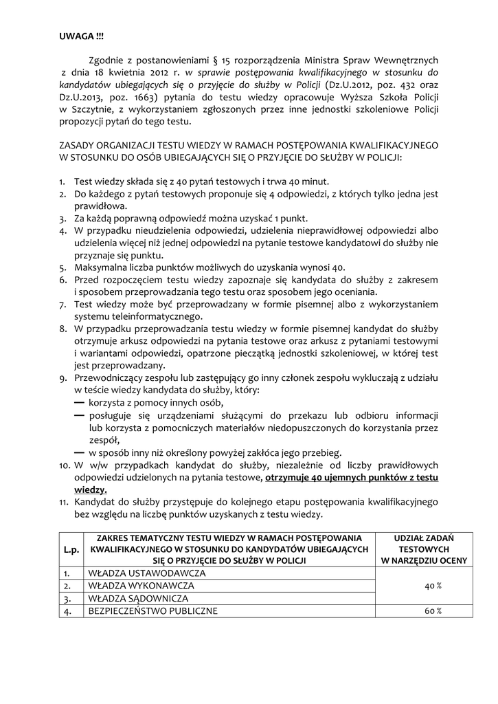 UWAGA !!! Zgodnie z postanowieniami § 15 rozporządzenia Ministra Spraw Wewnętrznych z dnia 18 kwietnia 2012 r. w sprawie postępowania kwalifikacyjnego w stosunku do kandydatów ubiegających się o przyjęcie do służby w Policji (Dz.U.2012, poz. 432 oraz Dz.U.2013, poz. 1663) pytania do testu wiedzy opracowuje Wyższa Szkoła Policji w Szczytnie, z wykorzystaniem zgłoszonych przez inne jednostki szkoleniowe Policji propozycji pytań do tego testu. ZASADY ORGANIZACJI TESTU WIEDZY W RAMACH POSTĘPOWANIA KWALIFIKACYJNEGO W STOSUNKU DO OSÓB UBIEGAJĄCYCH SIĘ O PRZYJĘCIE DO SŁUŻBY W POLICJI: 1. Test wiedzy składa się z 40 pytań testowych i trwa 40 minut. 2. Do każdego z pytań testowych proponuje się 4 odpowiedzi, z których tylko jedna jest prawidłowa. 3. Za każdą poprawną odpowiedź można uzyskać 1 punkt. 4. W przypadku nieudzielenia odpowiedzi, udzielenia nieprawidłowej odpowiedzi albo udzielenia więcej niż jednej odpowiedzi na pytanie testowe kandydatowi do służby nie przyznaje się punktu. 5. Maksymalna liczba punktów możliwych do uzyskania wynosi 40. 6. Przed rozpoczęciem testu wiedzy zapoznaje się kandydata do służby z zakresem i sposobem przeprowadzania tego testu oraz sposobem jego oceniania. 7. Test wiedzy może być przeprowadzany w formie pisemnej albo z wykorzystaniem systemu teleinformatycznego. 8. W przypadku przeprowadzania testu wiedzy w formie pisemnej kandydat do służby otrzymuje arkusz odpowiedzi na pytania testowe oraz arkusz z pytaniami testowymi i wariantami odpowiedzi, opatrzone pieczątką jednostki szkoleniowej, w której test jest przeprowadzany. 9. Przewodniczący zespołu lub zastępujący go inny członek zespołu wykluczają z udziału w teście wiedzy kandydata do służby, który: — korzysta z pomocy innych osób, — posługuje się urządzeniami służącymi do przekazu lub odbioru informacji lub korzysta z pomocniczych materiałów niedopuszczonych do korzystania przez zespół, — w sposób inny niż określony powyżej zakłóca jego przebieg. 10. W w/w przypadkach kandydat do służby, niezależnie od liczby prawidłowych odpowiedzi udzielonych na pytania testowe, otrzymuje 40 ujemnych punktów z testu wiedzy. 11. Kandydat do służby przystępuje do kolejnego etapu postępowania kwalifikacyjnego bez względu na liczbę punktów uzyskanych z testu wiedzy. L.p. ZAKRES TEMATYCZNY TESTU WIEDZY W RAMACH POSTĘPOWANIA KWALIFIKACYJNEGO W STOSUNKU DO KANDYDATÓW UBIEGAJĄCYCH SIĘ O PRZYJĘCIE DO SŁUŻBY W POLICJI 1. 2. 3. 4. WŁADZA USTAWODAWCZA WŁADZA WYKONAWCZA WŁADZA SĄDOWNICZA BEZPIECZEŃSTWO PUBLICZNE UDZIAŁ ZADAŃ TESTOWYCH W NARZĘDZIU OCENY 40 % 60 % WYKAZ ŹRÓDEŁ DO TESTU WIEDZY W RAMACH POSTĘPOWANIA KWALIFIKACYJNEGO W STOSUNKU DO OSÓB UBIEGAJĄCYCH SIĘ O PRZYJĘCIE DO SŁUŻBY W POLICJI 1. Konstytucja Rzeczypospolitej Polskiej z dnia 2 kwietnia 1997 r. (Dz.U.1997, Nr 78, poz. 483 z późn. zm.). 2. Ustawa z dnia 6 kwietnia 1990 r. o Policji (Dz.U.2011, Nr 287, poz. 1687, j.t. z późn. zm.). 3. Ustawa z dnia 20 czerwca 1997 r. Prawo o ruchu drogowym (Dz.U.2012, poz. 1137, j.t. z późn. zm.). Dział I przepisy ogólne, dział II ruch drogowy, Porządek i bezpieczeństwo ruchu na drogach, art. 38-52. 4. Ustawa z dnia 29 sierpnia 1997 r. o strażach gminnych (Dz.U.2013, poz. 1383 j.t.). 5. Ustawa z dnia 22 sierpnia 1997 r. o ochronie osób i mienia (Dz. U. 2005, nr 145, poz.1221, tj.). 6. Ustawa z dnia 20 marca 2009 r. o bezpieczeństwie imprez masowych (Dz.U.2013, poz. 611, j.t. z późn. zm.) Rozdział 1 – Przepisy ogólne, art.1-4 Rozdział 2 – Bezpieczeństwo imprez masowych, art. 5-12. Rozdział 3 – Bezpieczeństwo meczu piłki nożnej, art. 13-18. 7. Ustawa z dnia 5 lipca 1990 r. Prawo o zgromadzeniach (Dz.U.2013, poz. 397 j.t.), art. 1-13. 8. Ustawa z dnia 18 kwietnia 2002 r. o stanie klęski żywiołowej (Dz.U.2002, Nr 62, poz. 558 z późn. zm.) Rozdział 1 – Przepisy ogólne, art.1-6. Rozdział 3 – Zakres ograniczeń wolności i praw człowieka i obywatela, art.20-26. 9. Ustawa z dnia 05 stycznia 2011 r. Kodeks wyborczy (Dz.U.2011, Nr 21, poz. 112 z późn. zm.) Bierne i czynne prawo wyborcze oraz ograniczenia w tym zakresie; Wybory do sejmu – dział III rozdział 1 zasady ogólne, rozdział 9 wygaśnięcie mandatu posła i uzupełnienie składu Sejmu; Wybory do Senatu – dział Iv, rozdział 1 zasady ogólne, rozdział 9 wygaśnięcie mandatu i uzupełnienie składu Senatu; Wybory Prezydenta Rzeczypospolitej, dział V, rozdział 1 zasady ogólne; Wybory do Parlamentu Europejskiego, dział VI, rozdział 1 zasady ogólne, rozdział 7 wygaśnięcie mandatu, utrata mandatu; Wybory do organów stanowiących jednostek samorządu terytorialnego, rozdział 1 zasady ogólne, dział VII, rozdział 4 wygaśnięcie mandatu radnego, wybory uzupełniające i przedterminowe; Wybory wójta, burmistrza, prezydenta miasta, dział VIII, rozdział 1 przepisy ogólne, rozdział 1, przepisy ogólne, rozdział 6 wygaśnięcie mandatu. 10. Uchwała Sejmu RP z dnia 30 lipca 1992 r. Regulamin Sejmu Rzeczypospolitej Polskiej (M.P.2012, poz.32, j.t. z późn. zm.) Organy Sejmu (art.9 - 20). 11. Ustawa z dnia 8 sierpnia 1996 r. o Radzie Ministrów (Dz.U.2012, poz.392, j.t. z późn. zm.) Zakres i zasady działania ministrów, Rozdział 6 (art.32-39a). 12. Ustawa z dnia 23 stycznia 2009 r. o wojewodzie i administracji rządowej w województwie (Dz.U.2009, Nr 31, poz. 206 z późn. zm.). 13. Ustawa z dnia 1 sierpnia 1997 r. o Trybunale Konstytucyjnym (Dz.U.1997, Nr 102, poz. 643 z późn. zm.) Właściwość i ustrój Trybunału Konstytucyjnego, rozdział 1 (art.1-18). 14. Ustawa z dnia 26 marca 1982 r. o Trybunale Stanu (Dz.U.2002, Nr 101, poz. 925, j.t. z późn. zm.) Podmioty i zasady odpowiedzialności (art.1-6). 15. Ustawa z dnia 20 lipca 2000 r. o ogłaszaniu aktów normatywnych i niektórych innych aktów prawnych (Dz.U.2011, Nr 197, poz. 1172, j.t. z późn. zm.). Dzienniki urzędowe i ich zawartość (