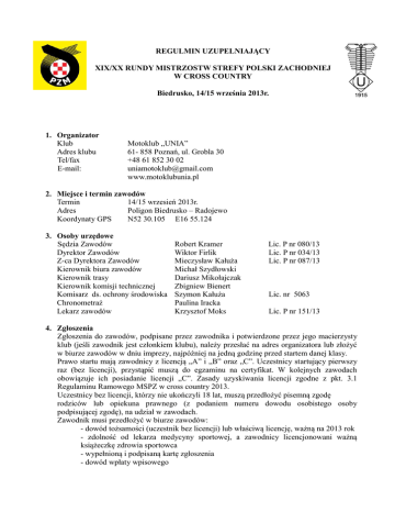 REGULMIN UZUPELNIAJĄCY XIX/XX RUNDY MISTRZOSTW STREFY POLSKI ZACHODNIEJ W CROSS COUNTRY Biedrusko, 14/15 września 2013r. 1. Organizator Klub Adres klubu Tel/fax E-mail: Motoklub „UNIA” 61- 858 Poznań, ul. Grobla 30 +48 61 852 30 02 [email protected] www.motoklubunia.pl 2. Miejsce i termin zawodów Termin 14/15 wrzesień 2013r. Adres Poligon Biedrusko – Radojewo Koordynaty GPS N52 30.105 E16 55.124 3. Osoby urzędowe Sędzia Zawodów Dyrektor Zawodów Z-ca Dyrektora Zawodów Kierownik biura zawodów Kierownik trasy Kierownik komisji technicznej Komisarz ds. ochrony środowiska Chronometraż Lekarz zawodów Robert Kramer Wiktor Firlik Mieczysław Kałuża Michał Szydłowski Dariusz Mikołajczak Zbigniew Bienert Szymon Kałuża Paulina Iracka Krzysztof Moks Lic. P nr 080/13 Lic. P nr 034/13 Lic. P nr 087/13 Lic. nr 5063 Lic. P nr 151/13 4. Zgłoszenia Zgłoszenia do zawodów, podpisane przez zawodnika i potwierdzone przez jego macierzysty klub (jeśli zawodnik jest członkiem klubu), należy przesłać na adres organizatora lub złożyć w biurze zawodów w dniu imprezy, najpóźniej na jedną godzinę przed startem danej klasy. Prawo startu mają zawodnicy z licencją „A” i „B” oraz „C”. Uczestnicy startujący pierwszy raz (bez licencji), przystąpić muszą do egzaminu na certyfikat. W kolejnych zawodach obowiązuje ich posiadanie licencji „C”. Zasady uzyskiwania licencji zgodne z pkt. 3.1 Regulaminu Ramowego MSPZ w cross country 2013. Uczestnicy bez licencji, którzy nie ukończyli 18 lat, muszą przedłożyć pisemną zgodę rodziców lub opiekuna prawnego (z podaniem numeru dowodu osobistego osoby podpisującej zgodę), na udział w zawodach. Zawodnik musi przedłożyć w biurze zawodów: - dowód tożsamości (uczestnik bez licencji) lub właściwą licencję, ważną na 2013 rok - zdolność od lekarza medycyny sportowej, a zawodnicy licencjonowani ważną książeczkę zdrowia sportowca - wypełnioną i podpisaną kartę zgłoszenia - dowód wpłaty wpisowego 5. Biuro zawodów Biuro zawodów znajduje się na terenie zawodów i czynne jest zgodnie z harmonogramem czasowym zawodów. 6. Wpisowe Wpisowe do zawodów wynosi : - dla klas : Senior 1, Senior 2, Open, Quad 2K, Quad 4K, Quad Open, Masters 170 zł za zgłoszenie do dwóch rund lub 100 zł za zgłoszenie do jednej rundy zawodów - dla klas : Quad 2K Młodzik, Junior, Młodzik - 150 zł za zgłoszenie do dwóch rund lub 80 zł za zgłoszenie do jednej rundy zawodów. Uczestnicy bez licencji wnoszą dodatkową opłatę 50 zł za egzamin oraz opłatę za ubezpieczenie w wysokości 25 zł za każdy dzień zawodów (zgodnie z BS/M/Ż/S/K z dnia 20.12.2012). W przypadku wycofania się z zawodów, zawodnikowi nie przysługuje zwrot wpisowego. 7. Czas trwania wyścigów Czas trwania wyścigów dla klas Quad Młodzik 2K i Młodzik wynosi 40 minut. Dla pozostałych klas – 1,5 godziny. Kolejność startów wg harmonogramu czasowego zawodów. 8. Odbiór techniczny Odbędzie się zgodnie z harmonogramem czasowym zawodów. Do zawodów będą dopuszczone motocykle i quady spełniające wymogi RSM Zasady Rozgrywek Cross Country 2013r. oraz Regulaminu Ramowego MSPZ w cross country pkt. 3.7 i 3.8. 9. Odprawa zawodników Odbędzie się w parku maszyn, w czasie podanym w harmonogramie czasowym zawodów. Udział w odprawie jest obowiązkowy dla zawodników. 10. Udział zawodników zagranicznych Mistrzostwa Strefy Polski Zachodniej w cross country są zawodami otwartymi dla zawodników zagranicznych, spełniających wymogi niniejszego regulaminu. 11. Trasa O długości ok. 8,5 km, szerokość od 6 m do15 m, o różnorodnej nawierzchni (głównie piaszczystej). Odbioru trasy dokona sędzia zawodów przed zawodami. 12. Numery startowe Zawodnicy mają obowiązek przystąpić do odbioru technicznego z naklejonymi numerami startowym na właściwym tle, zgodnie z pkt. 3.6 Regulaminu Ramowego MSPZ w cross country 2013. 13. Protesty Sposób składania i rozpatrywania protestów musi być zgodny z pkt.7 Regulaminu Ramowego MSPZ w cross country 2013. 14. Zasady rozgrywania zawodów Wyścigi odbywają się wg załączonego harmonogramu czasowego zawodów. Zawodnicy zaczynają wyścig ze wspólnego startu systemem Le Mans w danej kategorii. Koniec wyścigu jest sygnalizowany przez sędziego mety po upływie czasu podanego w niniejszym regulaminie, dla danej kategorii. Czas zakończenia pomiaru czasu podany będzie na odprawie zawodników. Procedura startu – wg pkt. 4 RSM Zasad Rozgrywek Cross Country 2013. Zawodnicy są klasyfikowani na podstawie zapisu ilości pokonanych okrążeń trasy, stosownie do kolejności przekraczania linii mety. Klasyfikuje się tych zawodników, którzy zaliczą minimum 1 okrążenie trasy. Warunkiem zaliczenia wyników rundy do klasyfikacji Mistrzostw Strefy jest start w danej klasie minimum 1 zawodnika. Start oznacza wystartowanie do okrążenia zapoznawczego i przejechanie linii pomiaru czasu/okrążeń. Dodatkowym warunkiem zaliczenia punktów do klasyfikacji Mistrzostw Strefy przy ilości zawodników mniejszej niż 4 - jest ukończenie rundy - czyli przejechanie linii pomiaru czasu po upłynięciu planowanego czasu wyścigu dla danej klasy. Punktacja w zawodach wg pkt. 5.1 Regulaminu Ramowego MSPZ w cross country 2013. 15. Klasy Zawody będą rozgrywane w klasach: - quady : 2K Młodzik, 2K, 4K, Open - motocykle: Młodzik, Junior, Senior 1, Senior 2, Open, Masters Kryteria dla poszczególnych klas – wg pkt. 4.1 Regulaminu Ramowego MSPZ w cross country 2013. 16. Nagrody Organizator wręczy zawodnikom puchary za zajęcie pierwszych trzech miejsc w każdej z klas, oddzielnie za każdy dzień zawodów. 17. Park Maszyn Zlokalizowany na obszarze zawodów. W parku maszyn obowiązują maty środowiskowe pod motocykle w miejscu serwisowania. Za brak maty ekologicznej zawodnik ukarany zostanie karą pieniężną w wysokości 300 zł. W przypadku nie zapłacenia kary , zawodnik taki zostaje wykluczony z zawod