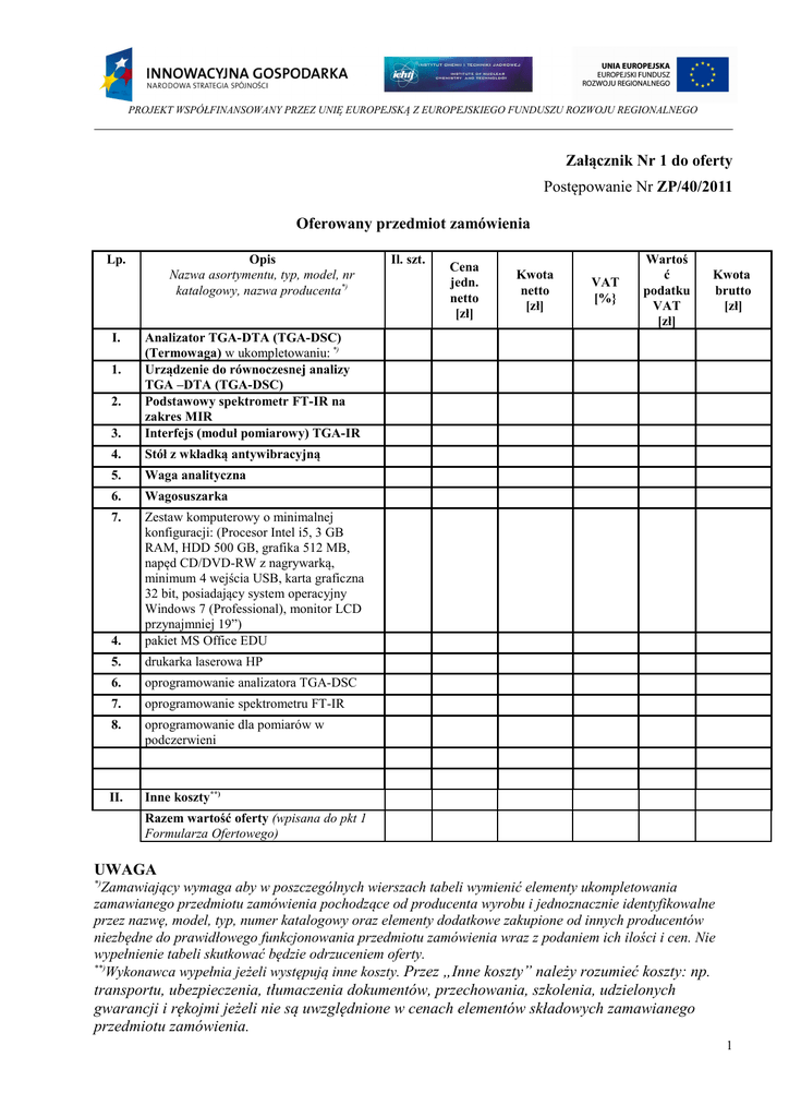 PROJEKT WSPÓŁFINANSOWANY PRZEZ UNIĘ EUROPEJSKĄ Z EUROPEJSKIEGO FUNDUSZU ROZWOJU REGIONALNEGO Załącznik Nr 1 do oferty Postępowanie Nr ZP/40/2011 Oferowany przedmiot zamówienia Lp. I. Opis Nazwa asortymentu, typ, model, nr katalogowy, nazwa producenta*) 3. Analizator TGA-DTA (TGA-DSC) (Termowaga) w ukompletowaniu: *) Urządzenie do równoczesnej analizy TGA –DTA (TGA-DSC) Podstawowy spektrometr FT-IR na zakres MIR Interfejs (moduł pomiarowy) TGA-IR 4. Stół z wkładką antywibracyjną 5. Waga analityczna 6. Wagosuszarka 7. 4. Zestaw komputerowy o minimalnej konfiguracji: (Procesor Intel i5, 3 GB RAM, HDD 500 GB, grafika 512 MB, napęd CD/DVD-RW z nagrywarką, minimum 4 wejścia USB, karta graficzna 32 bit, posiadający system operacyjny Windows 7 (Professional), monitor LCD przynajmniej 19”) pakiet MS Office EDU 5. drukarka laserowa HP 6. oprogramowanie analizatora TGA-DSC 7. oprogramowanie spektrometru FT-IR 8. oprogramowanie dla pomiarów w podczerwieni II. Inne koszty**) 1. 2. Il. szt. Cena jedn. netto [zł] Kwota netto [zł] VAT [%} Wartoś ć podatku VAT [zł] Kwota brutto [zł] Razem wartość oferty (wpisana do pkt 1 Formularza Ofertowego) UWAGA *) Zamawiający wymaga aby w poszczególnych wierszach tabeli wymienić elementy ukompletowania zamawianego przedmiotu zamówienia pochodzące od producenta wyrobu i jednoznacznie identyfikowalne przez nazwę, model, typ, numer katalogowy oraz elementy dodatkowe zakupione od innych producentów niezbędne do prawidłowego funkcjonowania przedmiotu zamówienia wraz z podaniem ich ilości i cen. Nie wypełnienie tabeli skutkować będzie odrzuceniem oferty. **) Wykonawca wypełnia jeżeli występują inne koszty. Przez „Inne koszty” należy rozumieć koszty: np. transportu, ubezpieczenia, tłumaczenia dokumentów, przechowania, szkolenia, udzielonych gwarancji i rękojmi jeżeli nie są uwzględnione w cenach elementów składowych zamawianego przedmiotu zamówienia. 1 PROJEKT WSPÓŁFINANSOWANY PRZEZ UNIĘ EUROPEJSKĄ Z EUROPEJSKIEGO FUNDUSZU ROZWOJU REGIONALNEGO Opis oferowanego przedmiotu zamówienia Opis przedmiotu zamówienia Wymagania Zamawiającego Wypełnia Wykonawca Analizator TGA-DTA (TGA-DSC) (Termowaga) Opis Wykonawcy jest aparaturą przeznaczoną do badania zmian właściwości próbki substancji badanej w stosunku do założonych warunków temperatury. Aparat ten musi umożliwiać pomiary zmiany masy próbki, zmiany temperatury próbki oraz przepływu ciepła, z możliwością detekcji gazów, uzyskiwanych w trakcie pomiarów termograwimetrycznych, za pomocą spektroskopii w podczerwieni. Typ: Model: Nazwa producenta: Oferowane urządzenie następujące normy: (system) spełnia (należy wymienić wszystkie wskazując źródła w ofercie) Analizator TGA-DTA (TGA-DSC) (Termowaga) musi być ukompletowany i spełniać następujące parametry techniczne: Lp. Treść Parametry wymagane oferowane Zamawiający wymaga aby Wykonawca w swoim opisie dotyczącym poszczególnych punktów Wymagań Zamawiającego podał rzeczywiste dane oferowanego przedmiotu zamówienia wskazując źródła w dokumentacji dołączonej do oferty bez kopiowania informacji z rubryki obok 1 Urządzenie do równoczesnej analizy TGA – DTA (TGADSC) − Zapewniające prowadzenie badań w zakresie temperatury: od temp. otoczenia do 1500°C z programowalną zmianą temperatury w zakresie 0,01°C - 100°C, − wyposażone w podwójną wagę (dla próbki i odnośnika) w układzie poziomym, o czułości wagi nie gorszej niż 0,1 µg, − zapewniające rozdzielczość pomiaru zmiany masy 0,012 µg, poziom szumów DSC < 4 µW (amplituda 2 PROJEKT WSPÓŁFINANSOWANY PRZEZ UNIĘ EUROPEJSKĄ Z EUROPEJSKIEGO FUNDUSZU ROZWOJU REGIONALNEGO − − − − − − − − − − − międzyszczytowa), zakres dynamiczny zmiany masy: 200 mg, precyzję wyznaczania temperatury ±0,5°C, precyzję kalorymetryczna ± 2%, zapewniające tryby pracy: • TGA: tylko analiza termograwimetryczna, • TGA - DTA: jednoczesna analiza termograwimetryczna i różnicowa analiza termiczna • TGA –DSC: jednoczesna analiza termograwimetryczna i różnicowa analiza kalorymetryczna, • zmianę trybu pracy nie wymagającą zmiany sensora, posiadające trwały piec ceramiczny z automatycznie zamykaną komorą o małej objętości komory, rzędu 0,75 l, zapewniające kalibrację temperatury; wielopunktową (do 5 pkt.), przy użyciu metali wzorcowych, zapewniające chłodzenie pieca sprężonym powietrzem: czas chłodzenia z temp. 1500°C do 50°C < 30 min., musi zapewniać możliwość prowadzenia eksperymentów z wykorzystaniem próżni do 7 Pa, musi posiadać wbudowany ekran dotykowy LCD do ewentualnego sterowania przyrządem, musi posiadać wbudowaną funkcję Auto Stepwise TGA, musi posiadać wbudowany masowy kontroler przepływu gazów przedmuchujących, z automatycznym, programowalnym przełączaniem gazów przedmuchujących, musi posiadać poziomy przedmuch komory pieca z programowanym przepływem gazu przedmuchującego w zakresie 10 - 1000 ml/min, musi posiadać oddzielny port podłączeniowy dla gazów reakcyjnych, musi posiadać zestaw akcesoriów obejmujący: • tygle pomiarowe platynowe 110 3 PROJEKT WSPÓŁFINANSOWANY PRZEZ UNIĘ EUROPEJSKĄ Z EUROPEJSKIEGO FUNDUSZU ROZWOJU REGIONALNEGO • • • • • • • 2 Podstawowy spektrometr FTIR na zakres MIR µl, 12 szt., tygle ceramiczne 90 µl, 15 szt., tygle ceramiczne 40 µl, 15 szt., tygle platynowe 40 µl, 9 szt., wzorce do kalibracji temperatury i kalibracji DSC, wzorce do kalibracji masy, pęsetę (2 szt.) i szpatułkę (2 szt.), dodatkową parę termopar. − Umożliwiający rejestrację widm w podczerwieni dla gazów uzyskiwanych w procesie termicznego rozpadu próbki, − wyposażony w odpowiedni beamsplitter i detektor umożliwiający pomiar w zakresie spektralnym co najmniej 7800-350 cm-1, − posiadający trwałe ceramiczne źródło promieniowania IR z możliwością pracy w trybach: normalnym i ekonomicz
