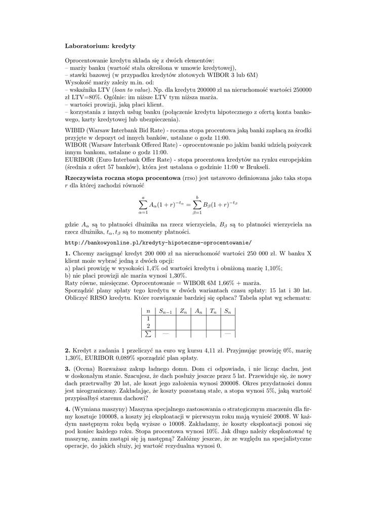 Laboratorium: kredyty Oprocentowanie kredytu składa się z dwóch elementów: – marży banku (wartość stała określona w umowie kredytowej), – stawki bazowej (w przypadku kredytów złotowych WIBOR 3 lub 6M) Wysokość marży zależy m.in. od: – wskaźnika LTV (loan to value). Np. dla kredytu 200000 zł na nieruchomość wartości 250000 zł LTV=80%. Ogólnie: im niższe LTV tym niższa marża. – wartości prowizji, jaką płaci klient. – korzystania z innych usług banku (połączenie kredytu hipotecznego z ofertą konta bankowego, karty kredytowej lub ubezpieczenia). WIBID (Warsaw Interbank Bid Rate) - roczna stopa procentowa jaką banki zapłacą za środki przyjęte w depozyt od innych banków, ustalane o godz 11:00. WIBOR (Warsaw Interbank Offered Rate) - oprocentowanie po jakim banki udzielą pożyczek innym bankom, ustalane o godz 11:00. EURIBOR (Euro Interbank Offer Rate) - stopa procentowa kredytów na rynku europejskim (średnia z ofert 57 banków), która jest ustalana o godzinie 11:00 w Brukseli. Rzeczywista roczna stopa procentowa (rrso) jest ustawowo definiowana jako taka stopa r dla której zachodzi równość a X Aα (1 + r)−tα = α=1 b X Bβ (1 + r)−tβ β=1 gdzie Aα są to płatności dłużnika na rzecz wierzyciela, Bβ są to płatności wierzyciela na rzecz dłużnika, tα , tβ są to momenty płatności. http://bankowyonline.pl/kredyty-hipoteczne-oprocentowanie/ 1. Chcemy zaciągnąć kredyt 200 000 zł na nieruchomość wartości 250 000 zł. W banku X klient może wybrać jedną z dwóch opcji: a) płaci prowizję w wysokości 1,4% od wartości kredytu i obniżoną marżę 1,10%; b) nie płaci prowizji ale marża wynosi 1,30%. Raty równe, miesięczne. Oprocentowanie = WIBOR 6M 1,66% + marża. Sporządzić plany spłaty tego kredytu w dwóch wariantach czasu spłaty: 15 lat i 30 lat. Obliczyć RRSO kredytu. Które rozwiązanie bardziej się opłaca? Tabela spłat wg schematu: n 1 2 P Sn−1 — Zn An Tn Sn — 2. Kredyt z zadania 1 przeliczyć na euro wg kursu 4,11 zł. Przyjmując prowizję 0%, marżę 1,30%, EURIBOR 0,089% sporządzić plan spłaty. 3. (Ocena) Rozważasz zakup ładnego domu. Dom ci odpowiada, i nie licząc dachu, jest w doskonałym stanie. Szacujesz, że dach posłuży jeszcze przez 5 lat. Przewiduje się, że nowy dach przetrwałby 20 lat, ale koszt jego założenia wynosi 20000$. Okres przydatności domu jest nieograniczony. Zakładając, że koszty pozostaną stałe, a stopa wynosi 5%, jaką wartość przypisałbyś staremu dachowi? 4. (Wymiana maszyny) Maszyna specjalnego zastosowania o strategicznym znaczeniu dla firmy kosztuje 10000$, a koszty jej eksploatacji w pierwszym roku mają wynieść 2000$. W każdym następnym roku będą wyższe o 1000$. Zakładamy, że koszty eksploatacji ponosi się pod koniec każdego roku. Stopa procentowa wynosi 10%. Jak długo należy eksploatować tę maszynę, zanim zastąpi się ją następną? Załóżmy jeszcze, że ze względu na specjalistyczne operacje, do jakich służy, jej wartość rezydualna wynosi 0.