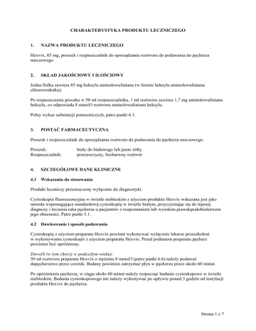 CHARAKTERYSTYKA PRODUKTU LECZNICZEGO 1. NAZWA PRODUKTU LECZNICZEGO Hexvix, 85 mg, proszek i rozpuszczalnik do sporządzania roztworu do podawania do pęcherza moczowego 2. SKŁAD JAKOŚCIOWY I ILOŚCIOWY Jedna fiolka zawiera 85 mg heksylu aminolewulinianu (w formie heksylu aminolewulinianu chlorowodorku). Po rozpuszczeniu proszku w 50 ml rozpuszczalnika, 1 ml roztworu zawiera 1,7 mg aminolewulinianu heksylu, co odpowiada 8 mmol/l roztworu aminolewulinianu heksylu. Pełny wykaz substancji pomocniczych, patrz punkt 6.1. 3. POSTAĆ FARMACEUTYCZNA Proszek i rozpuszczalnik do sporządzania roztworu do podawania do pęcherza moczowego. Proszek: Rozpuszczalnik: 4. biały do białawego lub jasno żółty przezroczysty, bezbarwny roztwór SZCZEGÓŁOWE DANE KLINICZNE 4.1 Wskazania do stosowania Produkt leczniczy przeznaczony wyłącznie do diagnostyki. Cystoskopia fluorescencyjna w świetle niebieskim z użyciem produktu Hexvix wskazana jest jako metoda wspomagająca standardową cystoskopię w świetle białym, przyczyniając się do lepszej diagnozy i leczenia raka pęcherza u pacjentów z rozpoznaniem lub wysokim prawdopodobieństwem jego obecności. Patrz punkt 5.1. 4.2 Dawkowanie i sposób podawania Cystoskopię z użyciem preparatu Hexvix powinni wykonywać wyłącznie lekarze przeszkoleni w wykonywaniu cystoskopii z użyciem preparatu Hexvix. Przed podaniem preparatu pęcherz powinien być opróżniony. Dorośli (w tym chorzy w podeszłym wieku): 50 ml roztworu preparatu Hexvix o stężeniu 8 mmol/l (patrz punkt 6.6) należy podawać dopęcherzowo przez cewnik. Badany powinien zatrzymać płyn w pęcherzu przez około 60 minut. Po opróżnieniu pęcherza, w ciągu około 60 minut należy rozpocząć badanie cystoskopowe w świetle niebieskim. Badania cystoskopowego nie należy wykonywać po upływie ponad 3 godzin od instylacji produktu Hexvix do pęcherza. Strona 1 z 7 Jeśli czas retencji w pęcherzu jest znacząco krótszy niż jedna godzina, badanie należy rozpocząć nie wcześniej niż po 60 minutach. Nie ustalono minimalnego czasu retencji, dla którego wynik badania nie dostarczałby właściwej informacji. W celu uzyskania optymalnego obrazu zaleca się zbadanie i mapowanie całego pęcherza zarówno w świetle białym jak i niebieskim przed rozpoczęciem każdego zabiegu chirurgicznego. Biopsje z wszystkich uwidocznionych zmian chorobowych wykonuje się w świetle białym, natomiast całkowitą resekcję należy zweryfikować po zmianie na światło niebieskie. Do cystoskopii należy stosować wyłącznie sprzęt oznaczony znakiem „CE”, wyposażony w niezbędne filtry umożliwiające wykonanie zarówno cystoskopii w świetle białym, jak i cystoskopii fluorescencyjnej w świetle niebieskim (długość fali 380–450 nm). Dawka światła zastosowana podczas cystoskopii może być różna. Typowy zakres dawek światła (niebieskiego i białego) wynosi od 180 do 360 J przy natężeniu 0,25 mW/cm2. Dzieci i młodzież: Brak doświadczeń u chorych w wieku poniżej 18 lat. 4.3 Przeciwwskazania Nadwrażliwość na substancję czynną lub na którąkolwiek substancję pomocniczą wymienioną w punkcie 6.1. Porfiria. 4.4 Specjalne ostrzeżenia i środki ostrożności dotyczące stosowania Należy zawsze uwzględniać możliwość wystąpienia reakcji nadwrażliwości, w tym ciężkich reakcji anafilaktycznych/anafilaktoidalnych (patrz punkt 4.8). W związku z tym należy zawsze mieć przygotowany sprzęt do ratowania życia pacjenta. Doświadczenie dotyczące ponownego podawania produktu Hexvix uzyskane po wprowadzeniu do obrotu nie wskazuje, aby produkt stanowił zagrożenie w przypadku jego ponownego zastosowania u pacjentów z rakiem pęcherza, jednak nie przeprowadzono badań w tym kierunku. Aminolewulinian heksylu nie powinien być stosowany u chorych na zapalenie pęcherza moczowego, np. po BCG-terapii lub z umiarkowaną lub ciężką leukocyturią. Przed podaniem preparatu należy wykluczyć rozległe zapalenie pęcherza za pomocą badania cystoskopowego. Zapalenie pęcherza może prowadzić do nadmiernego gromadzenia się porfiryn i zwiększonego ryzyka miejscowego działania toksycznego po naświetleniu oraz może być przyczyną uzyskania wyniku fałszywie dodatniego. Jeśli podczas badania z użyciem światła białego stwierdza się rozległe zapalenie pęcherza, nie należy wykonywać badania z użyciem światła niebieskiego. U chorych, u których niedawno przeprowadzono zabiegi chirurgiczne na pęcherzu istnieje większe ryzyko otrzymania wyniku fałszywie dodatniego w badaniu fluorescencyjnym w okolicy operowanej. 4.5 Interakcje z innymi lekami i inne rodzaje interakcji Nie przeprowadzono szczegółowych badań dotyczących interakcji aminolewulinianu heksylu z innymi lekami. 4.6 Wpływ na płodność ciążę i laktację Ciąża Strona 2 z 7 Brak danych lub istnieją tylko ograniczone dane dotyczące stosowania aminolewulinianu heksylu u kobiet w okresie ciąży. Badania na zwierzętach nie wykazały bezpośredniego ani pośredniego szkodliwego wpływu na reprodukcję (patrz punkt 5.3). W celu zachowania ostrożności zaleca się unikanie stosowania produktu Hexvix w okresie ciąży. Karmienie piersią Nie wiadomo, czy aminolewulinian heksylu lub jego metabolity przenikają do mleka kobiecego. Nie można wykluczyć zagrożenia dla noworodków/dzieci. Podczas stosowania produktu Hexvix należy przerwać karmienie piersią. Płodność Badania na zwierzętach nie wykazały wpływu na płodność u samic (patrz punkt 5.3). Nie badano na zwierzętach wpływu na płodność u samców. 4.7 Wpływ na zdolność prowadzenia pojazdów mechanicznych i obsługiwania urządzeń mechanicznych w ruchu Nie przeprowadzono badań nad wpływem produktu na zdolność prowadzenia pojazdów mechanicznych i obsługiwania urządzeń mechanicznych w ruchu. 4.8 Działania niepożądane Większość obserwowanych działań niepożądanych była przejściowa i miała charakter łagodny lub um