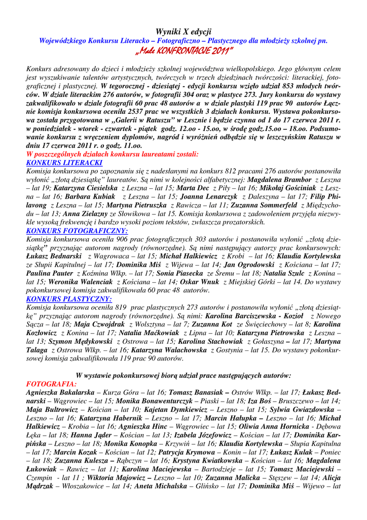 Wyniki X edycji Wojewódzkiego Konkursu Literacko – Fotograficzno – Plastycznego dla młodzieŜy szkolnej pn. „Małe KONFRONTACJE 2011” Konkurs adresowany do dzieci i młodzieŜy szkolnej województwa wielkopolskiego. Jego głównym celem jest wyszukiwanie talentów artystycznych, twórczych w trzech dziedzinach twórczości: literackiej, fotograficznej i plastycznej. W tegorocznej - dziesiątej - edycji konkursu wzięło udział 853 młodych twórców. W dziale literackim 276 autorów, w fotografii 304 oraz w plastyce 273. Jury konkursu do wystawy zakwalifikowało w dziale fotografii 60 prac 48 autorów a w dziale plastyki 119 prac 90 autorów Łącznie komisja konkursowa oceniła 2537 prac we wszystkich 3 działach konkursu. Wystawa pokonkursowa została przygotowana w „Galerii w Ratuszu” w Lesznie i będzie czynna od 1 do 17 czerwca 2011 r. w poniedziałek - wtorek - czwartek - piątek godz. 12.oo - 15.oo, w środę godz.15.oo – 18.oo. Podsumowanie konkursu z wręczeniem dyplomów, nagród i wyróŜnień odbędzie się w leszczyńskim Ratuszu w dniu 17 czerwca 2011 r. o godz. 11.oo. W poszczególnych działach konkursu laureatami zostali: KONKURS LITERACKI Komisja konkursowa po zapoznaniu się z nadesłanymi na konkurs 812 pracami 276 autorów postanowiła wyłonić „złotą dziesiątkę” laureatów. Są nimi w kolejności alfabetycznej: Magdalena Brambor z Leszna – lat 19; Katarzyna Ciesielska z Leszna – lat 15; Marta Dec z Piły – lat 16; Mikołaj Gościniak z Leszna – lat 16; Barbara Kubiak z Leszna – lat 15; Joanna Lenarczyk z Daleszyna – lat 17; Filip Philavong z Leszna – lat 15; Martyna Pietruszka z Rawicza – lat 11; Zuzanna Sommerfeld z Międzychodu – lat 13; Anna Zielazny ze Słowikowa – lat 15. Komisja konkursowa z zadowoleniem przyjęła niezwykle wysoką frekwencję i bardzo wysoki poziom tekstów, zwłaszcza prozatorskich. KONKURS FOTOGRAFICZNY: Komisja konkursowa oceniła 906 prac fotograficznych 303 autorów i postanowiła wyłonić „złotą dziesiątkę” przyznając autorom nagrody (równorzędne). Są nimi następujący autorzy prac konkursowych: Łukasz Bednarski z Wagrowaca – lat 15; Michał Halkiewicz z Krobi – lat 16; Klaudia Kortylewska ze Słupii Kapitulnej – lat 17; Dominika Miś z Wijewa – lat 14; Jan Ogrodowski z Kościana – lat 17; Paulina Pauter z Koźmina Wlkp. – lat 17; Sonia Piasecka ze Śremu – lat 18; Natalia Szulc z Konina – lat 15; Weronika Walenciak z Kościana – lat 14; Oskar Wnuk z Miejskiej Górki – lat 14. Do wystawy pokonkursowej komisja zakwalifikowała 60 prac 48 autorów. KONKURS PLASTYCZNY: Komisja konkursowa oceniła 819 prac plastycznych 273 autorów i postanowiła wyłonić „złotą dziesiątkę” przyznając autorom nagrody (równorzędne). Są nimi: Karolina Barciszewska - Kozioł z Nowego Sącza – lat 18; Maja Czwojdrak z Wolsztyna – lat 7; Zuzanna Kot ze Święciechowy – lat 8; Karolina Kozłowicz z Konina – lat 17; Natalia Maćkowiak z Lipna – lat 10; Katarzyna Pietrowska z Leszna – lat 13; Szymon Mędykowski z Ostrowa – lat 15; Karolina Stachowiak z Gołaszyna – lat 17; Martyna Talaga z Ostrowa Wlkp. – lat 16; Katarzyna Walachowska z Gostynia – lat 15. Do wystawy pokonkursowej komisja zakwalifikowała 119 prac 90 autorów. W wystawie pokonkursowej biorą udział prace następujących autorów: FOTOGRAFIA: Agnieszka Bakalarska – Kurza Góra – lat 16; Tomasz Banasiak – Ostrów Wlkp. – lat 17; Łukasz Bednarski – Wągrowiec – lat 15; Monika Bonawenturczyk – Piaski – lat 18; Iza Boś – Bruszczewo – lat 14; Maja Bultrowicz – Kościan – lat 10; Kajetan Dymkiewicz – Leszno – lat 15; Sylwia Gwiazdowska – Leszno – lat 16; Katarzyna Habernik – Leszno – lat 17; Marcin Hałupka – Leszno – lat 16; Michał Halkiewicz – Krobia – lat 16; Agnieszka Hinc – Wągrowiec – lat 15; Oliwia Anna Hornicka - Dębowa Łęka – lat 18; Hanna Jąder – Kościan – lat 13; Izabela Józefowicz – Kościan – lat 17; Dominika Karpińska – Leszno – lat 18; Monika Konopka – Krzywiń – lat 16; Klaudia Kortylewska – Słupia Kapitulna – lat 17; Marcin Kozak – Kościan – lat 12; Patrycja Krymowa – Konin – lat 17; Łukasz Kulak – Poniec – lat 18; Zuzanna Kulesza – Rąbczyn – lat 16; Krystyna Kwiatkowska – Kościan – lat 16; Magdalena Łukowiak – Rawicz – lat 11; Karolina Maciejewska – Bartodzieje – lat 15; Tomasz Maciejewski – Czempin - lat 11 ; Wiktoria Majowicz – Leszno – lat 10; Zuzanna Malicka – Stęszew – lat 14; Alicja Mądrzak – Włoszakowice – lat 14; Aneta Michalska – Glińsko – lat 17; Dominika Miś – Wijewo – lat 14; Marta Moskwa – Leszno – lat 17; Dawid Niedźwiecki – Święciechowa – lat 18; Jan Ogrodowski – Kościan – lat 17; Paulina Pauter - Koźmin Wlkp. – lat 17; Sonia Piasecka – Śrem – lat 18; Anna Ratajska – Kąkolewo – lat 16; Marta Sadowska – Ostrów Wlkp. – lat 18; Zuzanna Sobańska – Ostrów Wlkp. – lat 17; Adrianna Anna Sobkowiak – Olszewo – lat 18; Natalia Szulc – Konin – lat 15; Jakub Topolski – Kosowo – lat 17; Władysław Waleński – Ludwinowo – lat 18; Weronika Walenciak – Kościan – lat 14; Oskar Wnuk – Miejska Górka – lat 14; Igor Zajączkowski – Leszno – lat 14; Daria Zajcher – Siemowo – lat 16; Katarzyna Zalisz – Święciechowa – lat 17. PLASTYKA Aleksandra Adamiszyn – Leszno – lat 15; Antonina Adamska - Leszno – lat 10; Karolina BarciszewskaKozioł - Nowy Sącz – lat 18; Marcel Bartosz – Gostyń – lat 18; Dagna Bogusławska – Poznań – lat 16; Joanna Braszak – Czempiń – lat 15; Anna Brzezewska – Święciechowa – lat 10; Maja Czwojdrak – Wolsztyn – lat 7; Paulina Dudziak – Gołaszyn – lat 15; Marcelina Fic – Święciechowa – lat 7; Patryk Fiszer – Kąkolewo – lat 13; Natalia Fogt – Święciechowa – lat 8; Weronika Glapiak - Górka D