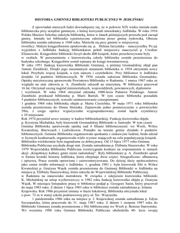 HISTORIA GMINNEJ BIBLIOTEKI PUBLICZNEJ W JEDLIŃSKU Z opowiadań starszych ludzi dowiadujemy się, Ŝe w połowie XIX wieku istniała mała biblioteczka przy urzędzie gminnym, z której korzystali mieszkańcy Jedlińska. W roku 1916 Polska Macierz Szkolna załoŜyła bibliotekę, która w latach późniejszych przeszła pod zarząd gminy. Istniała teŜ biblioteka syjonistyczna załoŜona przez gminę Ŝydowską. Obecna biblioteka została załoŜona w 1948 roku. Mieściła się przy gminie w miejscowej świetlicy. Małym księgozbiorem opiekowała się p. Helena Jarzyńska – nauczycielka. Po jej wyjeździe z Jedlińska funkcję bibliotekarza pełnił miejscowy nauczyciel p. Czesław ElŜanowski. Księgozbiór biblioteki liczył około 400 ksiąŜek, które przechowywane były w szafach. W porozumieniu z kierowniczką szkoły biblioteka została przeniesiona do budynku szkolnego. Księgozbiór został wpisany do księgi inwentarzowej. W roku 1951 funkcję kierownika Biblioteki Gminnej, a później Gromadzkiej objął pan Antoni Ziembicki. Dzięki jego nieustannym staraniom biblioteka w 1954 otrzymała nowy lokal. Przybyło więcej ksiąŜek, a tym samym i czytelników. Przy bibliotece w Jedlińsku działało 14 punktów bibliotecznych. W 1956 została załoŜona Biblioteka Gromadzka. Opiekę merytoryczną sprawowała Powiatowa Biblioteka w Radomiu. 1 marca 1967 roku ze względu na stan zdrowia p. A. Ziembicki odszedł na emeryturę. W bibliotece pracował 16 lat. Otrzymał szereg nagród ministerialnych, wojewódzkich, powiatowych, dyplomów i wyróŜnień. W roku 1964 otrzymał odznakę 1000-lecia Państwa Polskiego. Antoni Ziembicki przekazał bibliotekę p. Marii Bartuli. W tym czasie biblioteka posiadała 5 punktów bibliotecznych, wzrosło zainteresowanie czasopismami. 1 grudnia 1968 roku bibliotekę objęła p. Marta Ciesielska. W maju 1971 roku biblioteka została przeniesiona do Domu StraŜaka. Zajmowała jedno pomieszczenie o powierzchni 39m, z czego oprócz wypoŜyczalni wygospodarowany został kącik czytelniczy z 10 miejscami. Rok 1974 przyniósł nowe zmiany w kadrze bibliotekarskiej. Funkcję kierownika objęła p. Krystyna Michalska, były kierownik Gromadzkiej Biblioteki w Jastrzębi. W tym czasie Gminna Biblioteka sprawowała opiekę nad 4 filiami bibliotecznymi: we Wsoli, Wólce Kwateckiej, Bierwcach i Ludwikowie. Ponadto na terenie gminy działało 6 punktów bibliotecznych. Gminna Biblioteka organizowała spotkania z ciekawymi ludźmi, brała udział w licznych konkursach, organizowała wiele wystaw mających na celu popularyzację ksiąŜek. Biblioteka wielokrotnie była nagradzana za dobrą pracę. Od 15 lipca 1977 roku Gminna Biblioteka Publiczna uzyskała drugi etat. Została zatrudniona p. ElŜbieta Staszewska. W roku 1979 Wojewódzka Biblioteka Publiczna rozstrzygnęła konkurs na wspomnienia w ramach akcji ,,Krajobrazy kultury gmin ziemi radomskiej”. Były bibliotekarz p. A. Ziembicki spisał w formie kroniki historię Jedlińska, która obejmuje dwie części: fotograficzno- albumową i opisową. Praca została oprawiona i zainwentaryzowana. Do dzisiaj słuŜy społeczeństwu jako cenne źródło informacji o Jedlińsku. 1. grudnia 1981 r. była kierownik filii w Wólce Kwateckiej p. GraŜyna Wąsik została przeniesiona do Gminnej Biblioteki w Jedlińsku na miejsce p. ElŜbiety Staszewskiej, która odeszła do Wojewódzkiej Biblioteki Publicznej w Radomiu na stanowisko instruktora. W związku z odejściem kierownika biblioteki K. Michalskiej na urlop wychowawczy w 1982 roku funkcję kierownika objęła p. GraŜyna Wąsik. W miesiącu listopadzie pracę w bibliotece podjął p. Grzegorz Sasin, który pracował do maja 1983 roku. Z dniem 1 lipca 1983 roku w bibliotece została zatrudniona p. Jolanta Krajewska. Rok 1986 przyniósł zmiany w bazie lokalowej. Biblioteka otrzymała lokal o pow. 72 m w starej szkole podstawowej przy ul. Św. Wojciecha. 1 października 1986 roku na miejsce p. J. Krajewskiej została zatrudniona p. Edyta Szczepańska, która pracowała do 31. maja 1987 roku. Z dniem 1 sierpnia 1987 roku do Biblioteki Gminnej została przeniesiona z filii bibliotecznej we Wsoli p. BoŜena Starzyńska. We wrześniu 1988 roku Gminna Biblioteka Publiczna obchodziła 40- lecie swojej działalności. Na uroczyste spotkanie przybyły władze wojewódzkie, miejscowe, pracownicy biblioteki oraz mieszkańcy gminy. Z okazji jubileuszu biblioteka otrzymała wiele nagród, dyplomów. Został wydany okolicznościowy exlibris. Rok 1990 nie był korzystny dla biblioteki. W sierpniu przeniosła się do dwóch sal w tym samym budynku, ale o zmniejszonej powierzchni. Powodem tej decyzji było zasiedlenie części budynku młodzieŜą ze Szkoły Podstawowej w Jedlance. Jedyną zaletą było to, Ŝe nowe pomieszczenia zostały umalowane i odnowione.29sierpnia 1990r. Komisja do Spraw Kultury, Oświaty i Spraw Społecznych przy Urzędzie Gminy zdecydowała o zaprzestaniu działalności punktów bibliotecznych na terenie gminy Jedlińsk, motywując brakiem pieniędzy. W 1991r. zapadły decyzje władz gminy o likwidacji etatów w bibliotekach. 31 grudnia 1997r. przestają działać filie biblioteczne w Bierwcach i Ludwikowie. Księgozbiory tych bibliotek częściowo przejęła biblioteka gminna, a pozostałe zostały przekazane do miejscowych szkół i świetlicy. W maju 1999r. biblioteka przeniosła się do wyremontowanych pomieszczeń po Urzędzie Gminy przy ul.Krótkiej 1. Zajęła powierzchnię 157m.Pomieszczenia są widne, ciepłe, przestronne. Wydzielona jest czytelnia z 16 miejscami, wypoŜyczalnia, pokój dyrektora, dział gromadzenia i opracowania, magazyn, toalety i hol z czytelnią prasy. W 2001r. po raz pierwszy Ministerstwo Kultury przekazało 2,800zł na zakup ksiąŜek dla biblioteki. W tym samym roku została zlikwidowana filia biblioteczna we Wsoli. W miesiącu wrześniu 2003 roku w bibliotece nastąpiła wymiana okien, a cały budynek otrzymał nową el