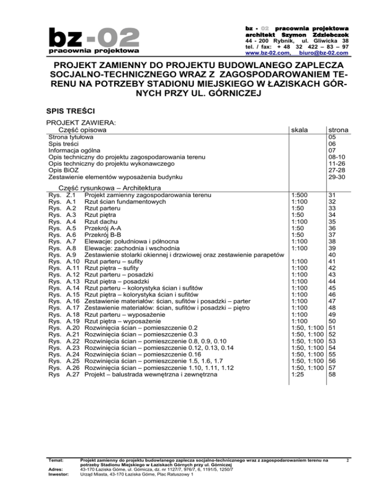 bz - 02 pracownia projektowa architekt Szymon Zdziebczok 44 - 200 Rybnik, ul. Gliwicka 38 tel. / fax: + 48 32 422 – 83 – 97 www.bz-02.com, [email protected] PROJEKT ZAMIENNY DO PROJEKTU BUDOWLANEGO ZAPLECZA SOCJALNO-TECHNICZNEGO WRAZ Z ZAGOSPODAROWANIEM TERENU NA POTRZEBY STADIONU MIEJSKIEGO W ŁAZISKACH GÓRNYCH PRZY UL. GÓRNICZEJ SPIS TREŚCI PROJEKT ZAWIERA: Część opisowa skala Strona tytułowa Spis treści Informacja ogólna Opis techniczny do projektu zagospodarowania terenu Opis techniczny do projektu wykonawczego Opis BiOZ Zestawienie elementów wyposażenia budynku strona 05 06 07 08-10 11-26 27-28 29-30 Część rysunkowa – Architektura Rys. Rys. Rys. Rys. Rys. Rys. Rys. Rys. Rys. Rys. Rys. Rys. Rys. Rys. Rys. Rys. Rys. Rys. Rys. Rys. Rys. Rys. Rys. Rys. Rys. Rys. Rys. Rys Z.1 A.1 A.2 A.3 A.4 A.5 A.6 A.7 A.8 A.9 A.10 A.11 A.12 A.13 A.14 A.15 A.16 A.17 A.18 A.19 A.20 A.21 A.22 A.23 A.24 A.25 A.26 A.27 Temat: Adres: Inwestor: Projekt zamienny zagospodarowania terenu Rzut ścian fundamentowych Rzut parteru Rzut piętra Rzut dachu Przekrój A-A Przekrój B-B Elewacje: południowa i północna Elewacje: zachodnia i wschodnia Zestawienie stolarki okiennej i drzwiowej oraz zestawienie parapetów Rzut parteru – sufity Rzut piętra – sufity Rzut parteru – posadzki Rzut piętra – posadzki Rzut parteru – kolorystyka ścian i sufitów Rzut piętra – kolorystyka ścian i sufitów Zestawienie materiałów: ścian, sufitów i posadzki – parter Zestawienie materiałów: ścian, sufitów i posadzki – piętro Rzut parteru – wyposażenie Rzut piętra – wyposażenie Rozwinięcia ścian – pomieszczenie 0.2 Rozwinięcia ścian – pomieszczenie 0.3 Rozwinięcia ścian – pomieszczenie 0.8, 0.9, 0.10 Rozwinięcia ścian – pomieszczenie 0.12, 0.13, 0.14 Rozwinięcia ścian – pomieszczenie 0.16 Rozwinięcia ścian – pomieszczenie 1.5, 1.6, 1.7 Rozwinięcia ścian – pomieszczenie 1.10, 1.11, 1.12 Projekt – balustrada wewnętrzna i zewnętrzna 1:500 1:100 1:50 1:50 1:100 1:50 1:50 1:100 1:100 1:100 1:100 1:100 1:100 1:100 1:100 1:100 1:100 1:100 1:100 1:50, 1:100 1:50, 1:100 1:50, 1:100 1:50, 1:100 1:50, 1:100 1:50, 1:100 1:50, 1:100 1:25 Projekt zamienny do projektu budowlanego zaplecza socjalno-technicznego wraz z zagospodarowaniem terenu na potrzeby Stadionu Miejskiego w Łaziskach Górnych przy ul. Górniczej 43-170 Łaziska Górne, ul. Górnicza, dz. nr 1127/7, 976/7, 6, 1191/5, 1250/7 Urząd Miasta, 43-170 Łaziska Górne, Plac Ratuszowy 1 31 32 33 34 35 36 37 38 39 40 41 42 43 44 45 46 47 48 49 50 51 52 53 54 55 56 57 58 2 bz - 02 pracownia projektowa architekt Szymon Zdziebczok 44 - 200 Rybnik, ul. Gliwicka 38 tel. / fax: + 48 32 422 – 83 – 97 www.bz-02.com, [email protected] INFORMACJA OGÓLNA 1. DANE OGÓLNE Opis techniczny został sporządzony wg. Rozporządzenia Ministra Spraw Wewnętrznych i Administracji z dn. 03.07.2003r w sprawie szczegółowego zakresu i formy projektu budowlanego. 1.1. Podstawa opracowania umowa WIM/02/2010 zawarta z inwestorem, decyzja nr 103/2009 wydana przez Starostę Mikołowskiego zatwierdzająca projekt budowlany i udzielająca pozwolenia na Budowę zaplecza socjalno-technicznego wraz z zagospodarowaniem terenu na potrzeby Stadionu Miejskiego w Łaziskach Górnych przy ul.Górniczej w zakresie pawilonu zaplecza sportowego, budynku WC kibiców, dróg, ukształtowania terenu, małej architektury i zieleni (działki nr: 1127/7, 976/7, 6, 1191/5, 1250/7), kat. V, wytyczne określone przez Inwestora, pozytywne uzgodnienie koncepcji przez Inwestora, dodatkowe ustalenia z Inwestorem określone na osobnych spotkaniach potwierdzonych protokołem oraz ustalenia mailowe i telefoniczne, opinia lokalizacyjna wydana na podstawie obowiązującego miejscowego planu zagospodarowania przestrzennego rejonu ŁAZISKA GÓRNE Z KĄTAMI i MOKREM w Łaziskach Górnych, zatwierdzonego uchwałą Rady Miejskiej w Łaziskach Górnych nr XLV/315/2001 z dnia 11 grudnia 2001r. (Dziennik Urzędowy Województwa Śląskiego nr 3 poz. 125 z 2002r.), projekt podstawowy, szkic orientacyjny, wyrys z mapy zasadniczej, wypis z rejestru gruntów, mapa zasadnicza do celów projektowych, podkłady geodezyjno-wysokościowe, obowiązujące normy i przepisy prawa budowlanego, 1.2. Temat i zakres opracowania „Projekt zamienny do projektu budowlanego zaplecza socjalno-technicznego wraz z zagospodarowaniem terenu na potrzeby Stadionu Miejskiego w Łaziskach Górnych przy ul.Górniczej”. Zakres opracowania obejmuje projekty wykonawcze następujących branż: − architektonicznej: zagospodarowanie terenu i budynek, − konstrukcyjnej, − instalacji sanitarnych: wentylacja, użytkowa woda ciepła i zimna, ogrzewanie, kotłownia olejowa − instalacji elektrycznych: oświetlenie wewnętrzne i ewakuacyjne, instalacja odgromowa, sieć komputerowa i telefoniczna, alarmowa. Temat: Adres: Inwestor: Projekt zamienny do projektu budowlanego zaplecza socjalno-technicznego wraz z zagospodarowaniem terenu na potrzeby Stadionu Miejskiego w Łaziskach Górnych przy ul. Górniczej 43-170 Łaziska Górne, ul. Górnicza, dz. nr 1127/7, 976/7, 6, 1191/5, 1250/7 Urząd Miasta, 43-170 Łaziska Górne, Plac Ratuszowy 1 3 bz - 02 pracownia projektowa architekt Szymon Zdziebczok 44 - 200 Rybnik, ul. Gliwicka 38 tel. / fax: + 48 32 422 – 83 – 97 www.bz-02.com, [email protected] OPIS TECHICZNY DO PROJEKTU ZAGOSPODAROWANIA TERENU 1. PRZEDMIOT i ZAKRES OPRACOWANIA 1.1. Przedmiot opracowania Przedmiotem opracowania jest projekt zamienny do projektu zagospodarowania terenu dla zaplecza socjalno-technicznego na potrzeby Stadionu Miejskiego w Łaziskach Górnych zlokalizowanego w Łaziskach Górnych przy ul. Górniczej na działkach nr 1127/7, 976/7, 6, 1191/5, 1250/7. 1.2. Zakres opracowania Projekt zamienny zagospodarowania działki obejmuje opracowanie terenu bezpośrednio przyległego do projektowanego budynku zaplecza sportowego na działce nr 1127/7. Zagospodarowanie terenu, poza zazn